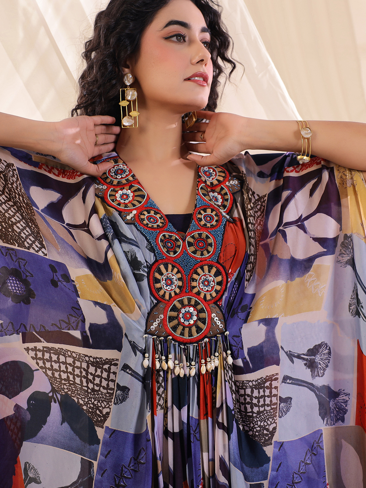 Flowy and stylish purple georgette silk kurti showcases a relaxed kaftan style with an eye catching printed pattern. Adorned with thread, beads, sequins and cowrie shell detailing, it features a flattering V neckline. Perfect for festive gatherings and party wear, it ensures comfort with elegance.