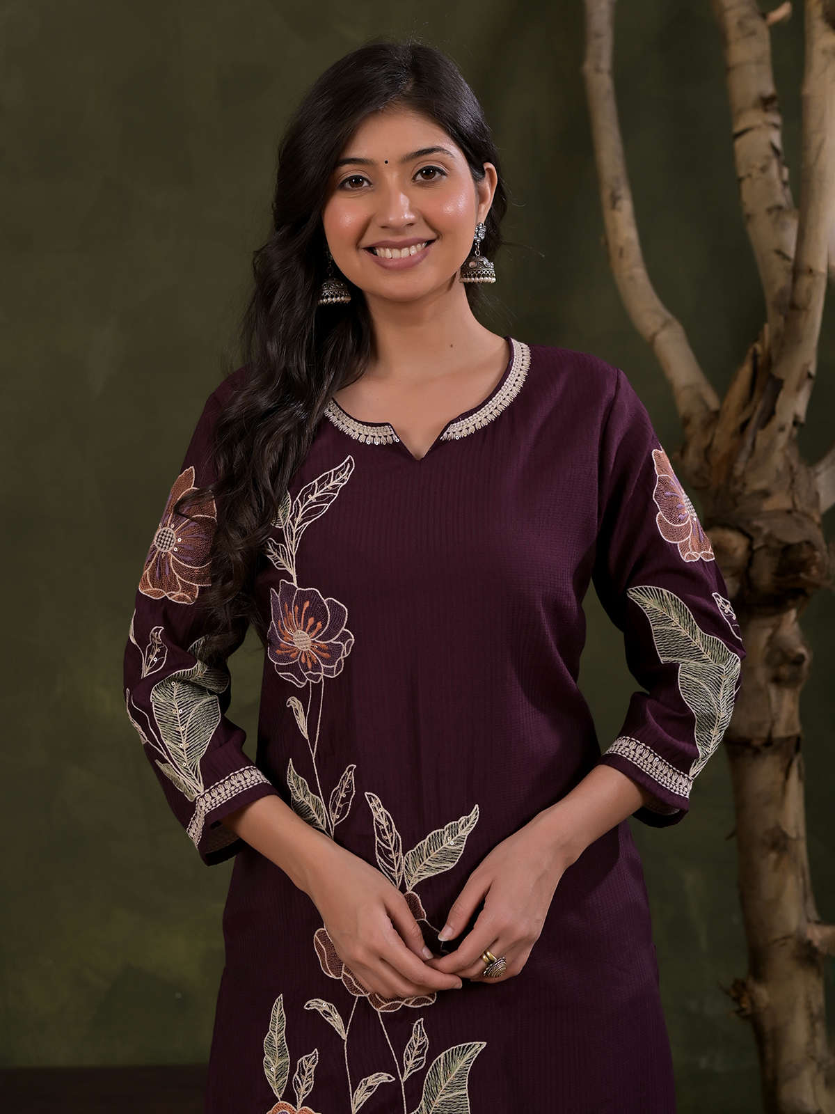 Royal purple hues bring graceful charm to this silk kurti designed for effortless casual wear. Enhanced with fine embroidery, it reflects understated elegance. The sweetheart neckline and quarter sleeves add a soft feminine touch. Styled in a straight cut silhouette, this kurti is perfect for relaxed outings and everyday ethnic fashion.