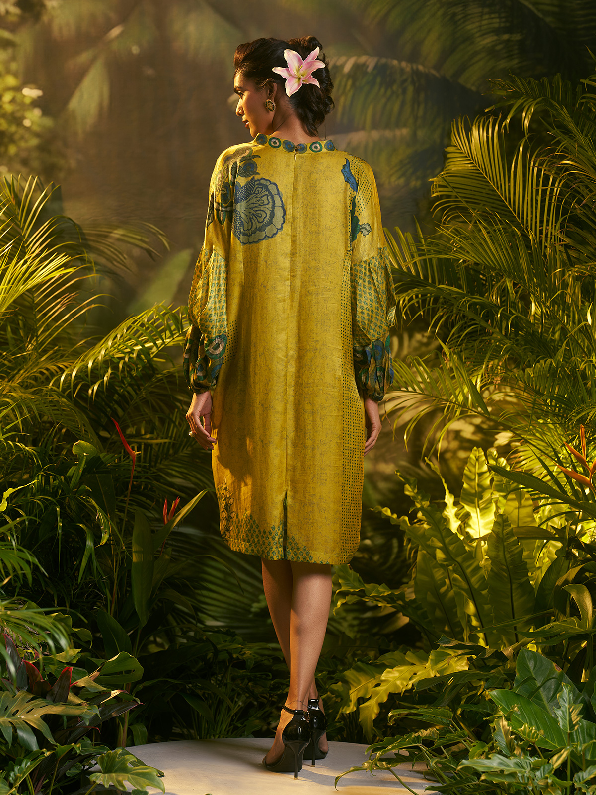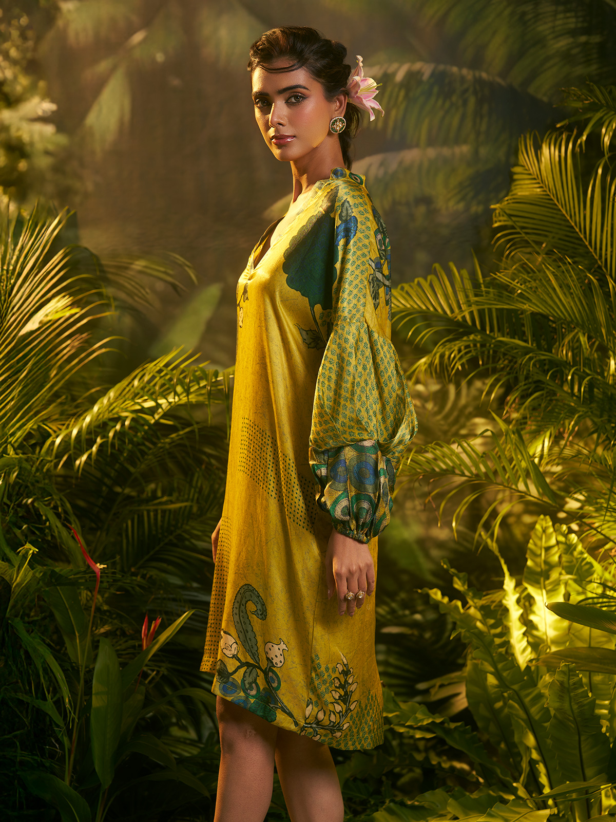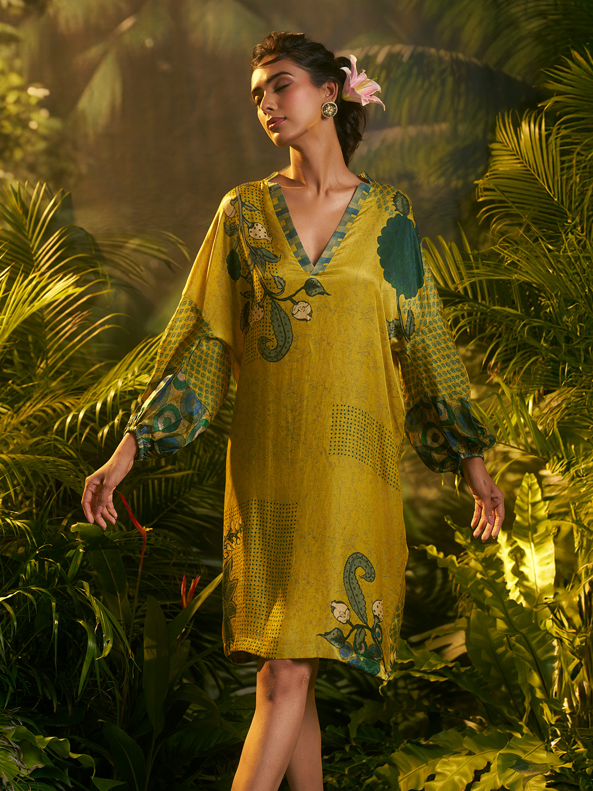 Golden dawn awakens in this lime yellow crepe silk kurti, crafted with soft prints that echo freshness. The V-neckline paired with quarter sleeves offers a refined balance of comfort and style, perfect for casual gatherings and serene everyday elegance.