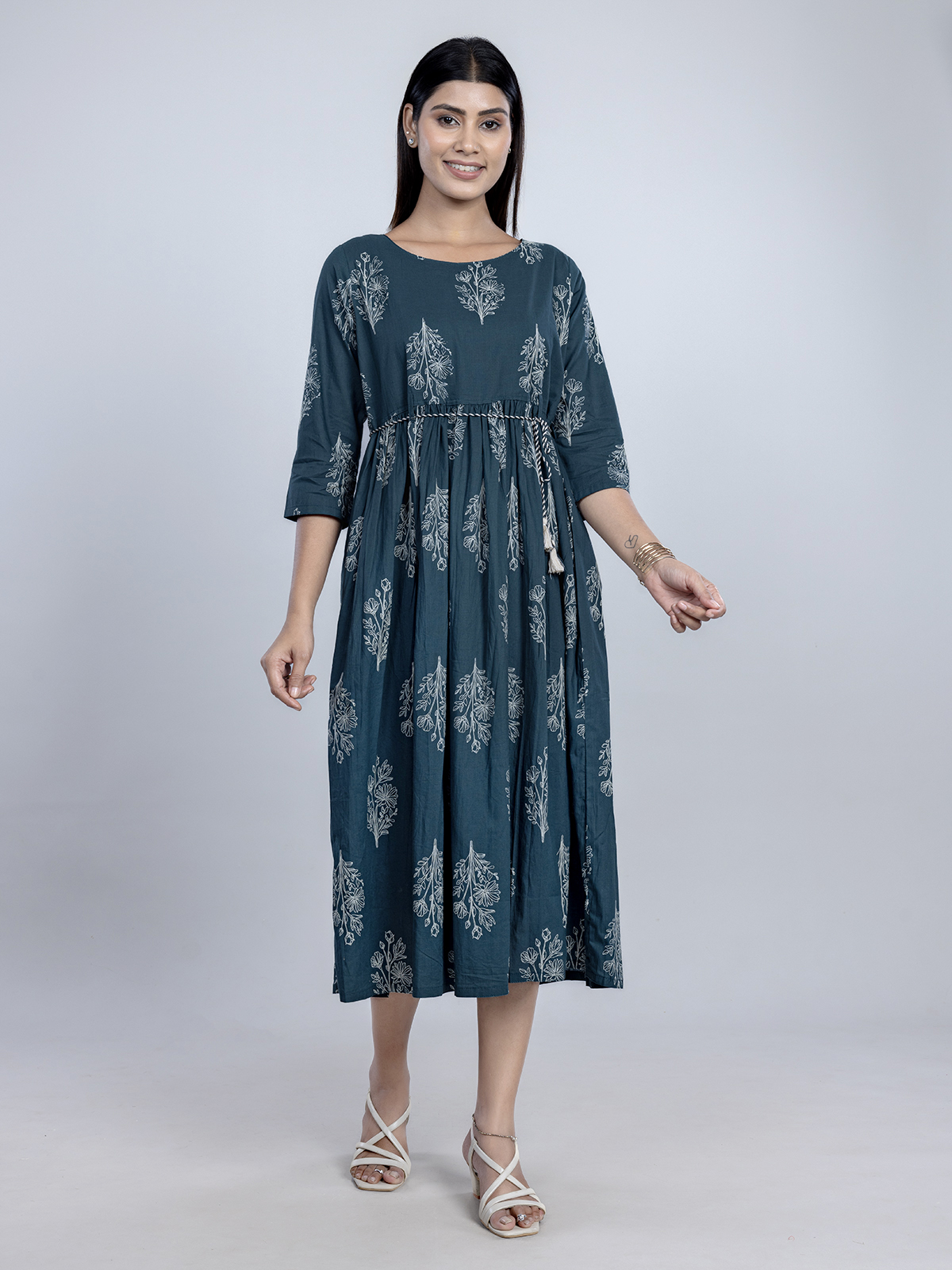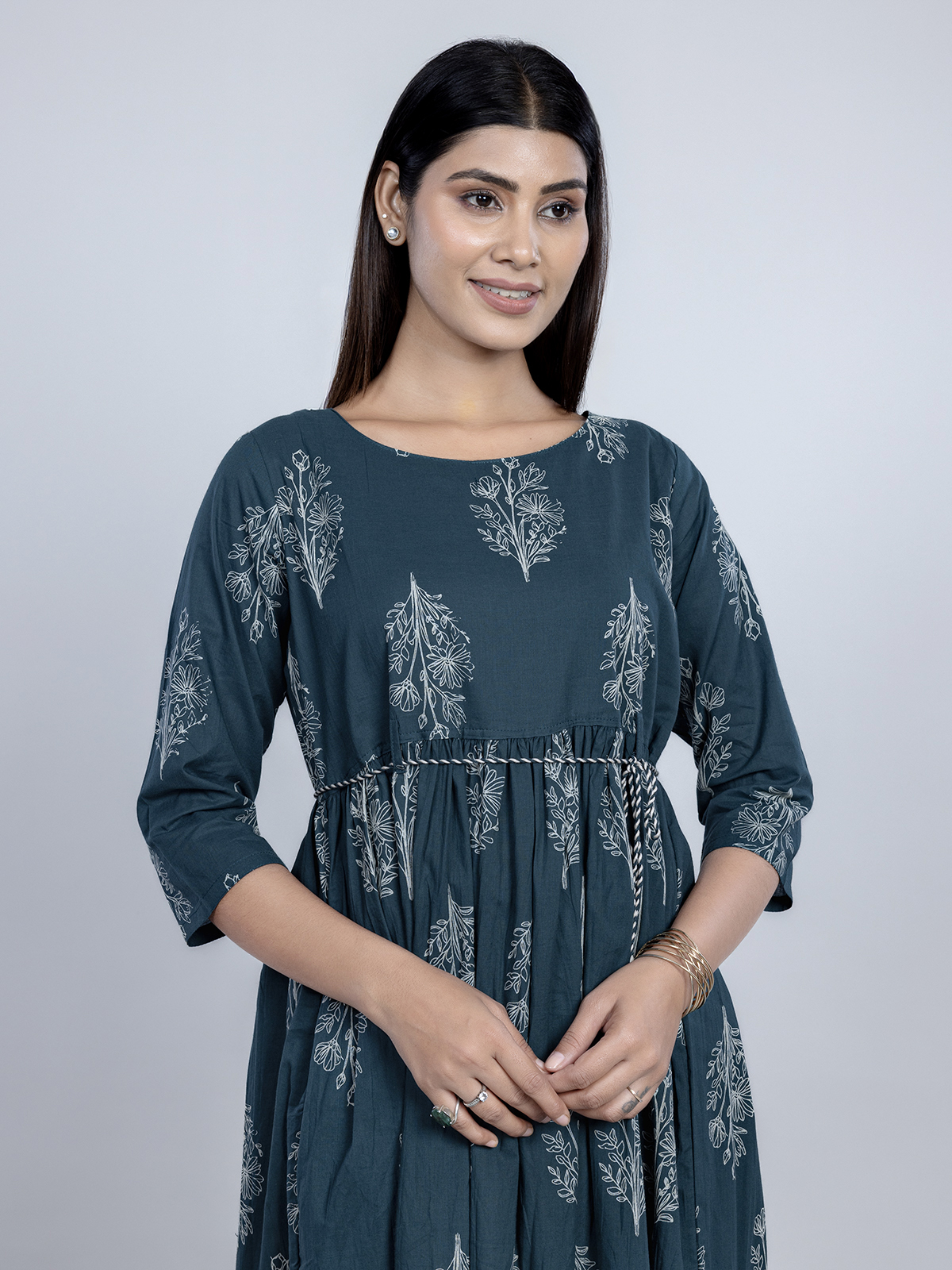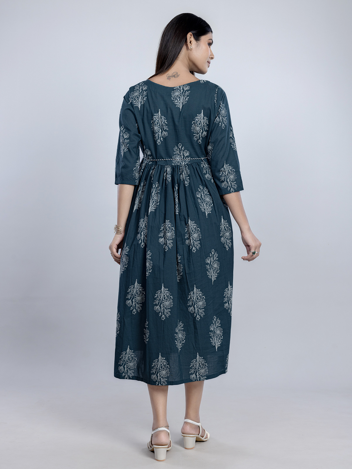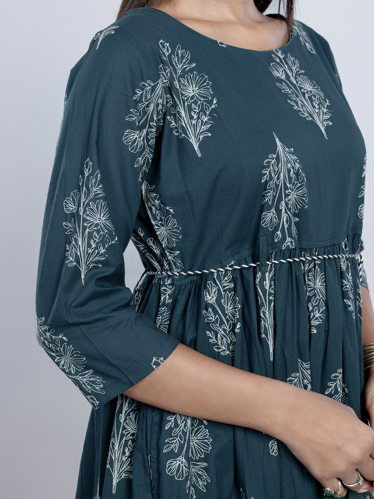 A rama blue cotton printed kurti featuring a round neckline and quarter sleeves. Cheerful and breathable, it brightens everyday wear with its soft charm, pairing well with leggings or jeans.