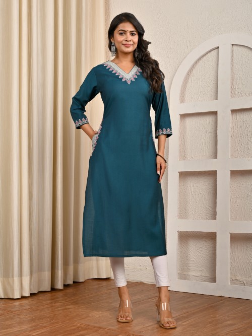 Fresh and charming, this rama blue cotton silk kurti is enhanced with elegant embroidery and sequins. Styled with a V-neckline and quarter sleeves, it blends modern ease with ethnic appeal. Perfect for casual settings, it adds an understated sparkle to daily dressing.