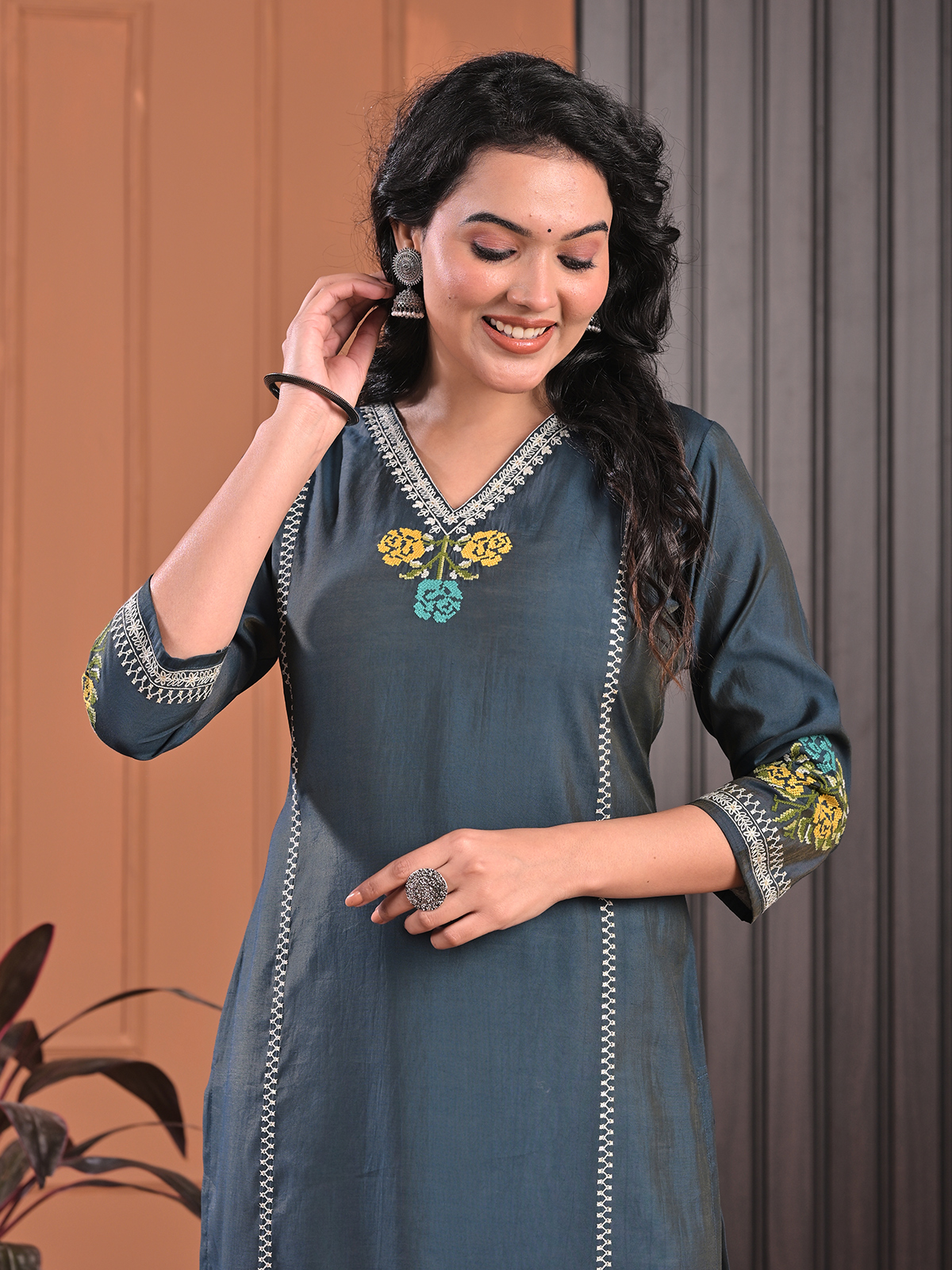 Elegant and calming rama blue silk kurti. Features fine embroidery that enhances its refined look. Styled with a V neckline and quarter sleeves, it offers breathable comfort and effortless sophistication for casual daytime wear.