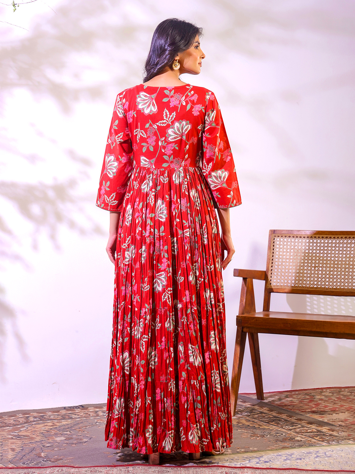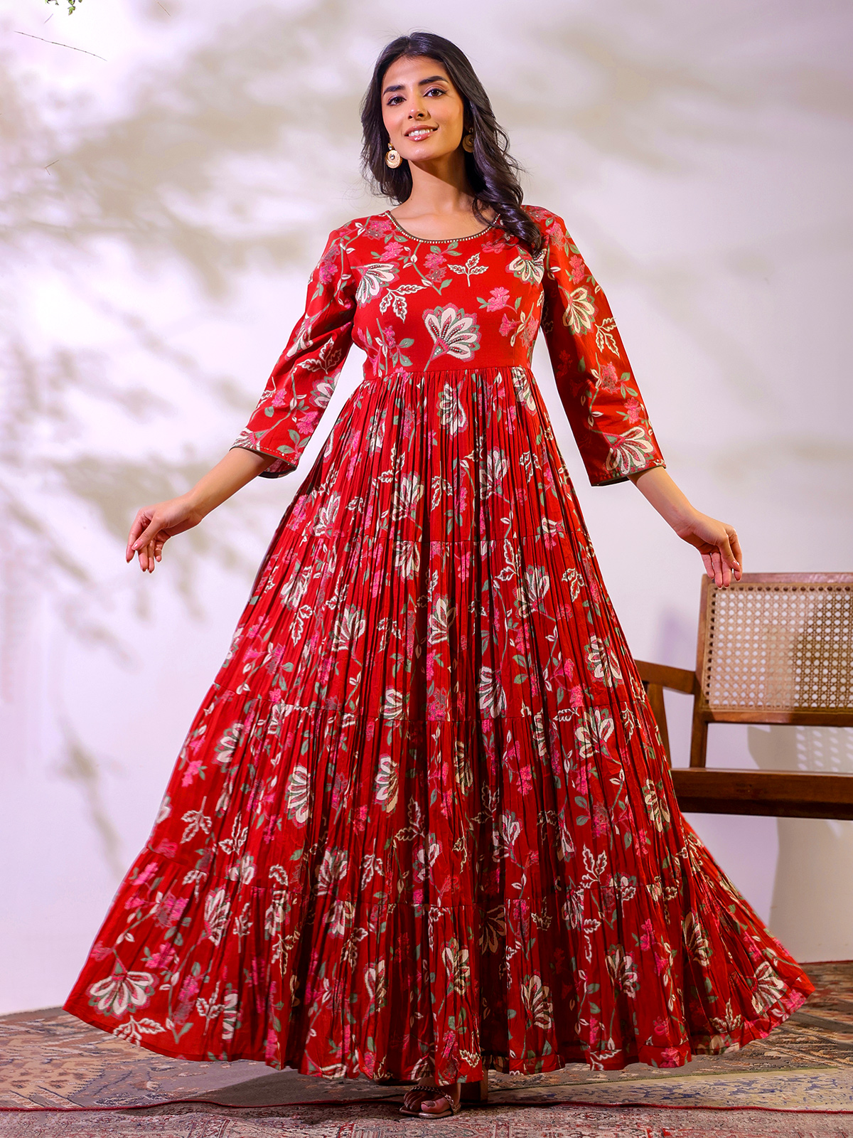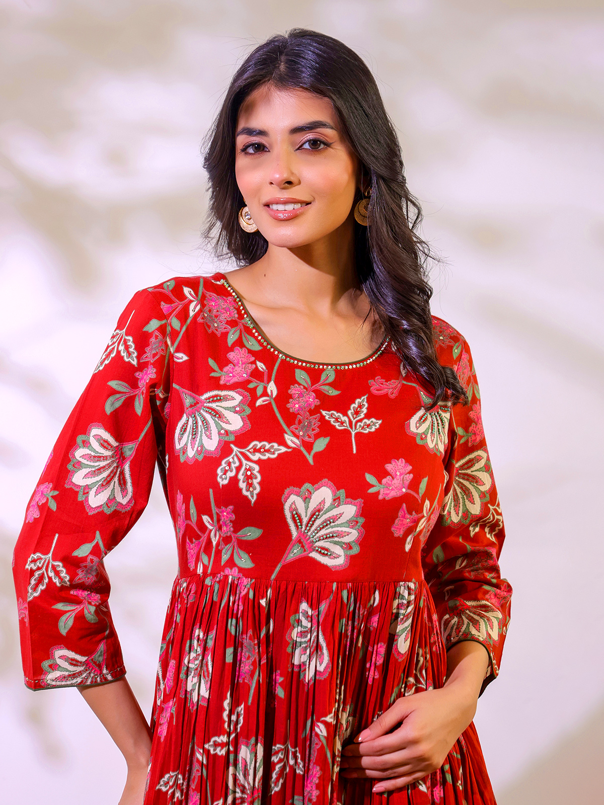 Elevating your feminine grace, this red cotton floor-length kurti reflects bold and festive charm. Crafted with a round neckline and quarter sleeves, it is adorned with printed patterns along with sequins and bead detailing. Perfect for casual and festive occasions, it creates a striking yet elegant appearance.