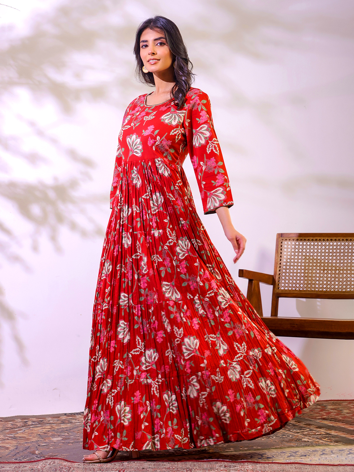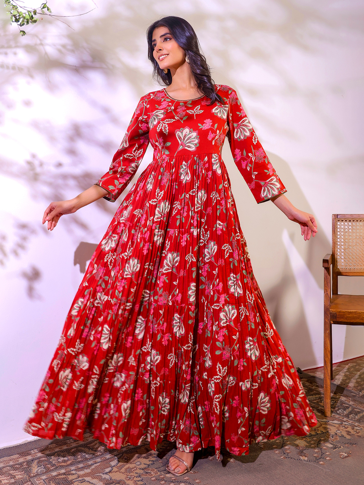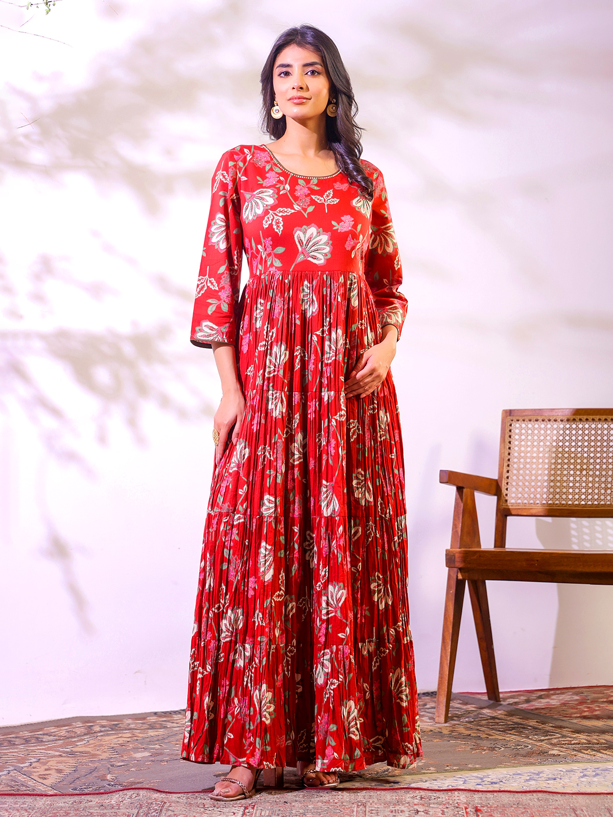 Elevating your feminine grace, this red cotton floor-length kurti reflects bold and festive charm. Crafted with a round neckline and quarter sleeves, it is adorned with printed patterns along with sequins and bead detailing. Perfect for casual and festive occasions, it creates a striking yet elegant appearance.