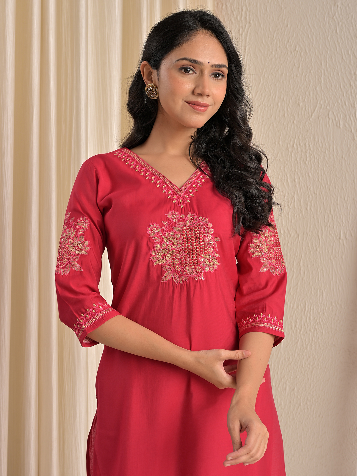 This red silk kurti is highlighted with tasteful embroidery and subtle sequin accents for a hint of shine. Designed with a flattering V neckline and quarter sleeves, it balances casual comfort with understated glamour, making it perfect for elegant everyday wear.