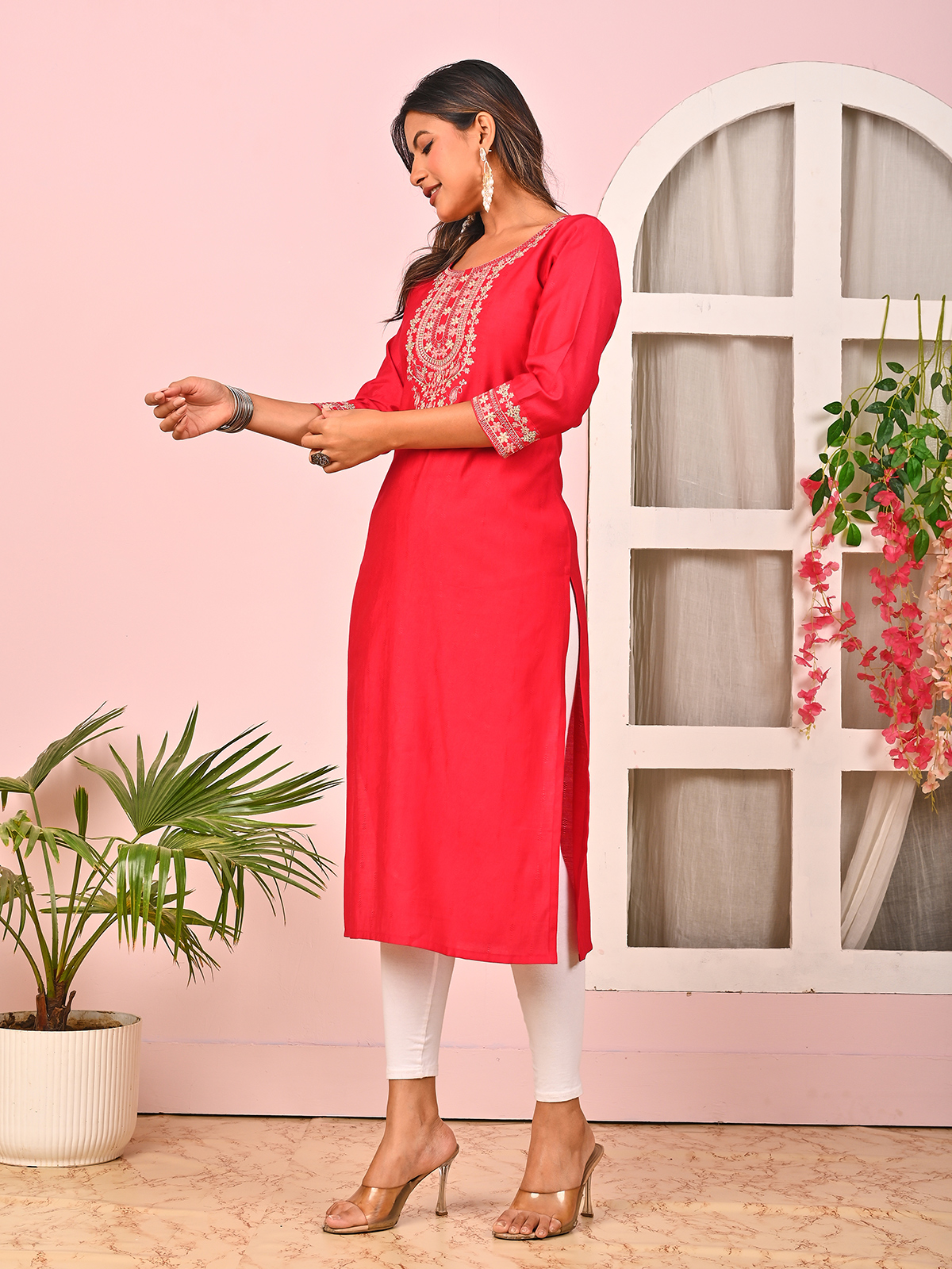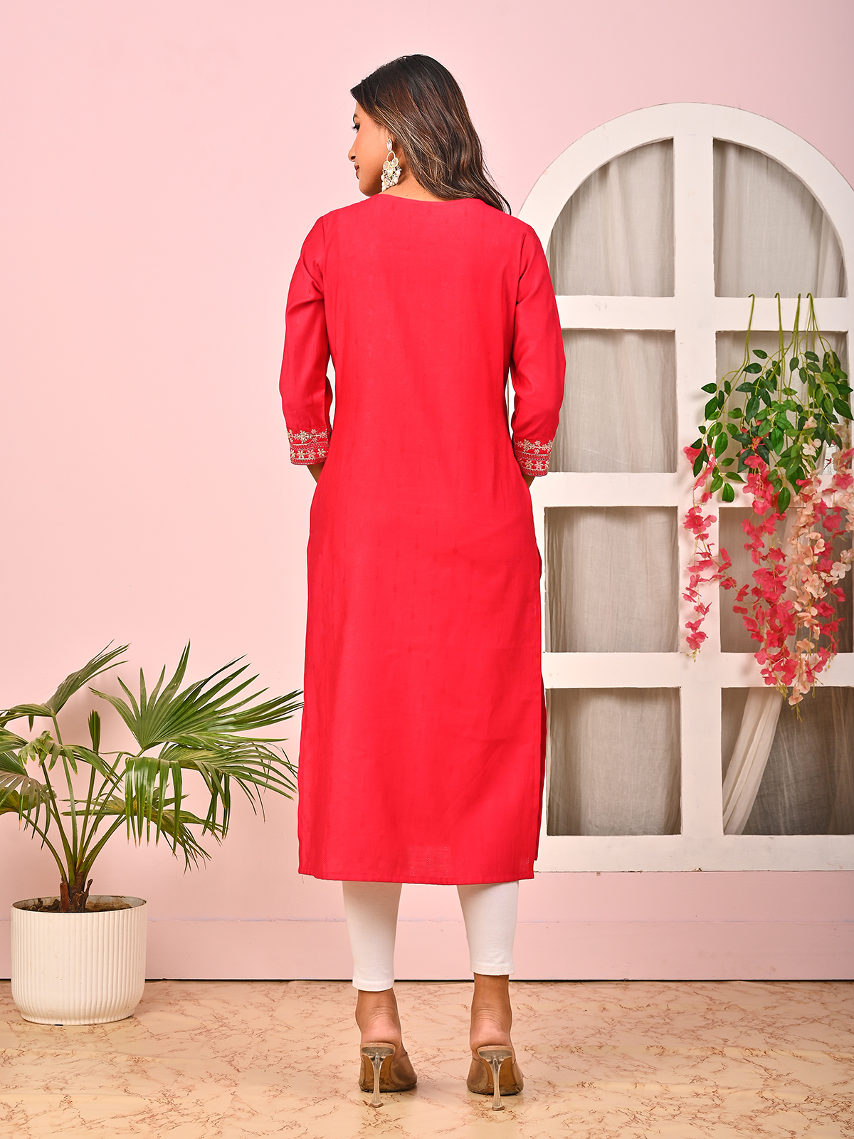 Vibrant in red silk, this kurti showcases sequins, embroidery, and zari detailing. Styled with a round neckline and quarter sleeves, it is a graceful option for casual gatherings, combining bold color with traditional craftsmanship for an eye-catching ethnic look.