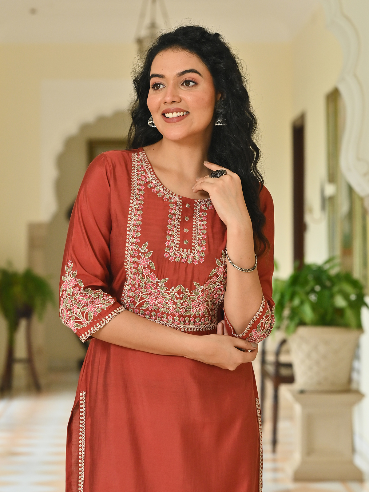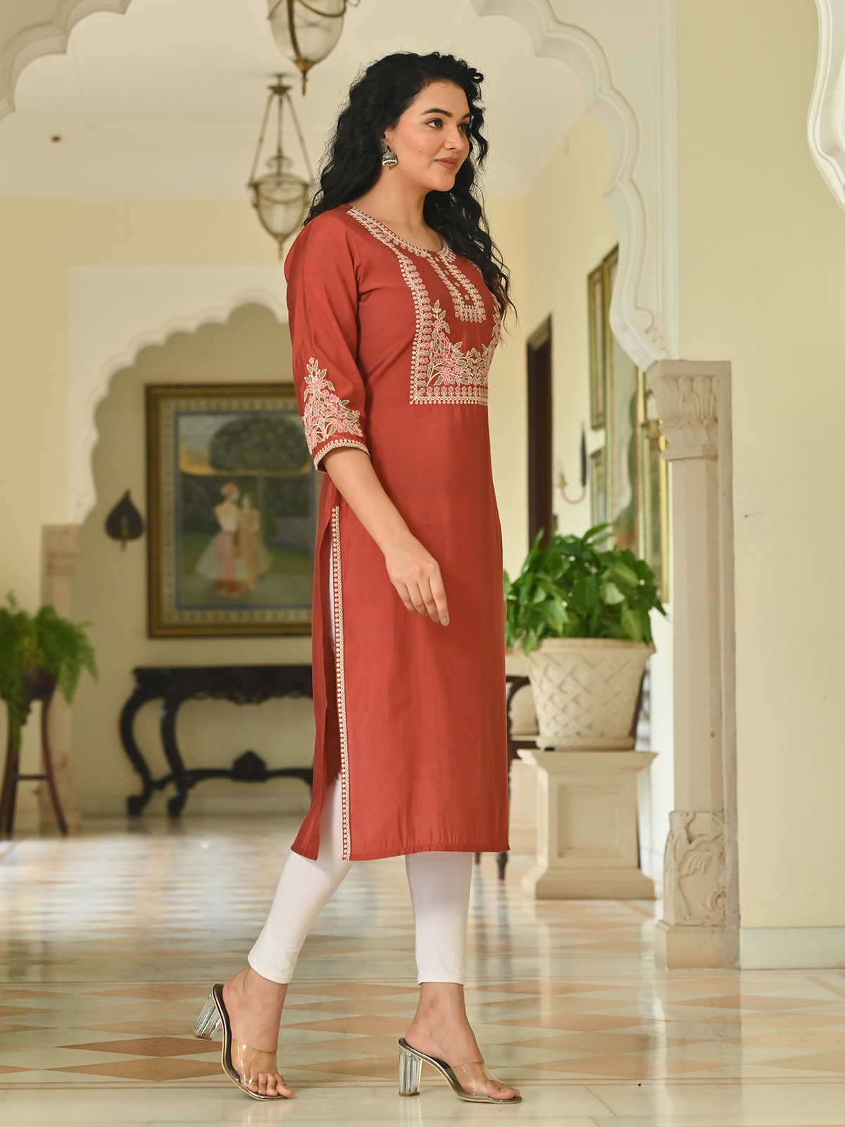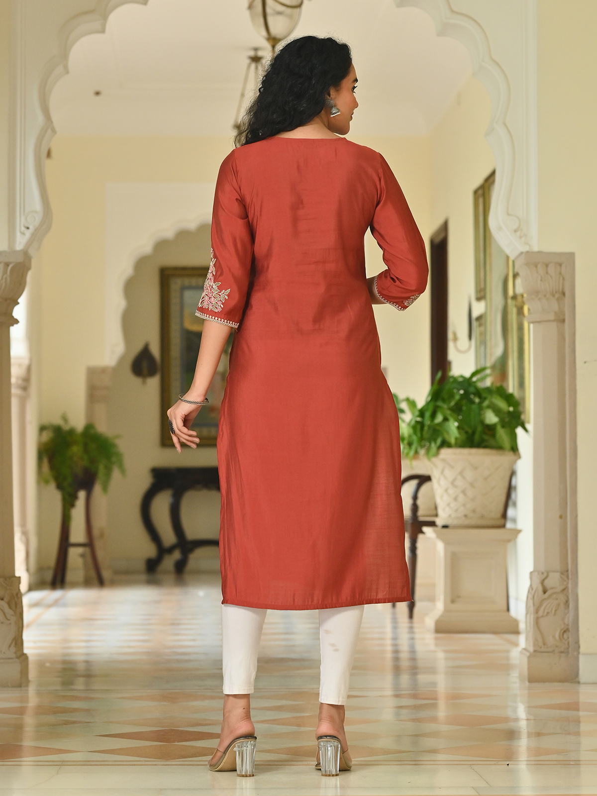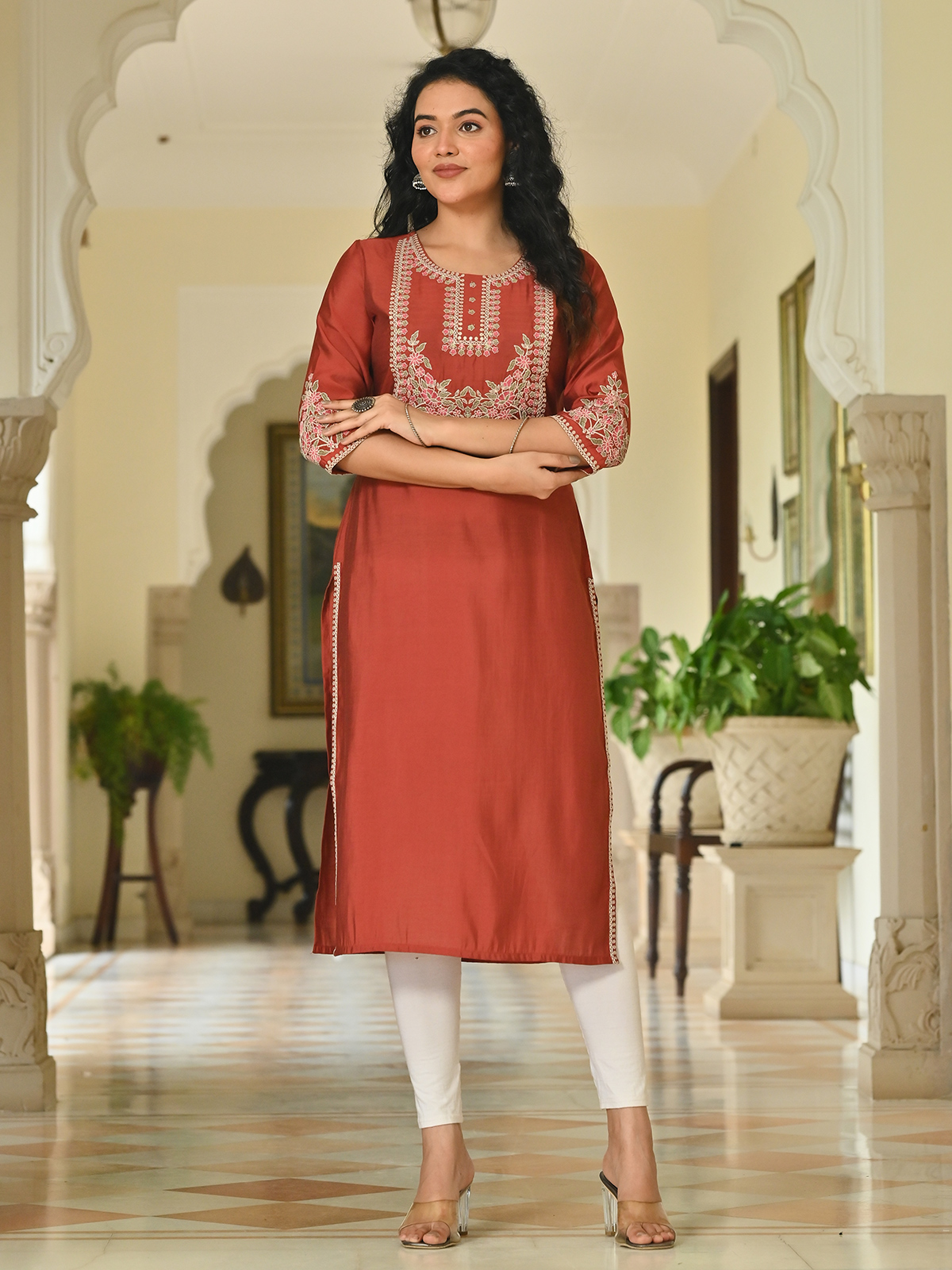 Crafted from rust cotton silk, this kurti is adorned with thread, embroidery, and sequins accents. Styled with a round neckline and quarter sleeves, it is perfect for casual outings, bringing together simple sophistication and graceful detailing for a chic ethnic look.