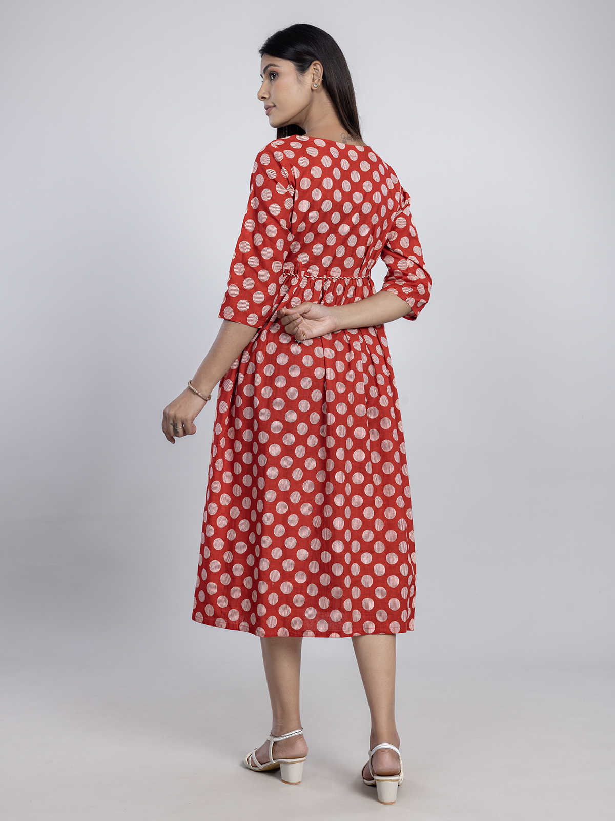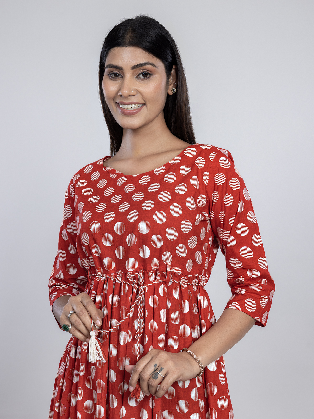 A rest red cotton printed kurti styled with a round neckline and quarter sleeves. Gentle and breezy, it brings subtle grace to casual days, pairing beautifully with leggings or neutral pants.