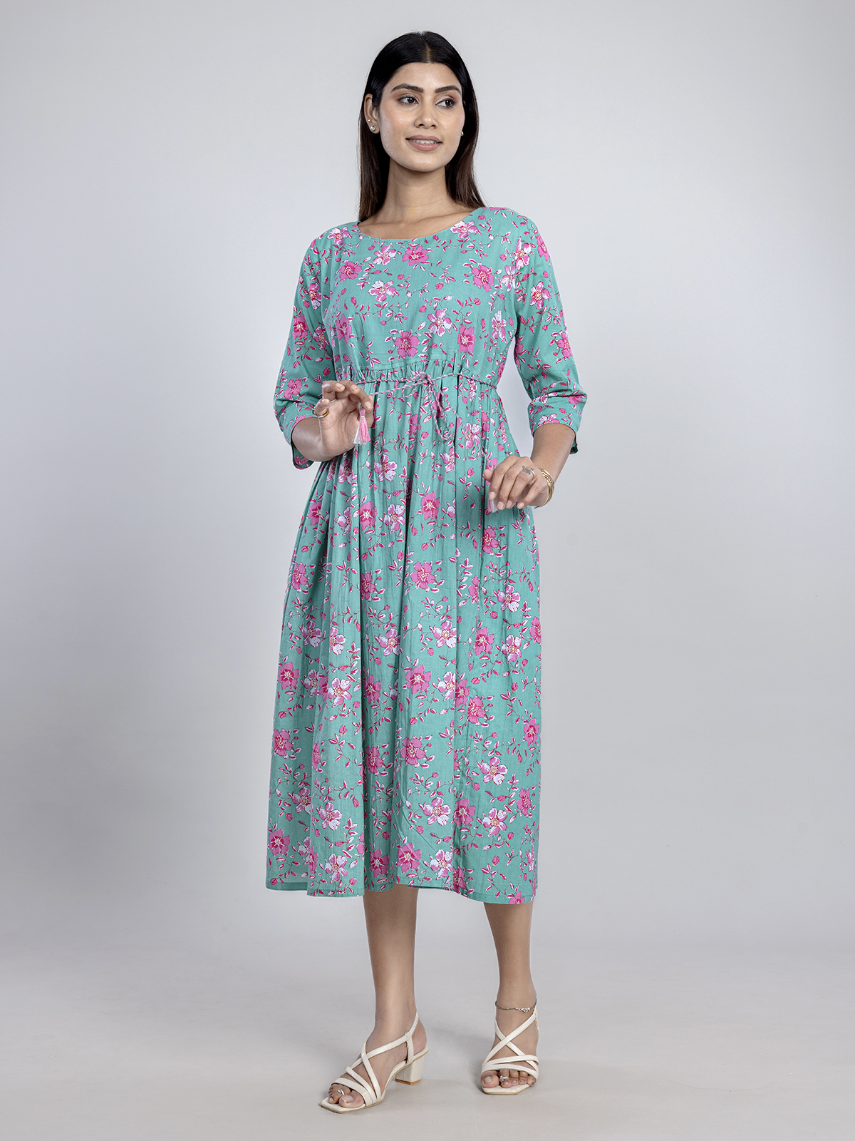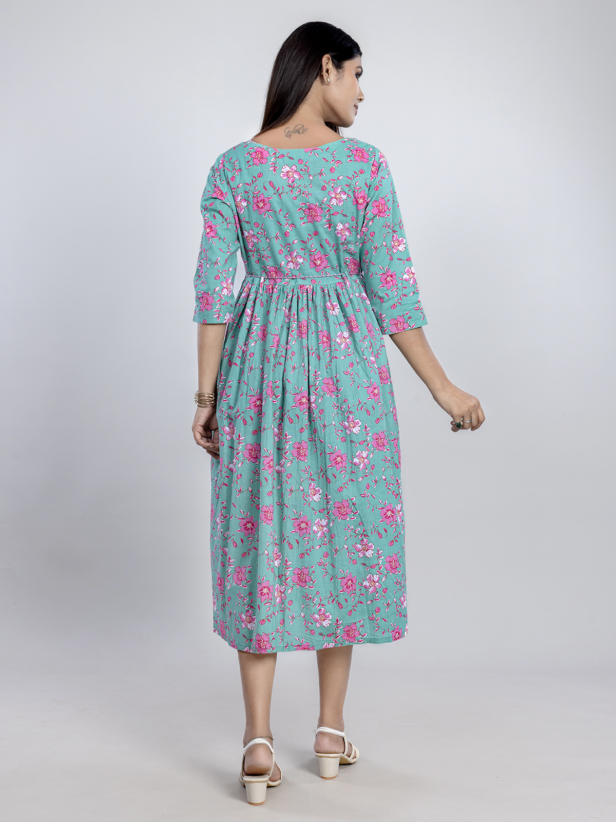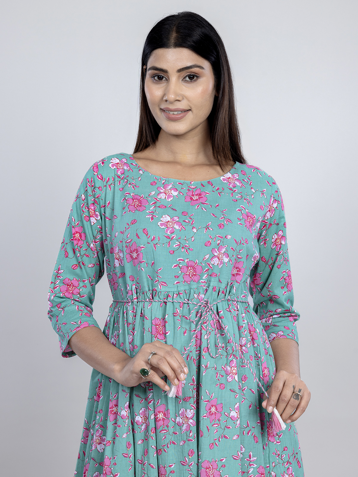 This sage green cotton printed kurti designed with a round neckline and quarter sleeves adds soft femininity to casual wear. The soothing shade blends modern simplicity with comfort, perfect for relaxed daily dressing.