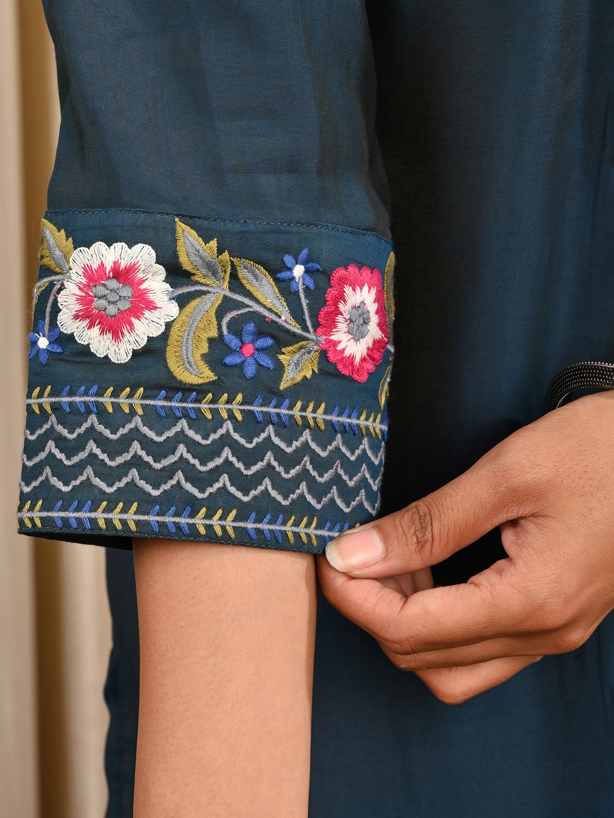 Stone Blue Cotton Silk Embroidered Casual Kurti