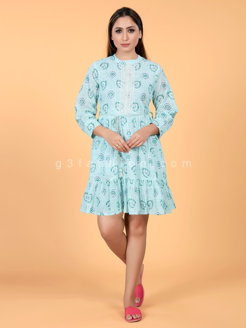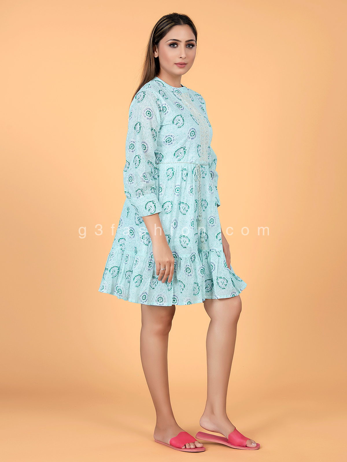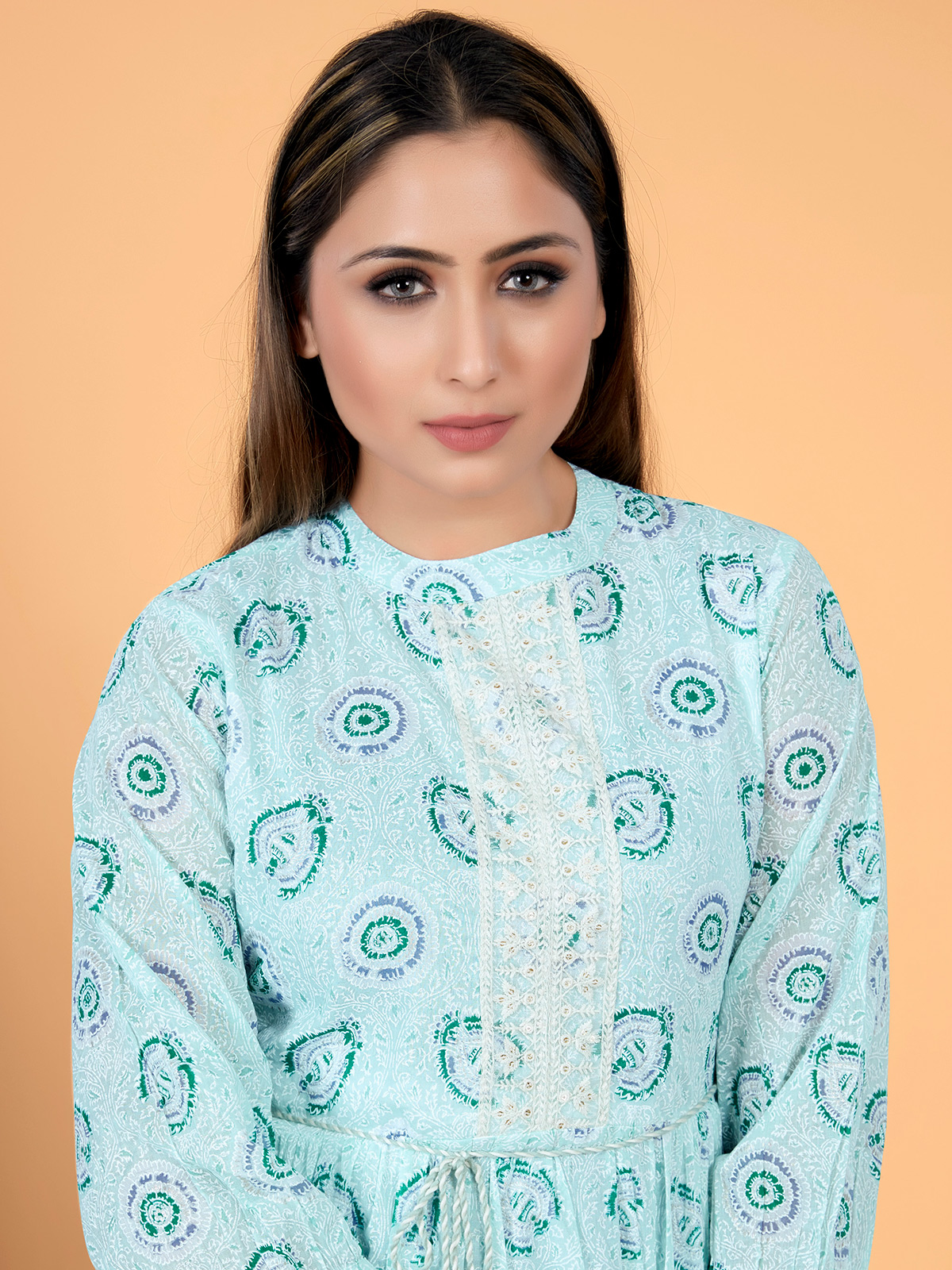 Step up your casual wear game with this stylish mint green printed kurti crafted from high quality cotton fabric. Featuring elegant embroidery and sequin work at the yoke, this kurti is designed with a bandgala shape neckline and quarter length sleeves, offering both comfort and style.