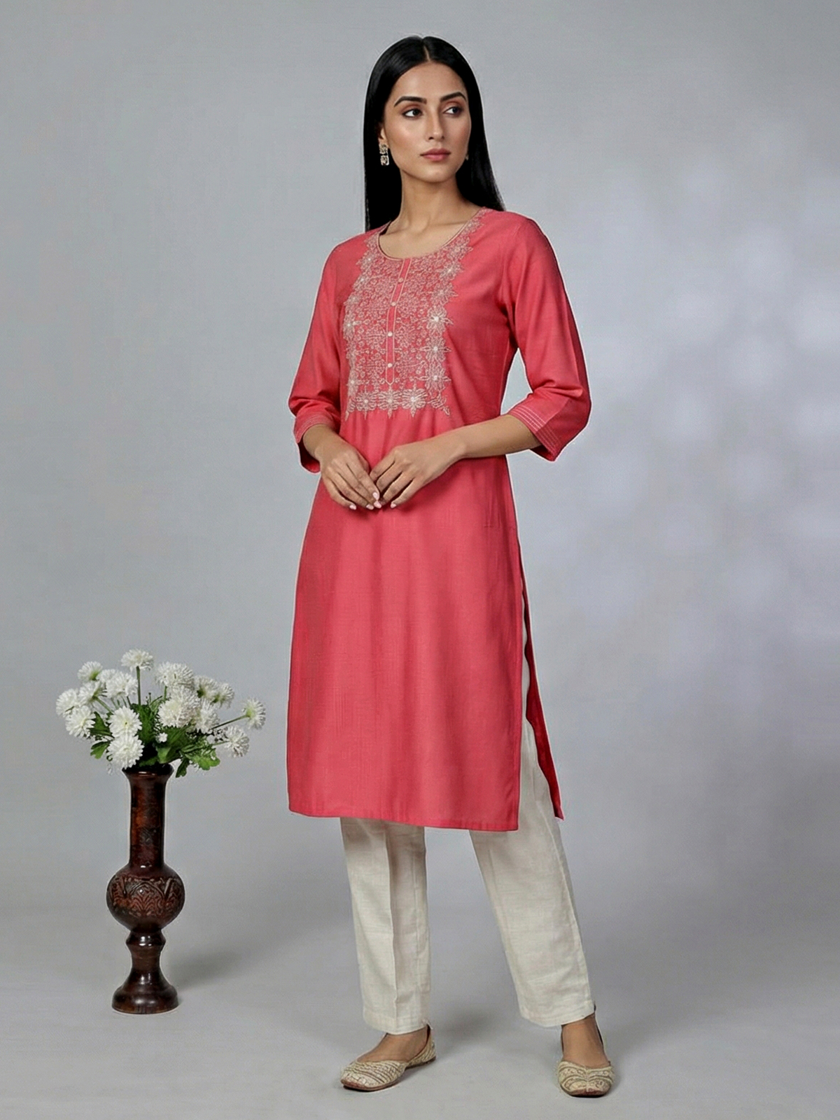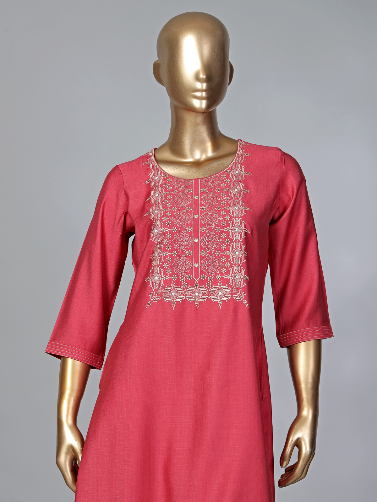Add a vibrant touch to your everyday style with this tomato red cotton silk kurti. Designed with a round neckline and quarter sleeves, it features delicate aabla and intricate thread work that lends a subtle festive shimmer, making it perfect for comfortable yet stylish daily wear.