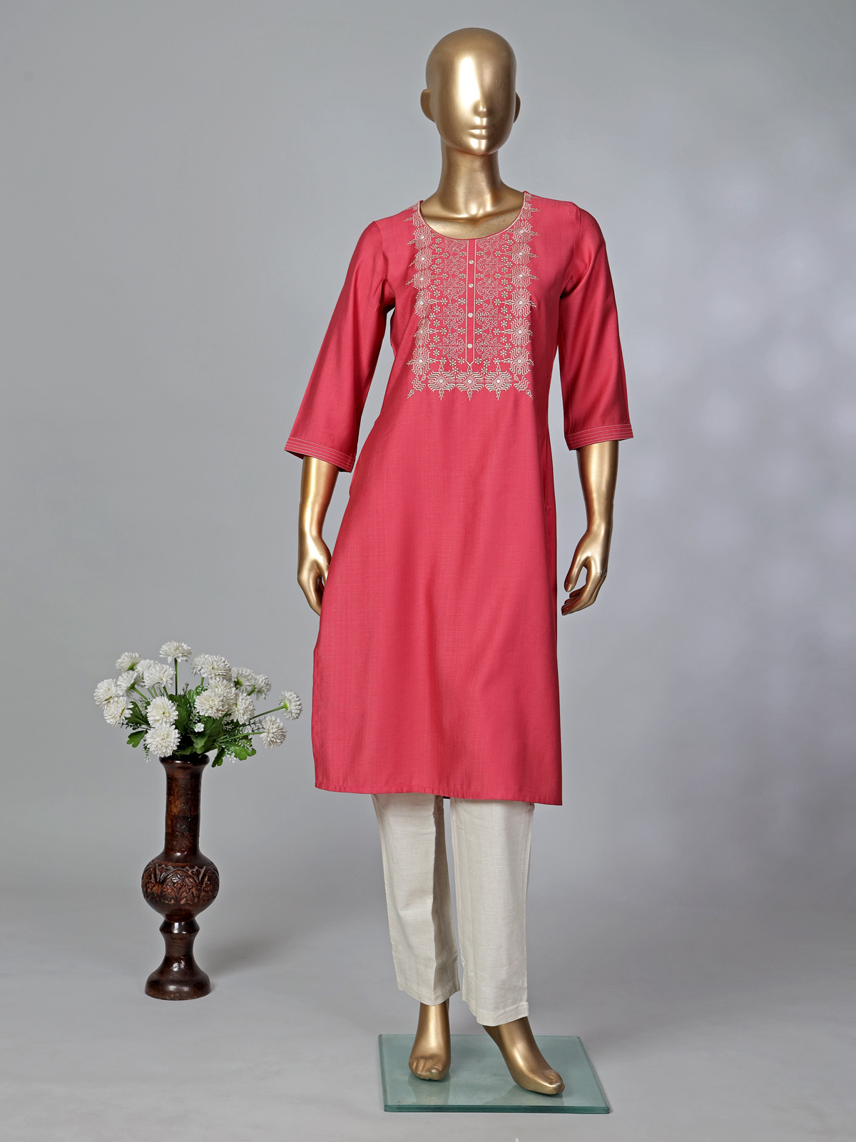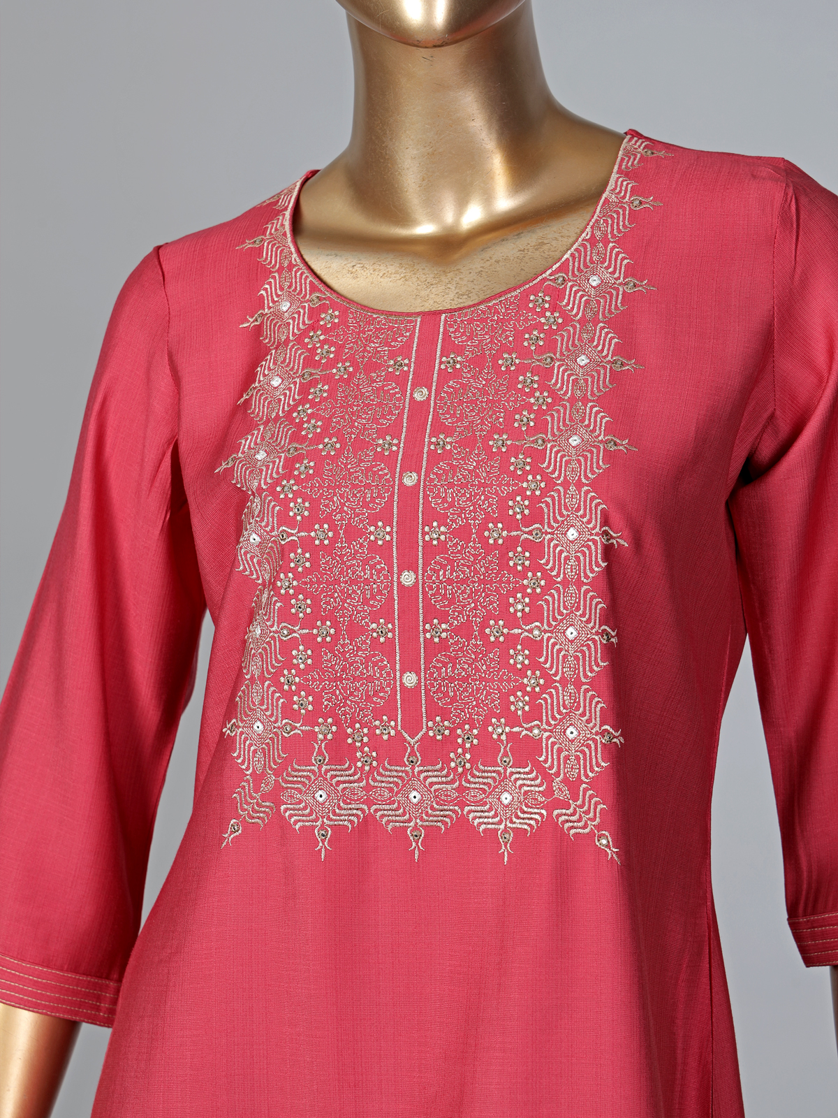 Tomato Red Cotton Silk Thread Work Casual Kurti