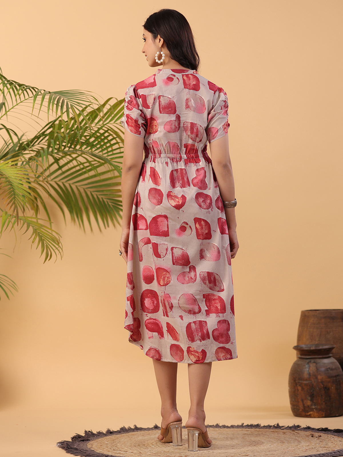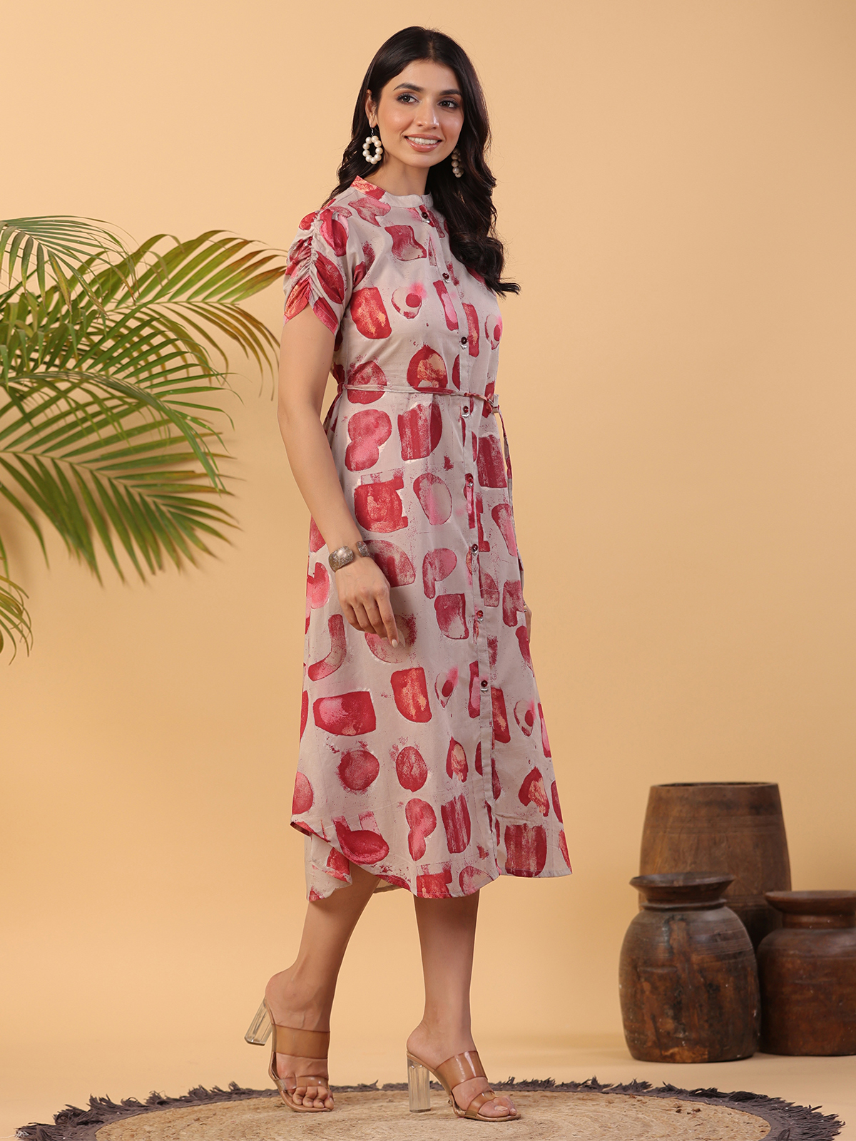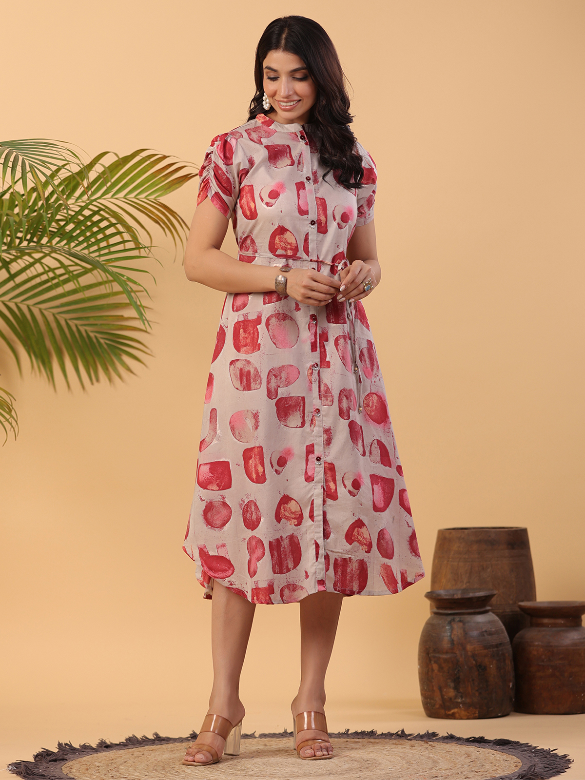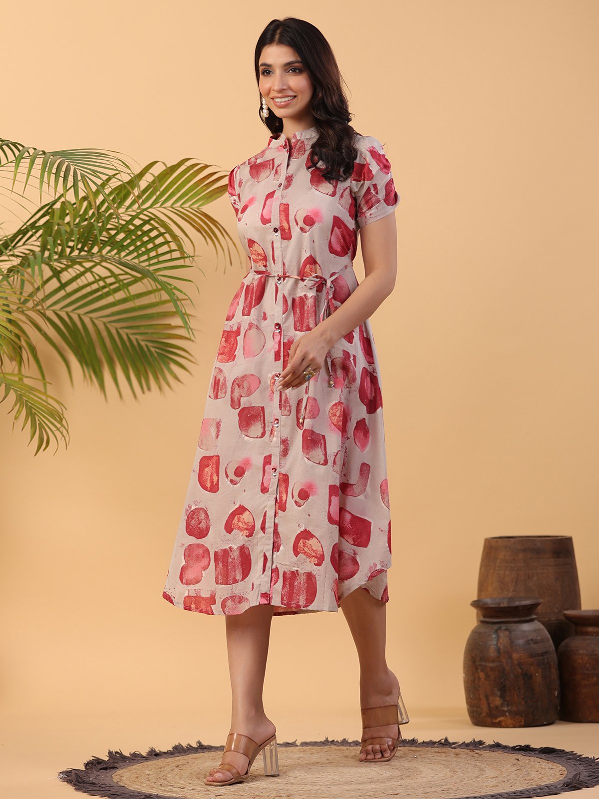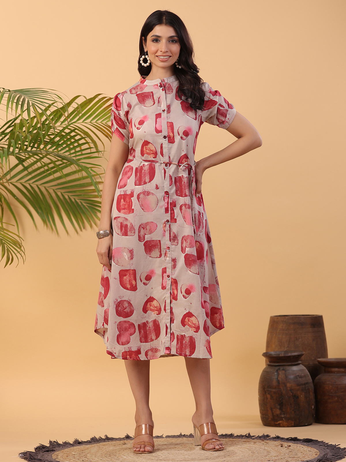 This beige and red printed kurti is crafted from cotton for a smooth and comfortable feel. This kurti stands out with its stand collar neck and half sleeves.