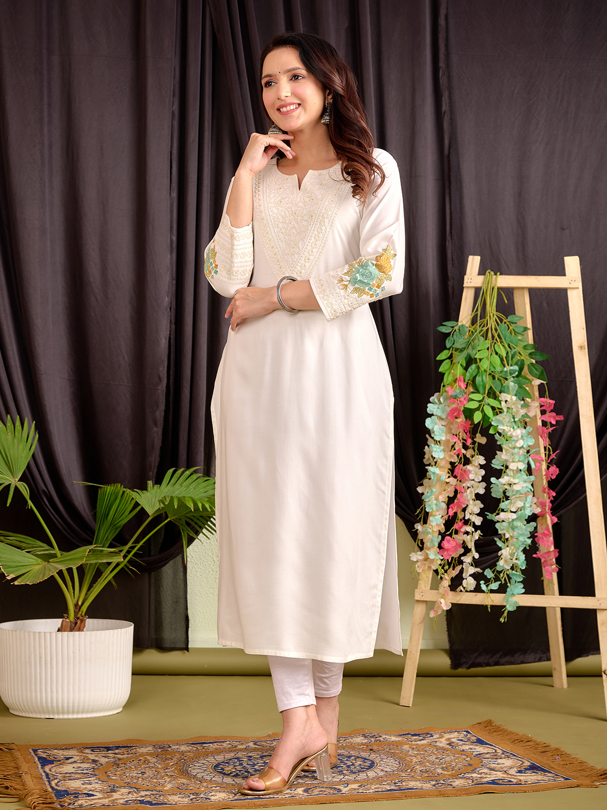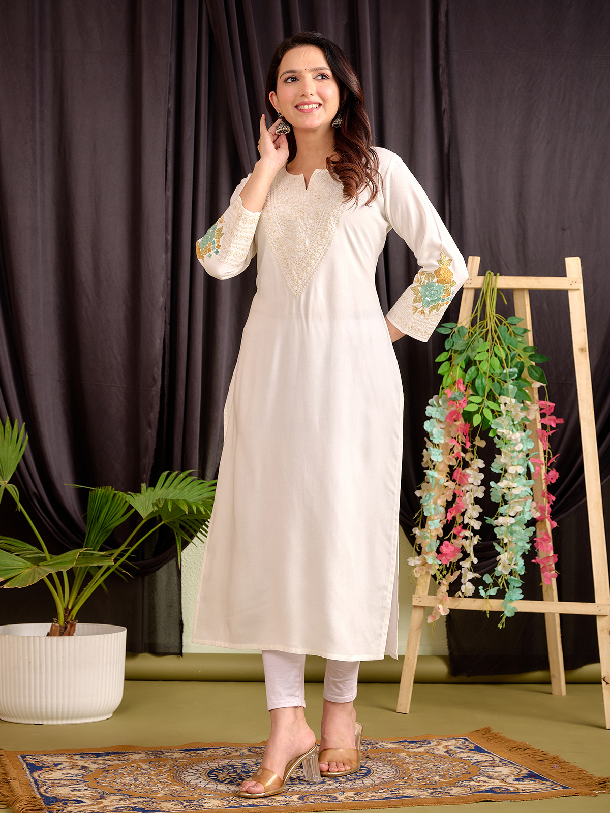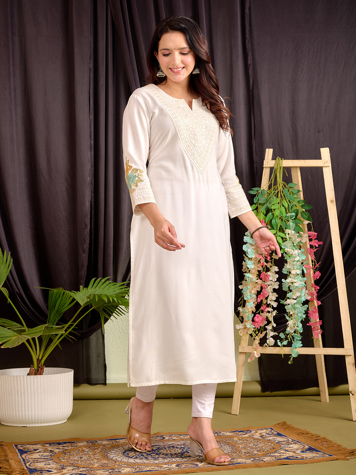 Elegant and versatile, this white cotton silk kurti features delicate embroidery, sequins, and threadwork that add subtle charm to casual attire. Designed with quarter sleeves, it offers comfort and a flattering silhouette. Perfect for daytime gatherings, office wear, or casual festive events, this lightweight kurti effortlessly blends modern style with traditional detailing.