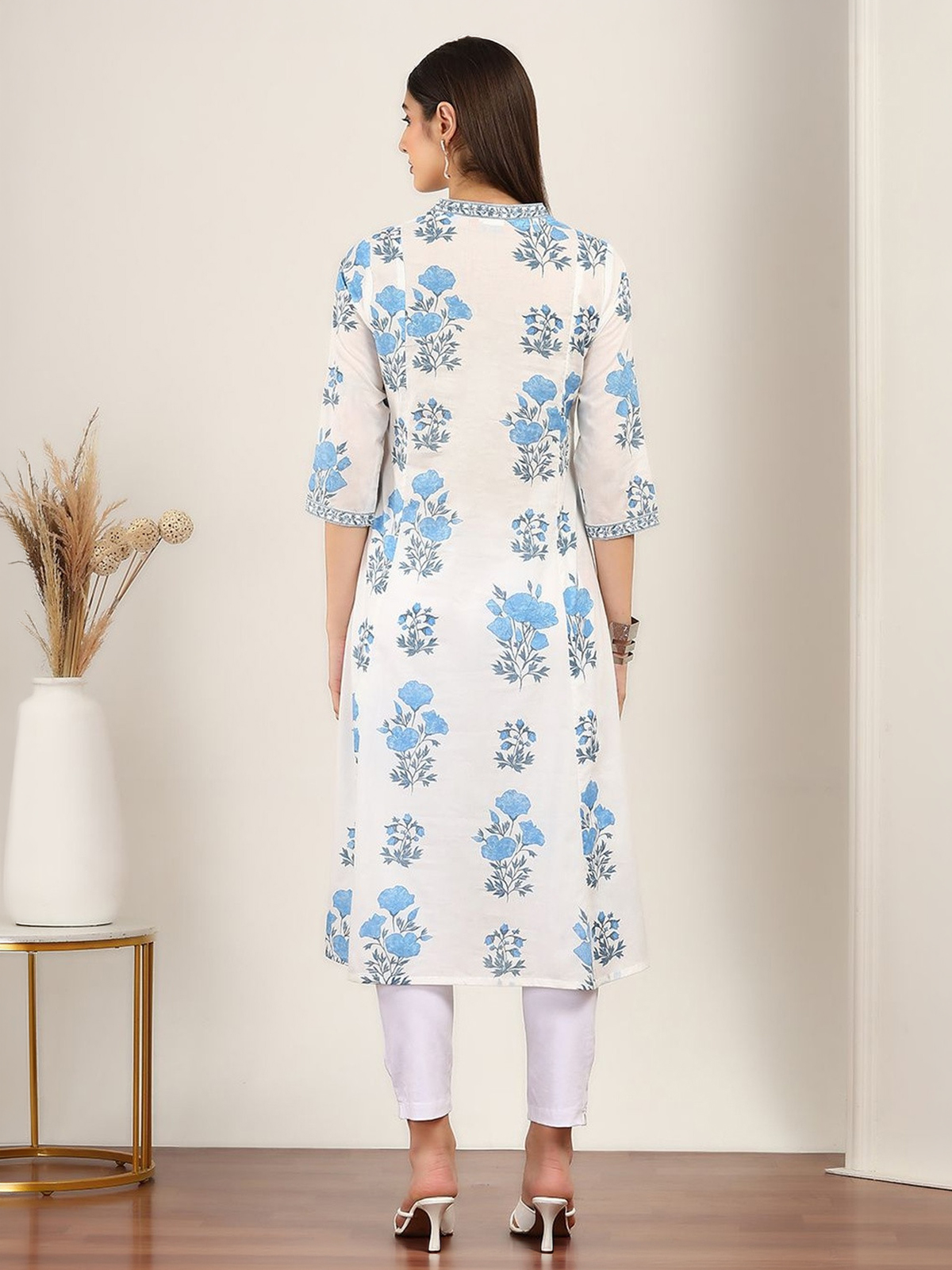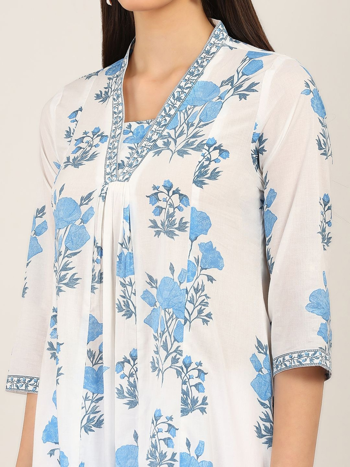 White Cotton Silk Floral Printed Kurti V Neck Style