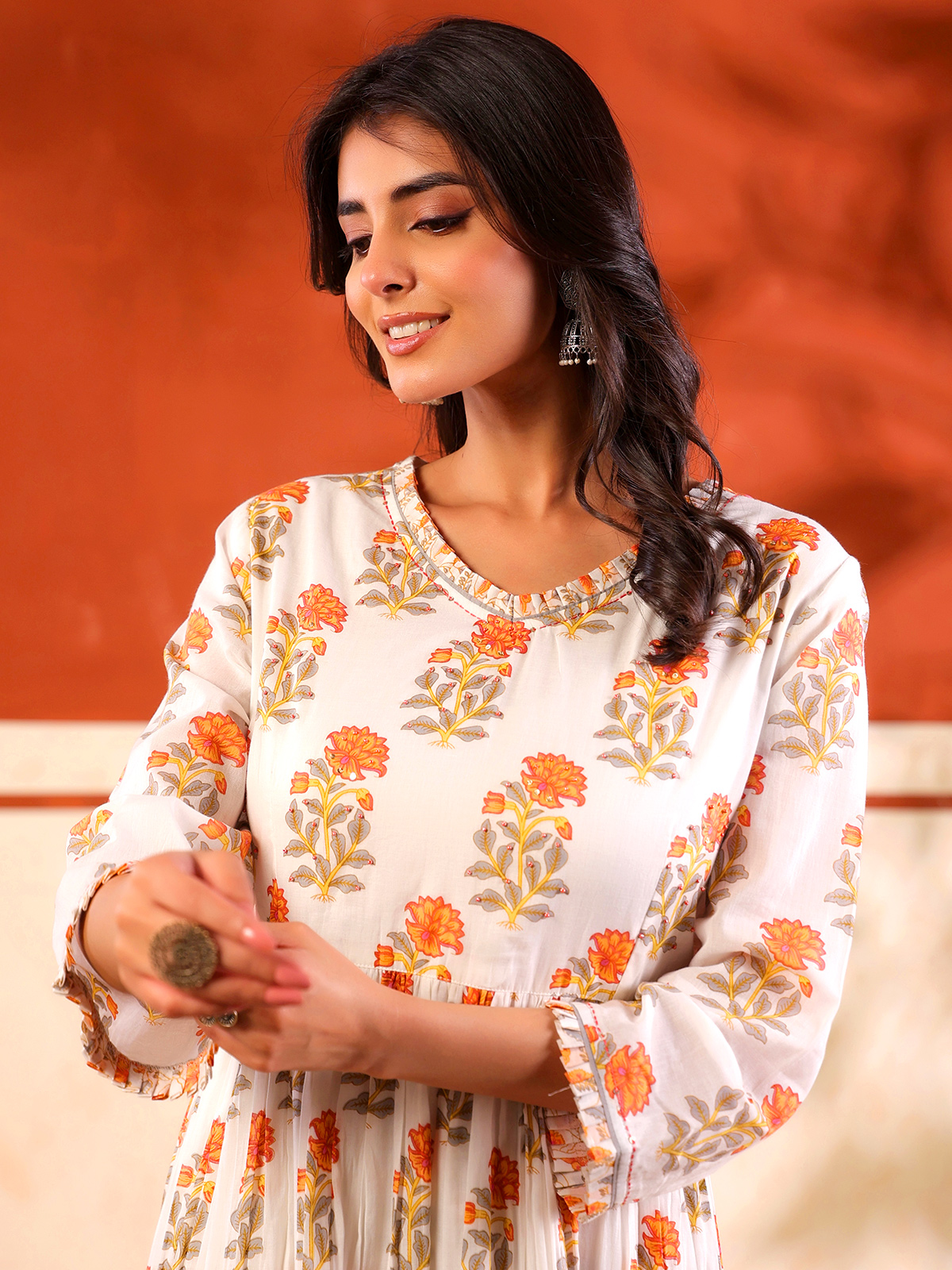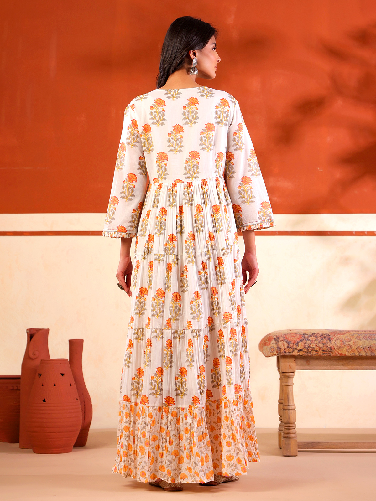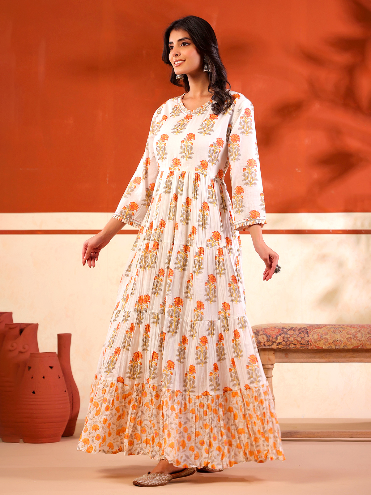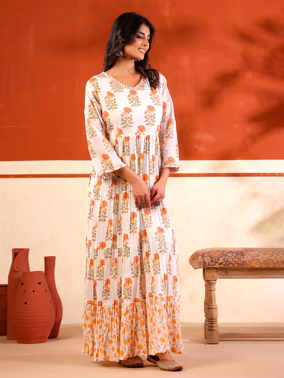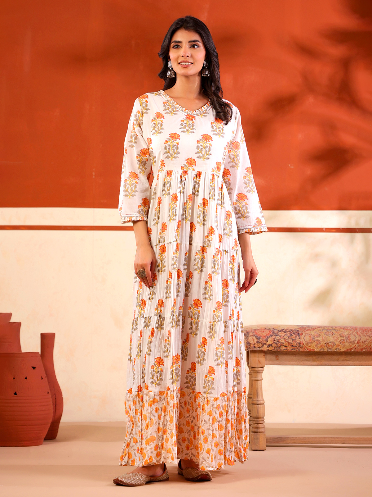Enhancing your graceful charm, this white cotton floor-length kurti brings effortless elegance to your look. Designed with a U neckline and quarter sleeves, it is adorned with printed patterns along with delicate sequins and bead work. Perfect for casual and festive occasions, it offers a stylish and comfortable ethnic appeal.