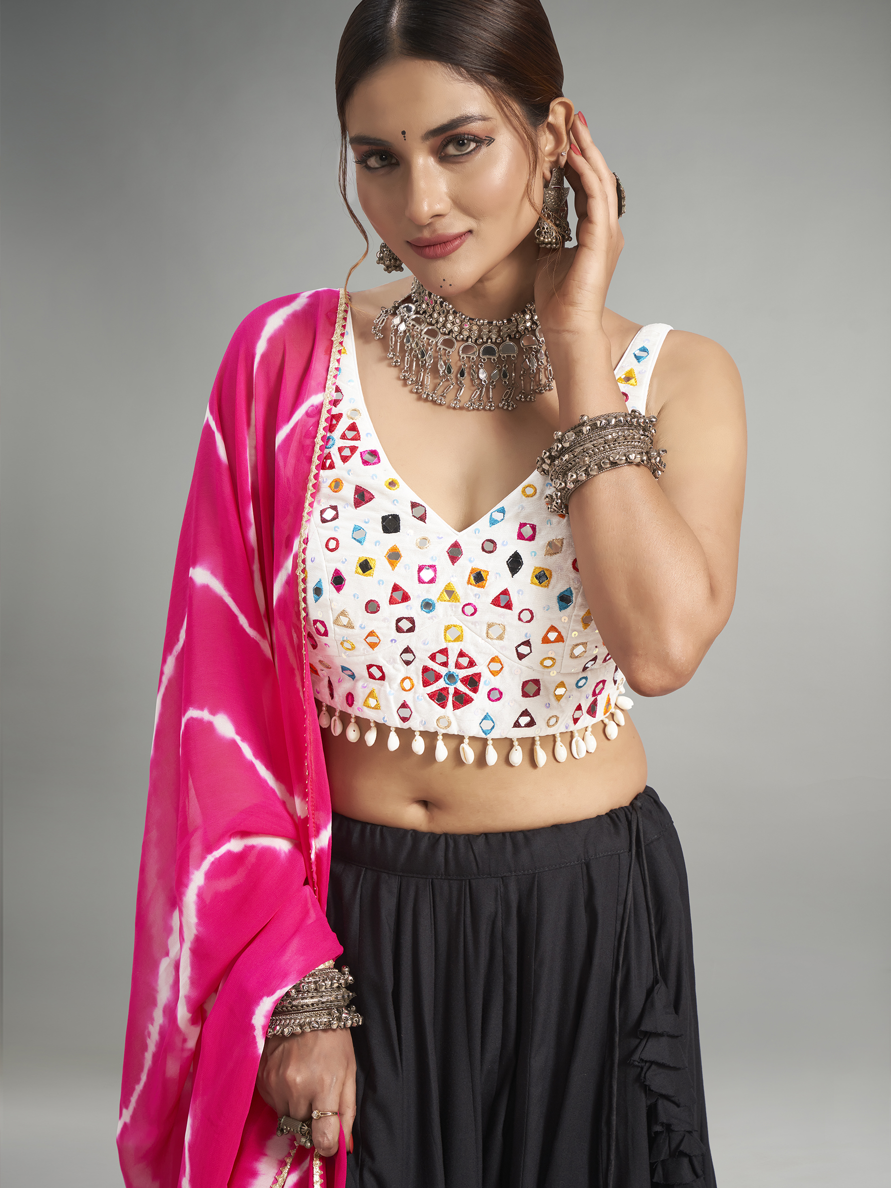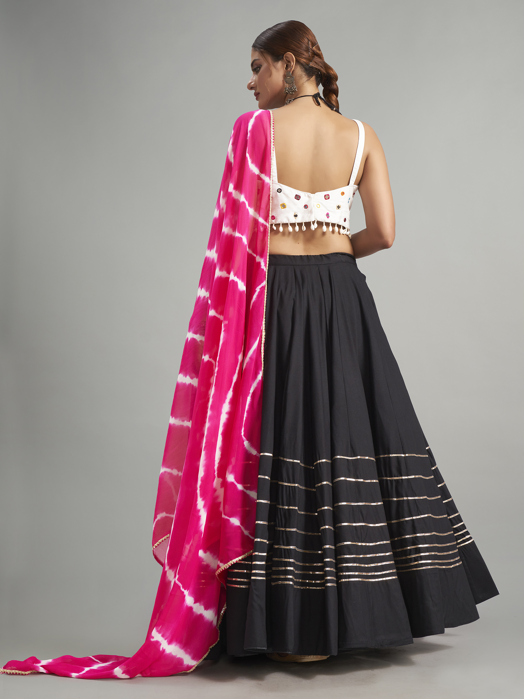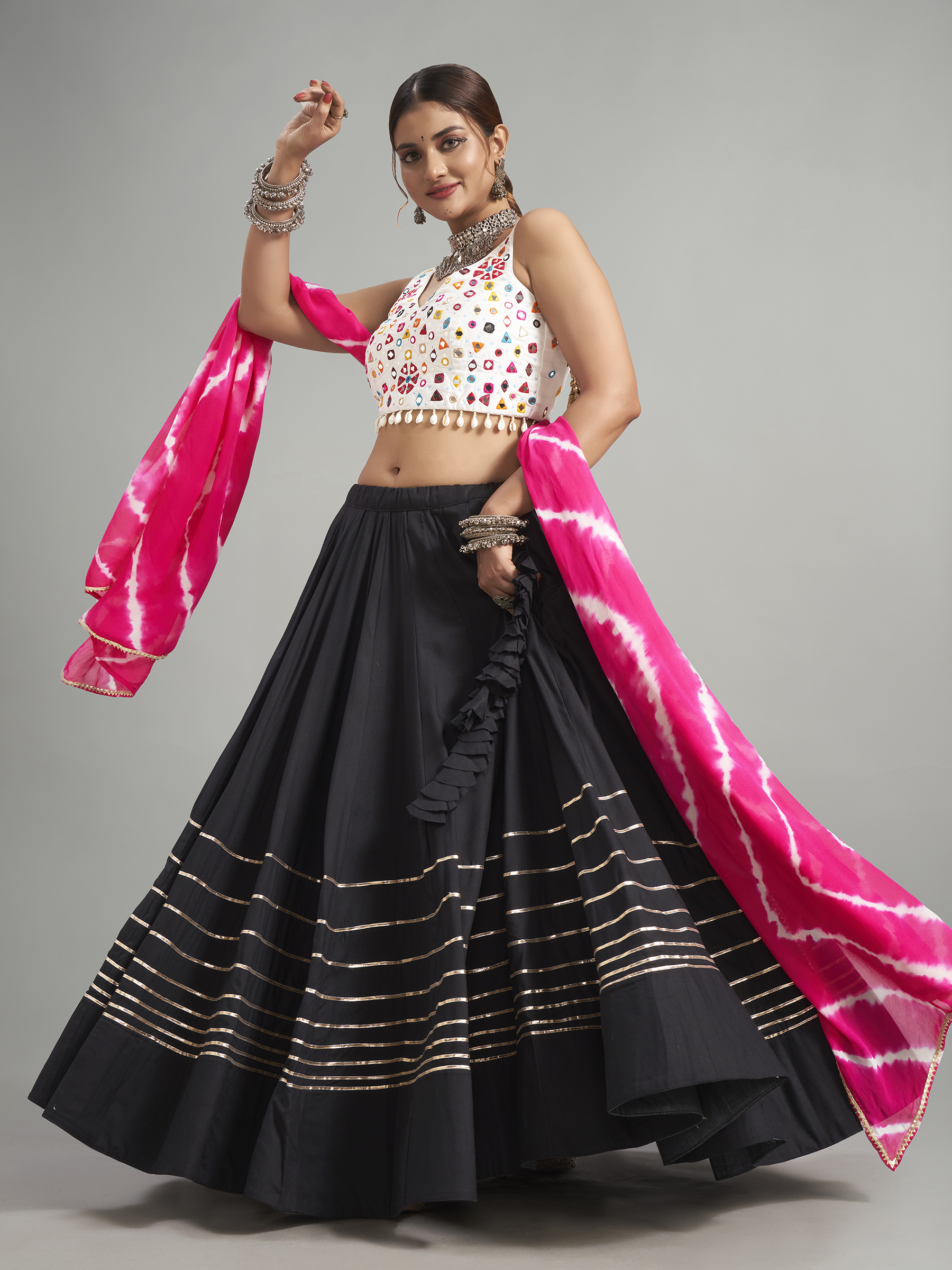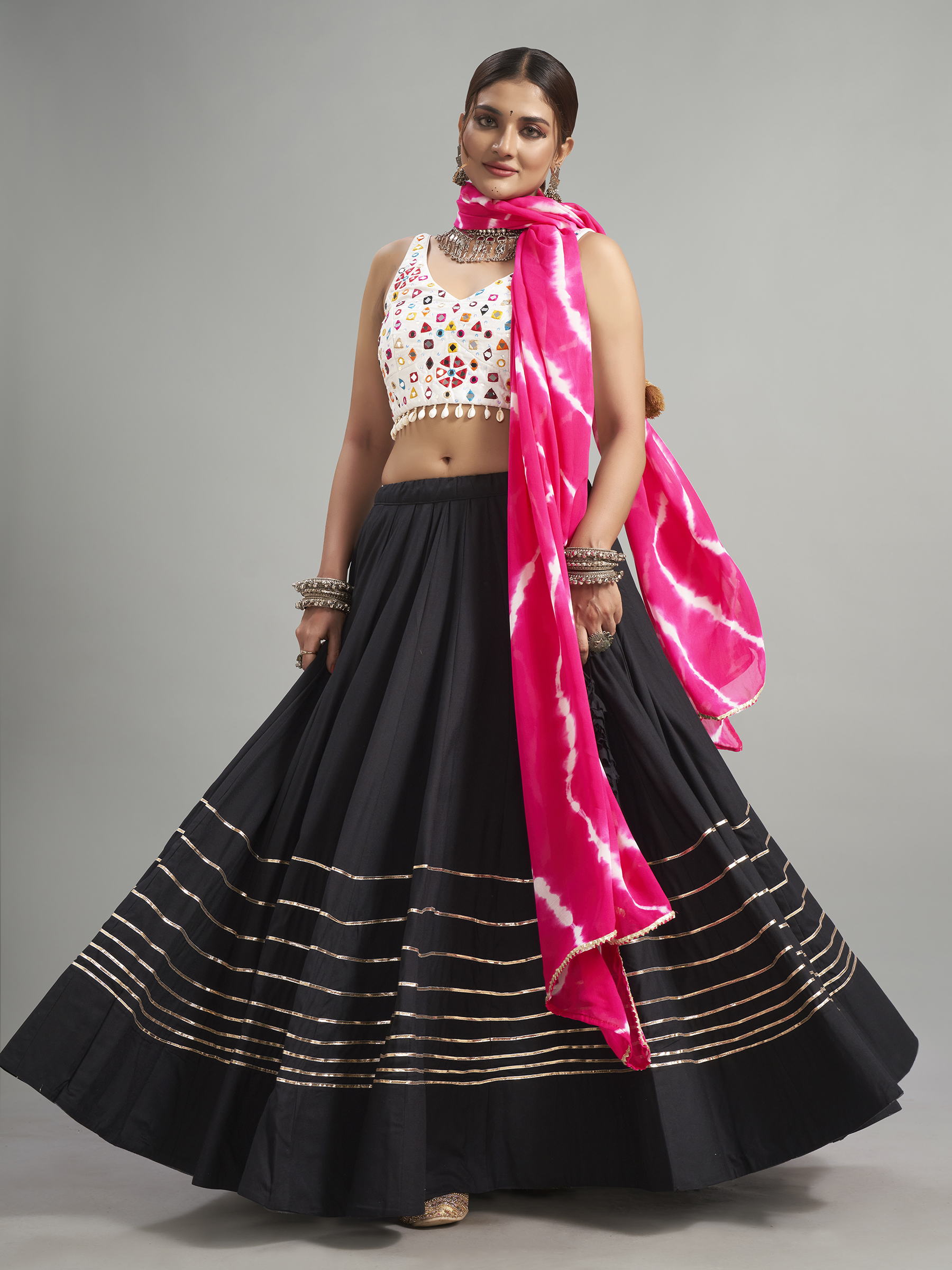 This black cotton silk garba special chaniya choli is a vibrant and graceful ensemble. It is enhanced with sequins, mirror, cowrie shells, and gota work. The charming choli features a U-neck and sleeveless pattern and comes with a printed dupatta. Note that the print and work may slightly vary from the image.