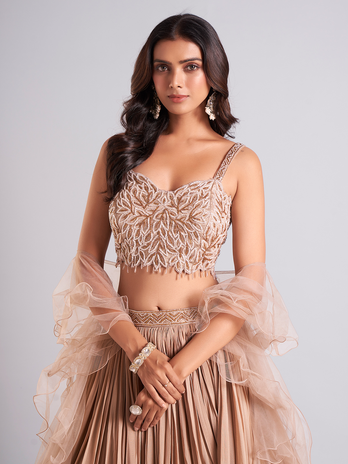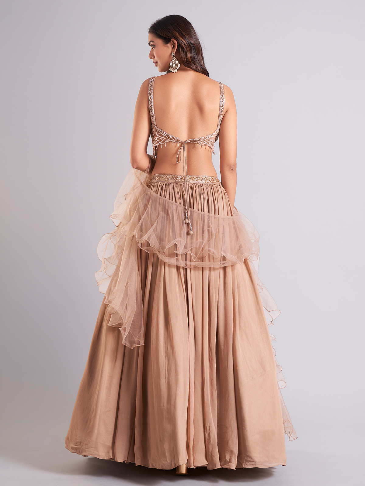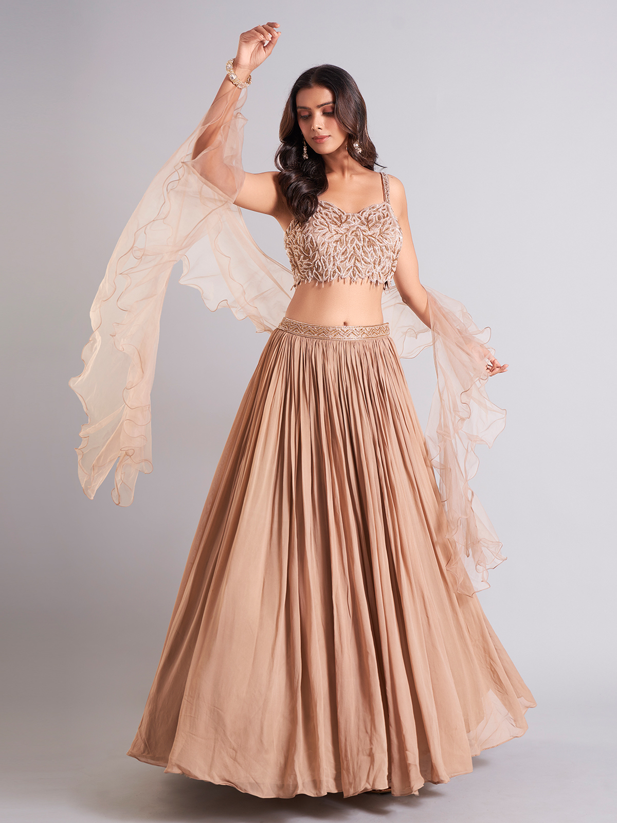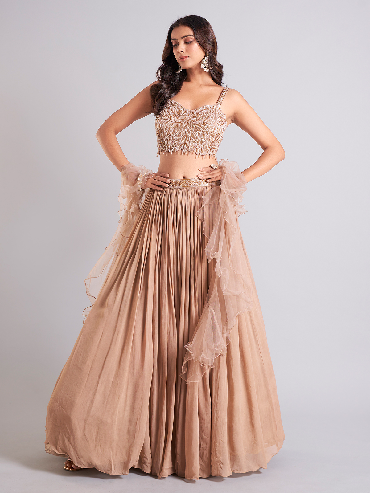 Achieve a stylish look with this beige georgette lehenga choli, enhanced with cutdana work. The sleeveless choli paired with a ruffle dupatta adds a touch of sophistication to your ensemble.