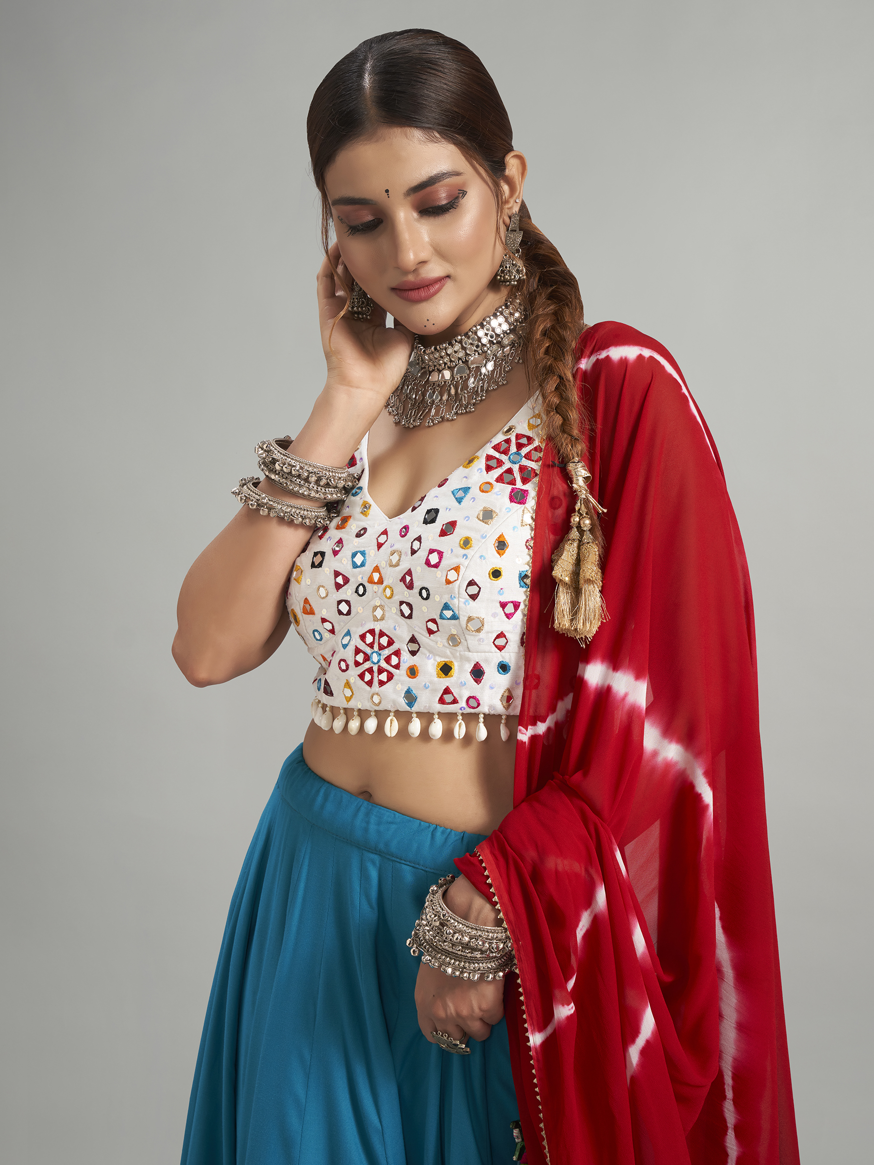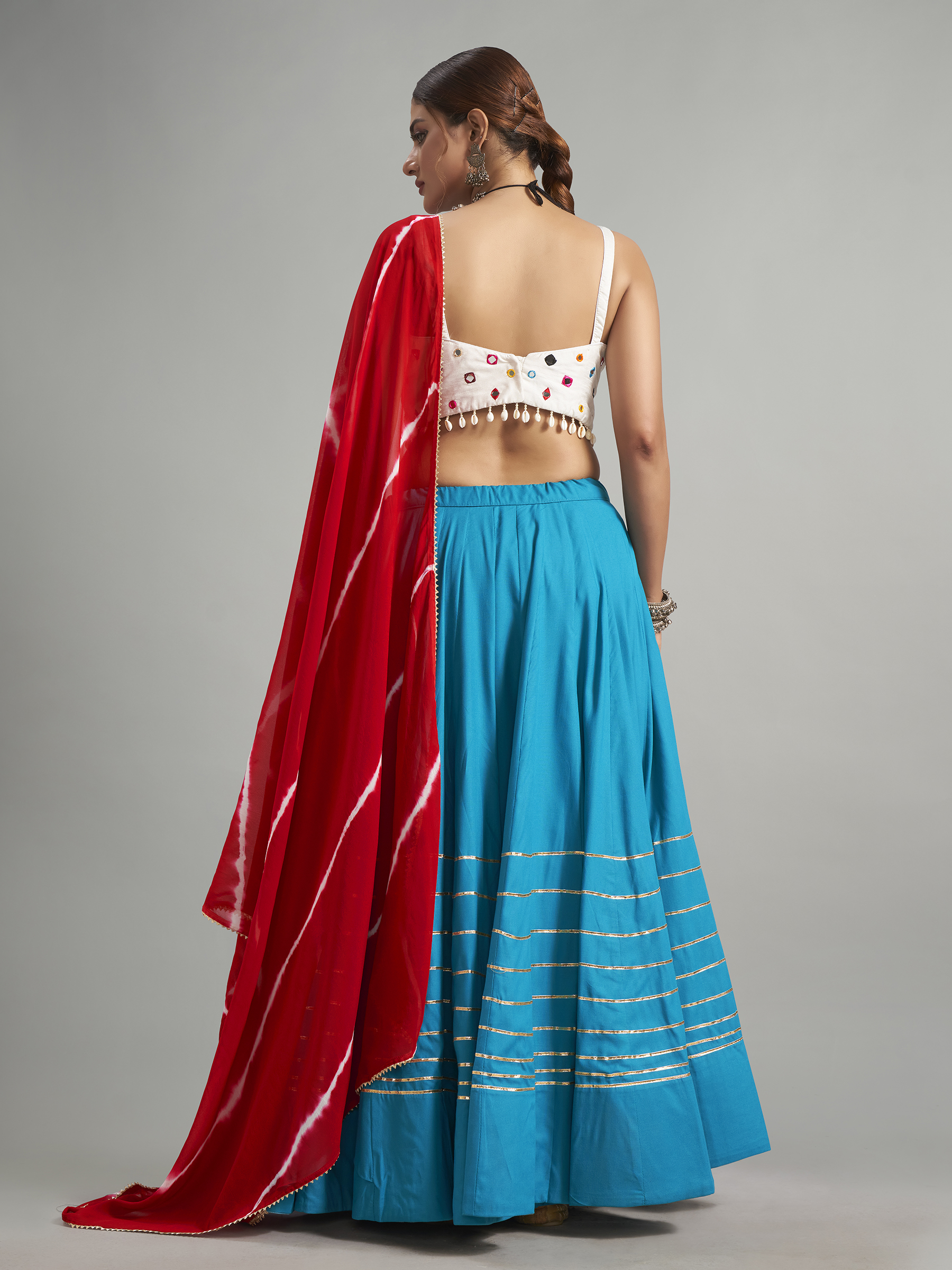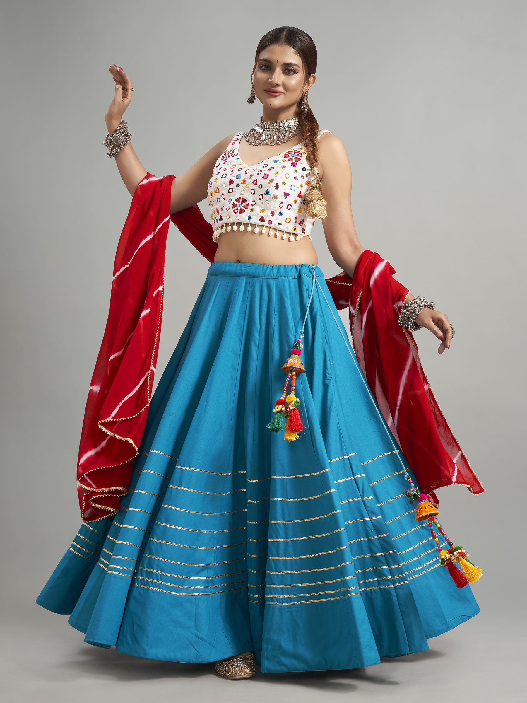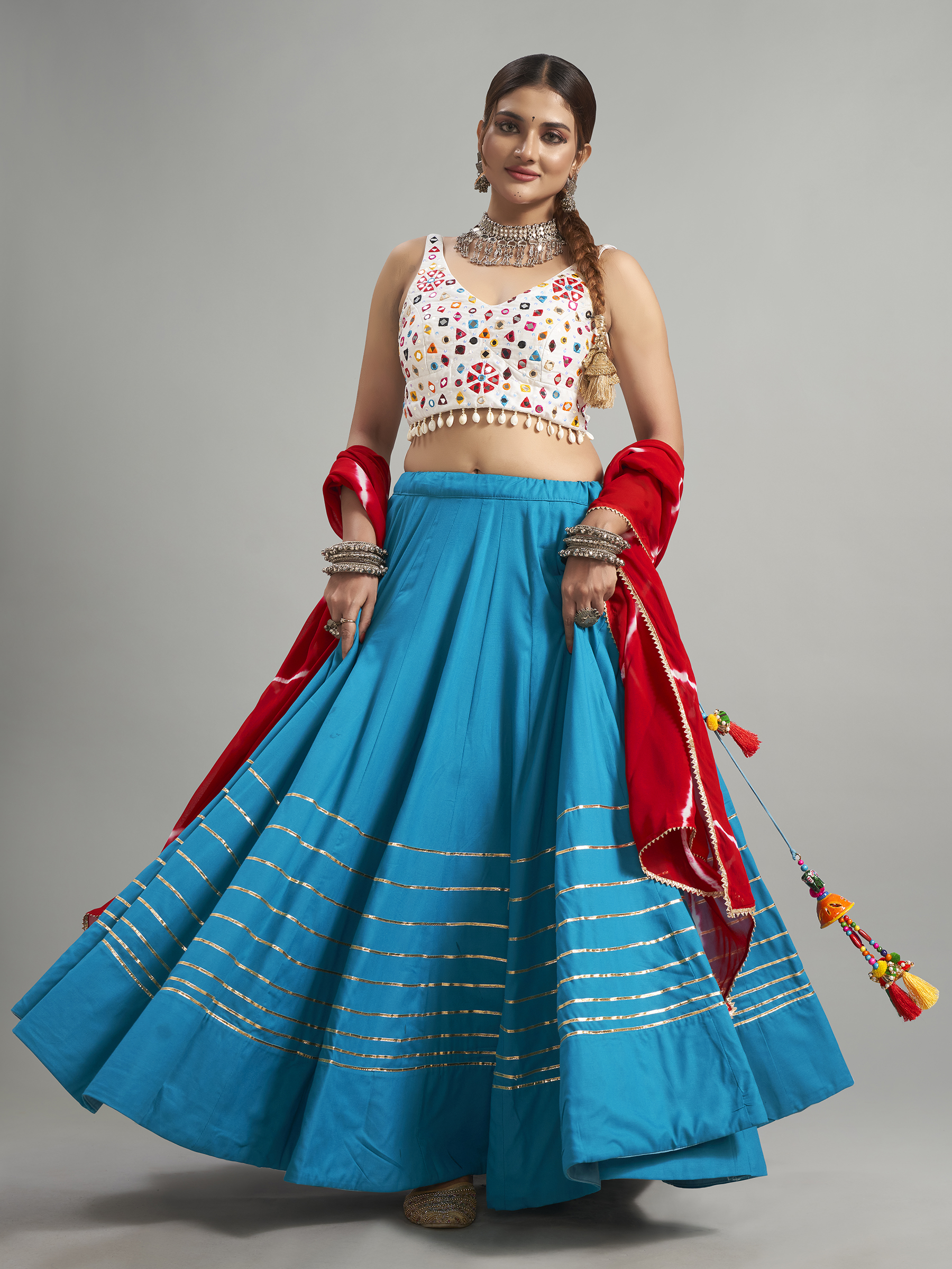 Look extremely stunning this Navratri in this ethnic aqua cotton silk lehenga choli. The intricate sequins, mirror, cowrie shells, and gota work elevate the outfit. The choli has a U-neck and sleeveless pattern and comes with a dupatta. Note that the print and work may slightly vary from the image.
