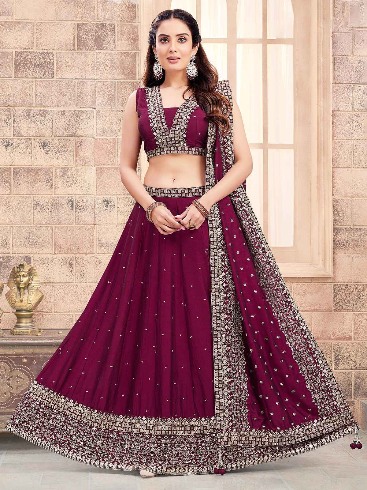 For a sophisticated and luxurious look, this stylish wine lehenga choli, made from premium silk fabric, is an ideal choice for weddings and receptions. The intricate resham and sequin work add a rich and refined touch to this breathtaking ensemble. Entire look is completed with wine silk dupatta.
