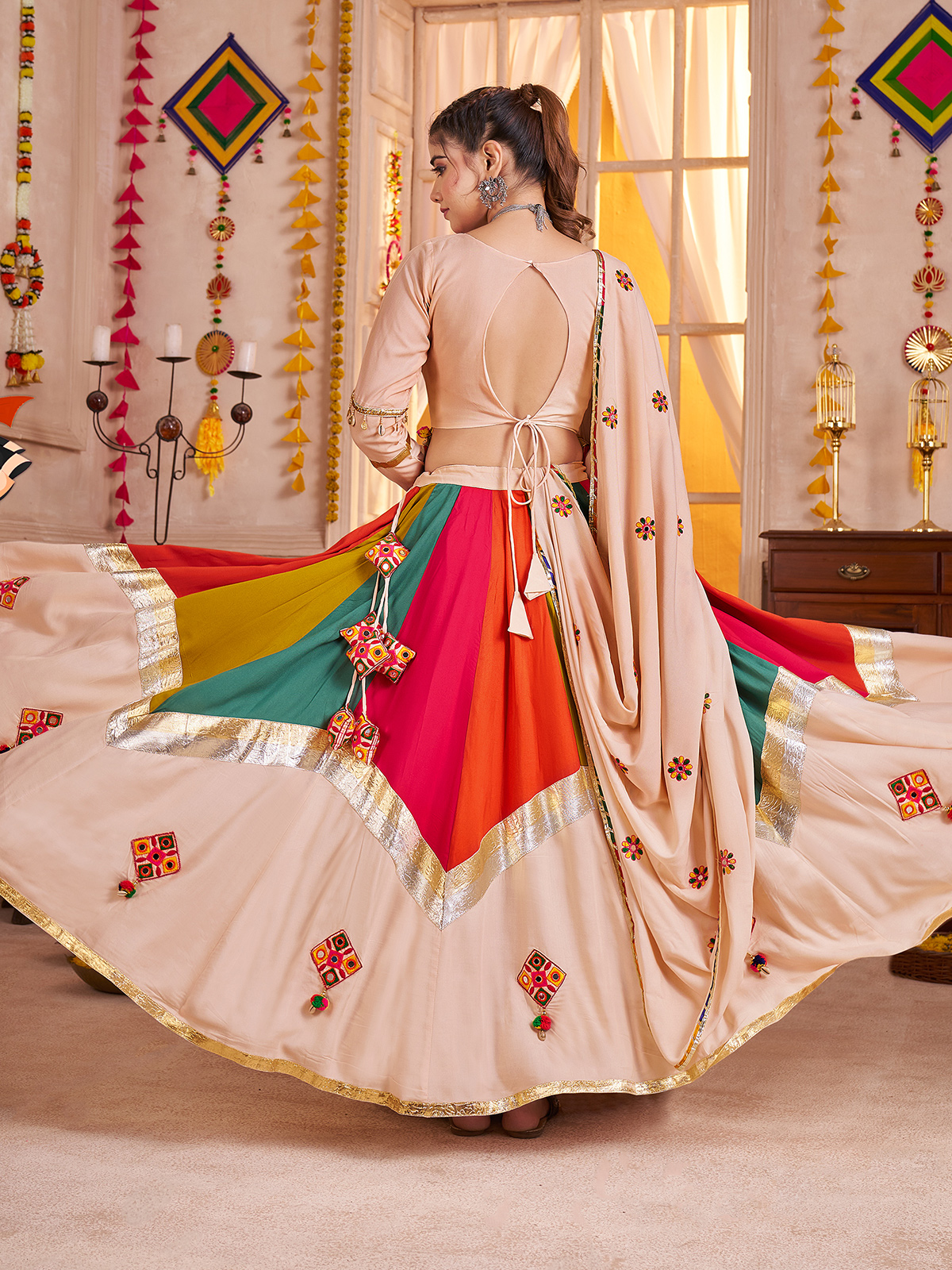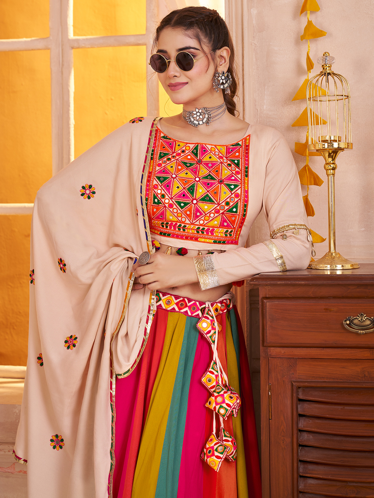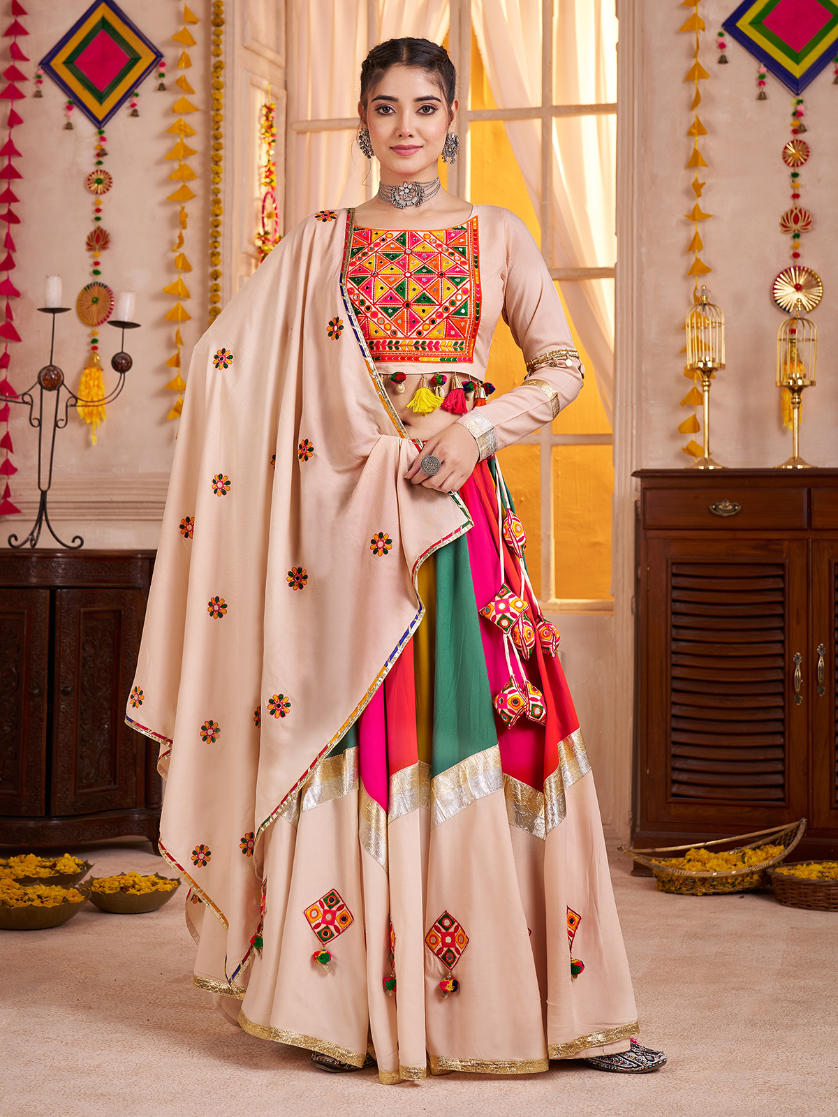Step into the festive season in this beige navratri chaniya choli, beautifully adorned with mirror work, embroidery, and cowrie shell detailing. The set includes a ready-made blouse for a perfect fit, crafted in luxurious viscose cotton. Complete the look with a matching dupatta for added grace.