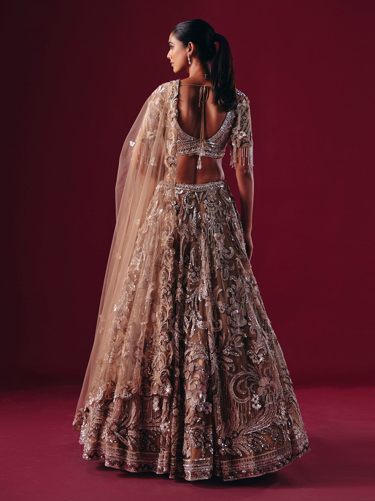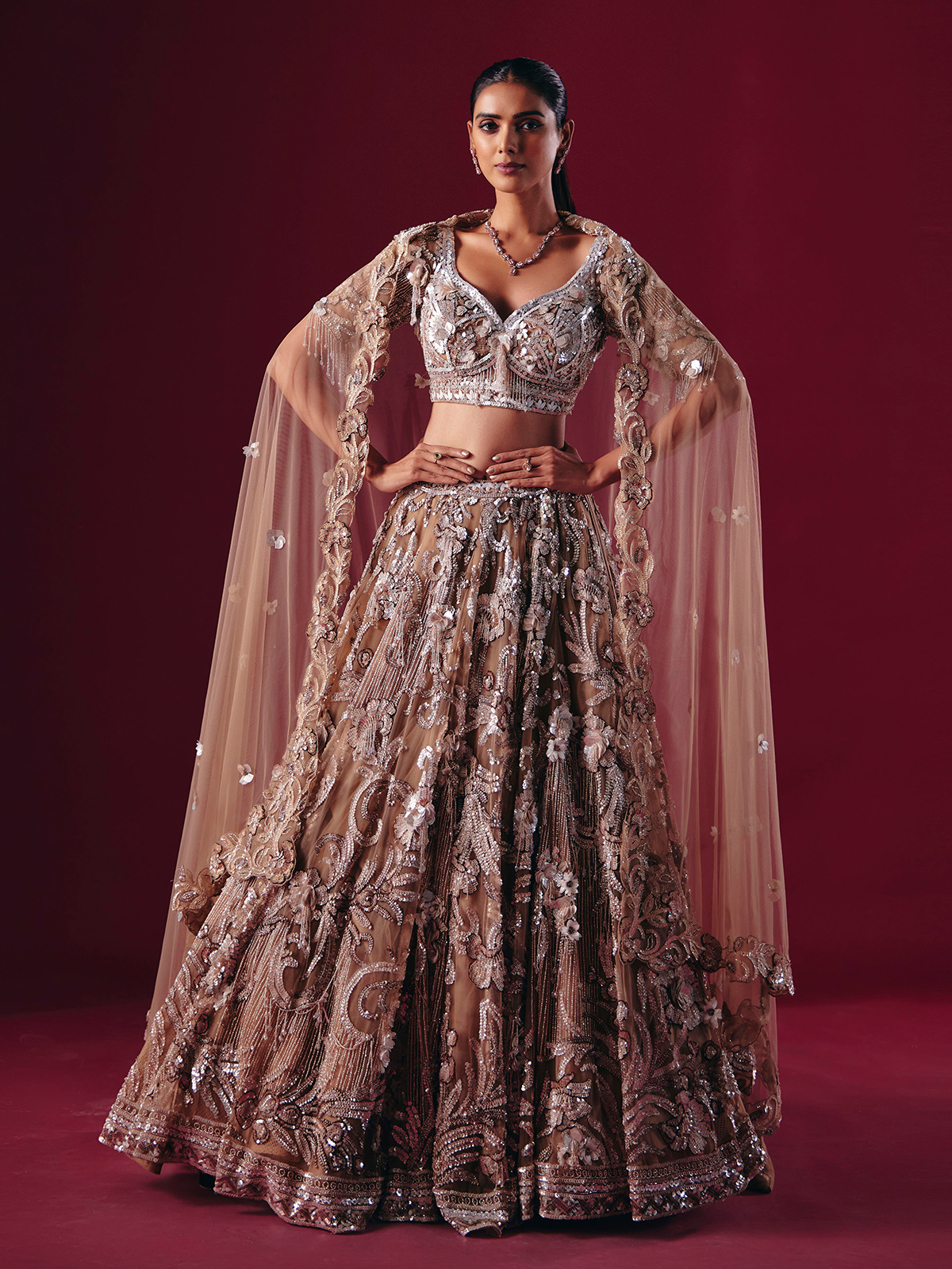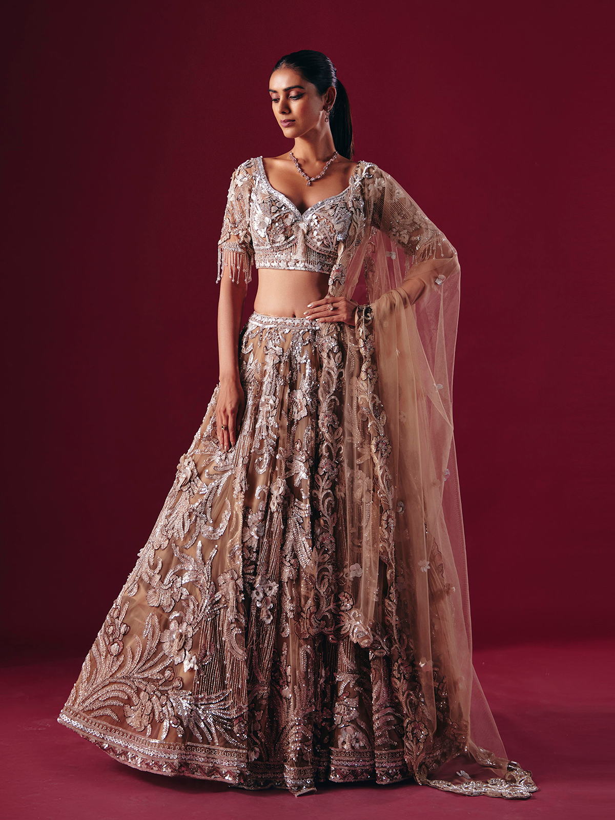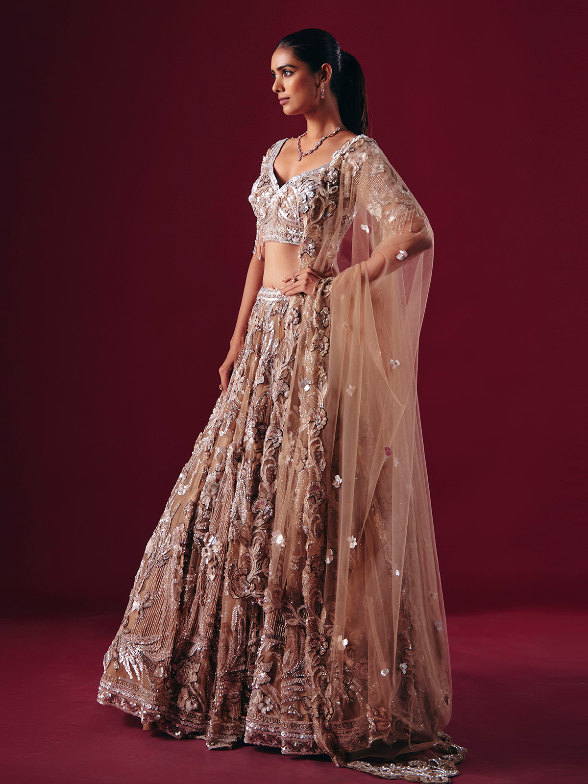 This beige net lehenga choli exudes opulence with its cutdana, sequins, beads, and diamond embroidery. Featuring a sweetheart neckline, half sleeves, and dupatta, it is tailored for weddings, receptions, and celebrations, bringing together luxury craftsmanship and timeless elegance.