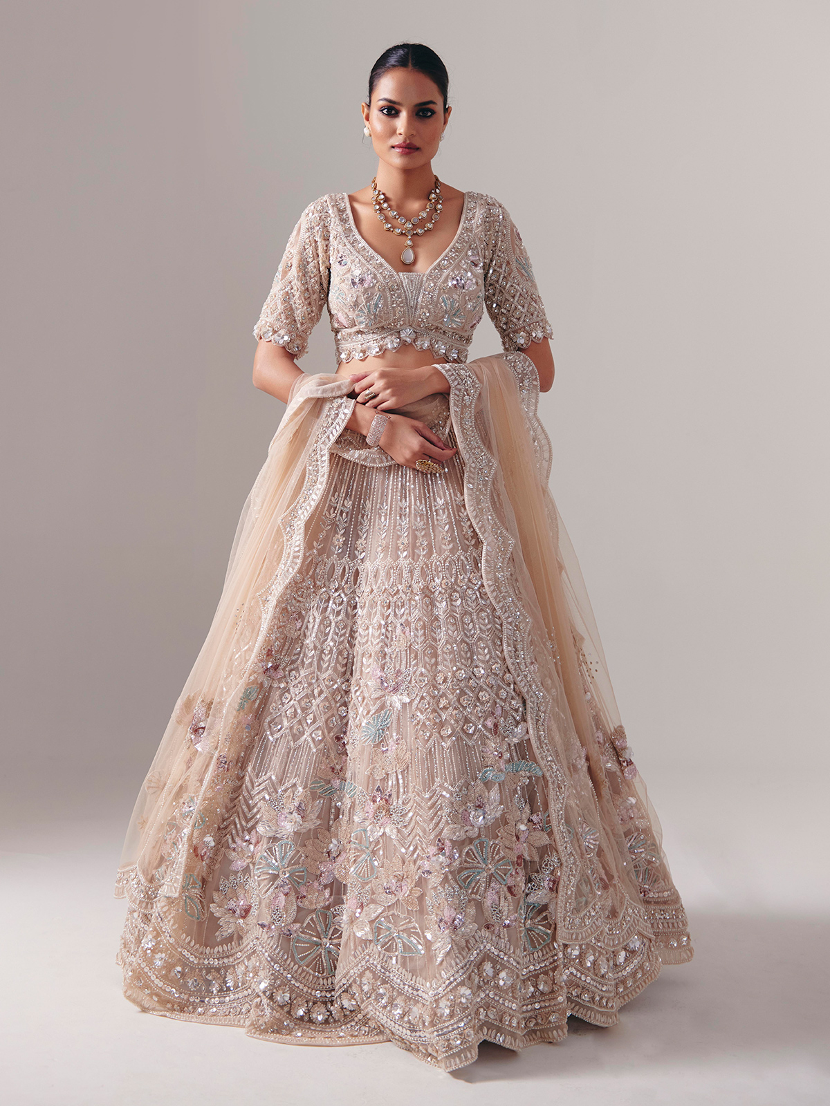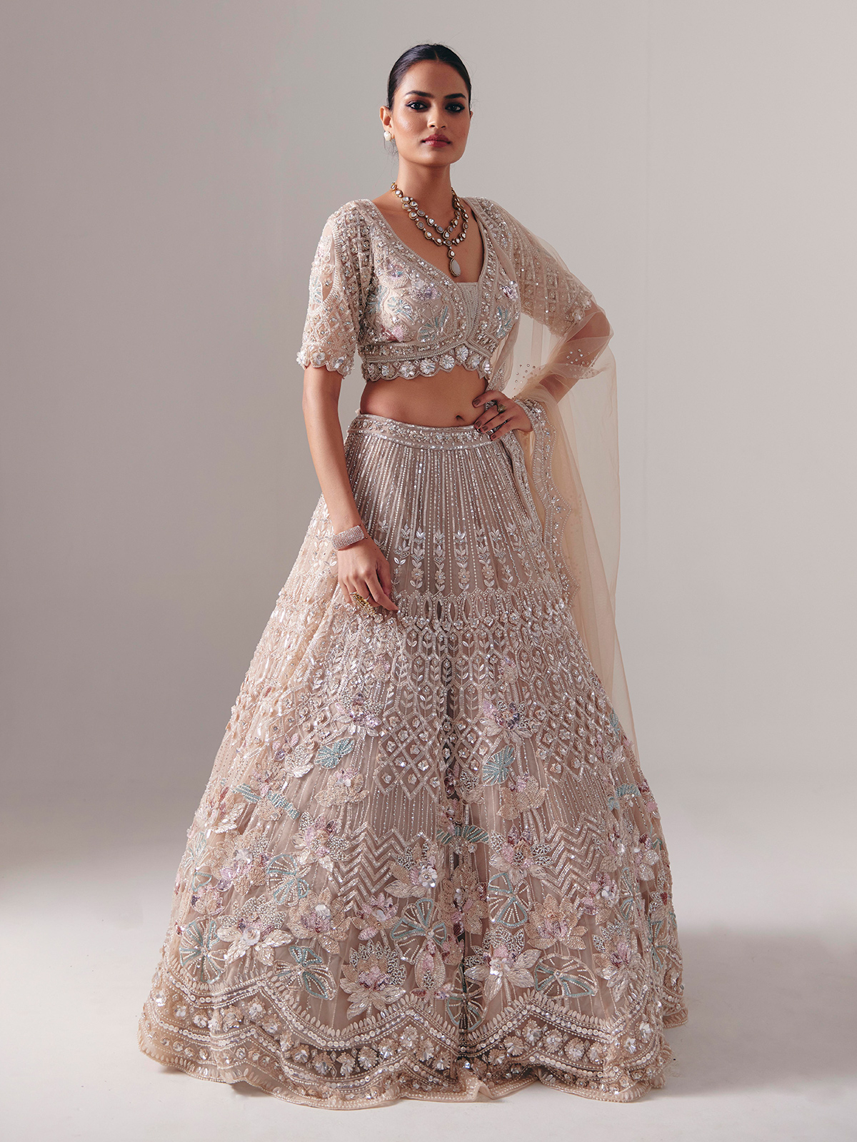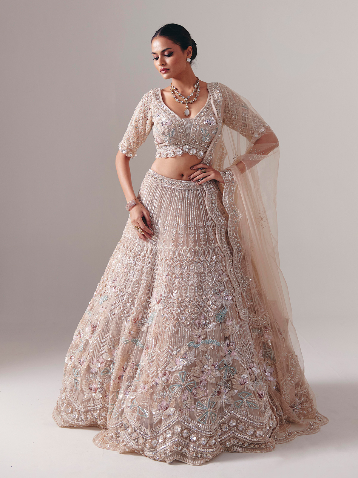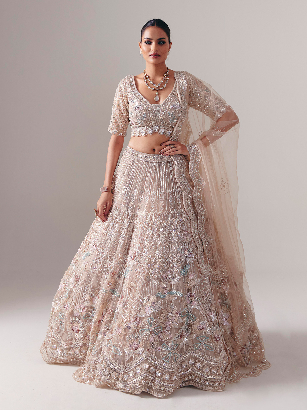 Beige Net Diamond Pearl Lehenga Choli