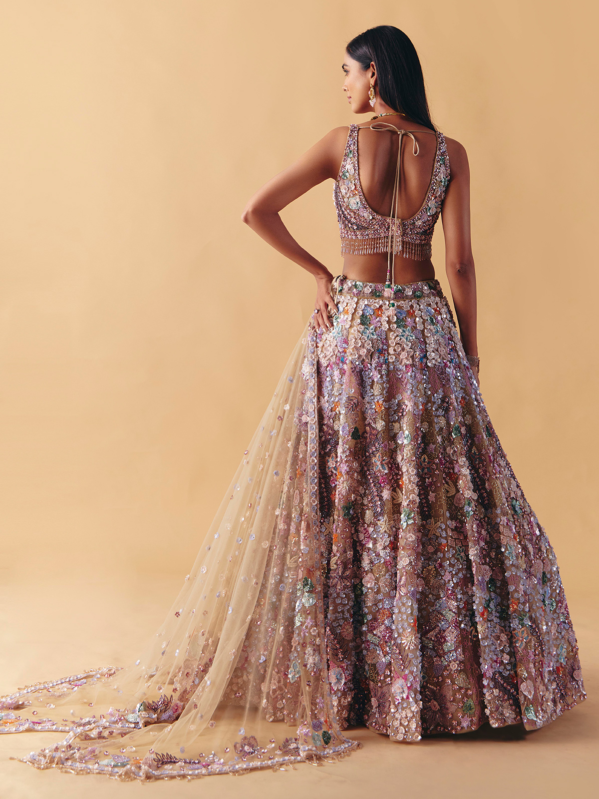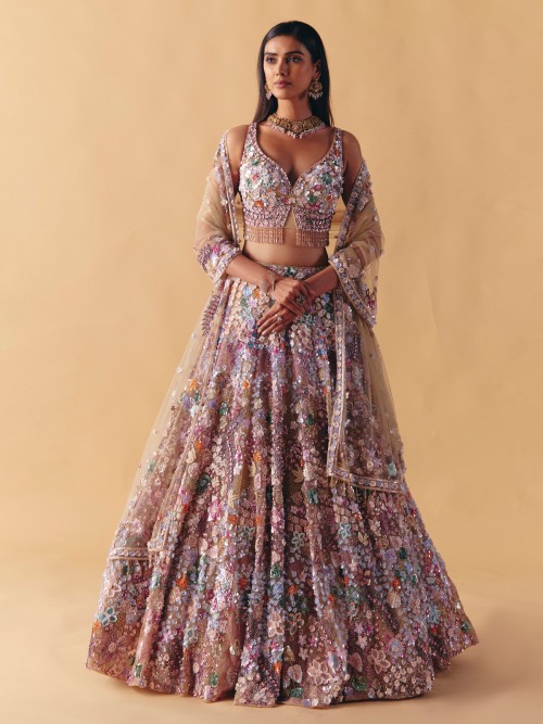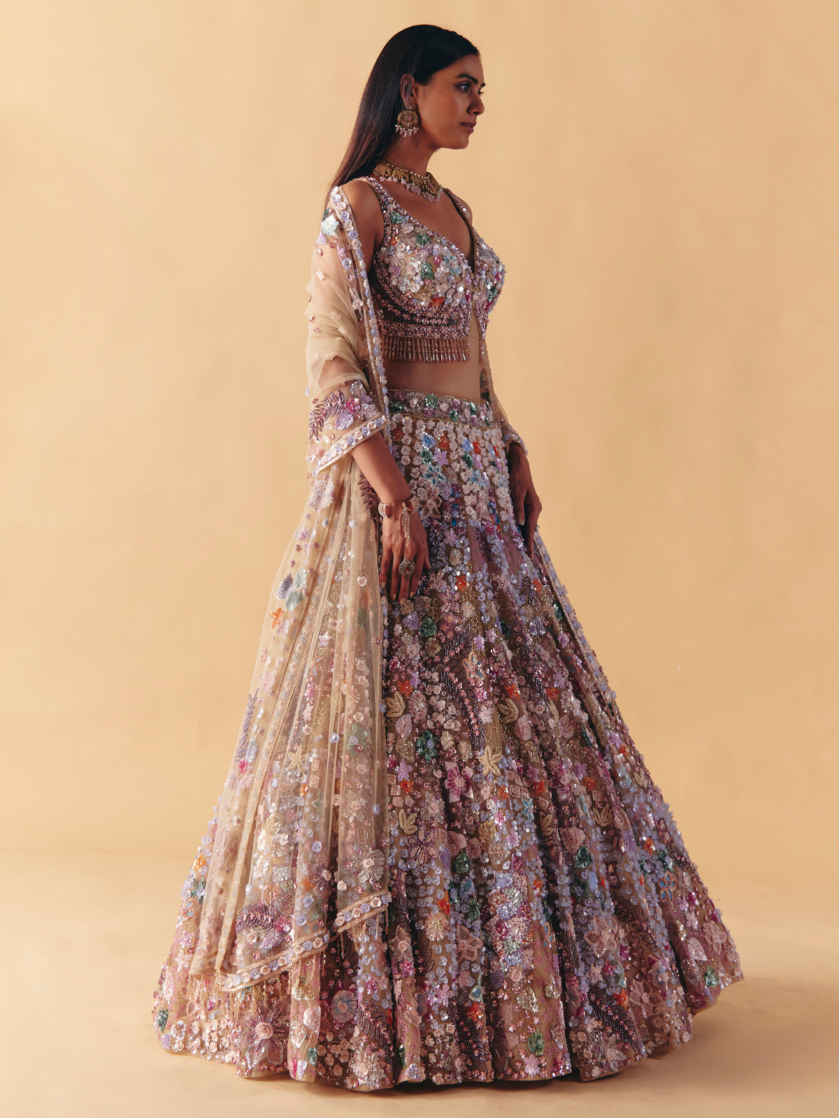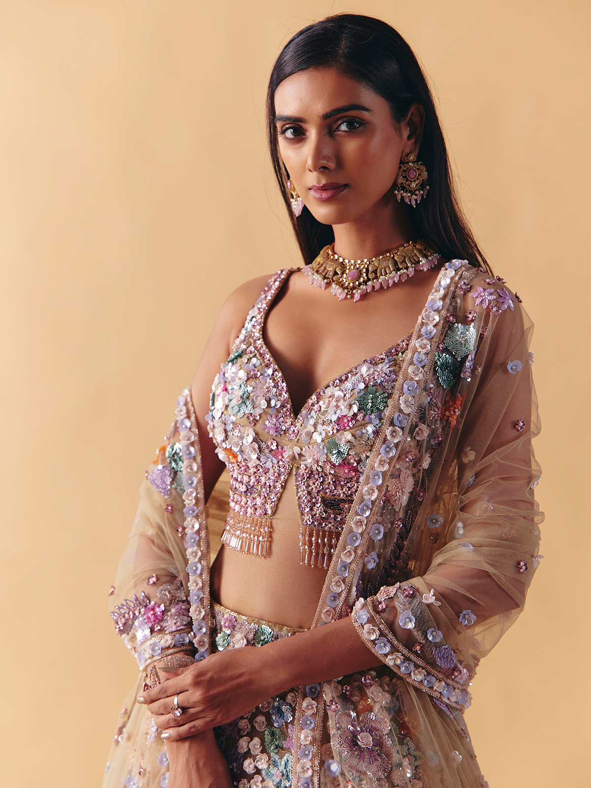 Soft beige net lehenga glows with pearls, beads, sequins, and cutdana embellishments. Styled with a sleeveless sweetheart neckline, paired with a dupatta, it is ideal for receptions, weddings, and bridal events, exuding refined sophistication with understated elegance.