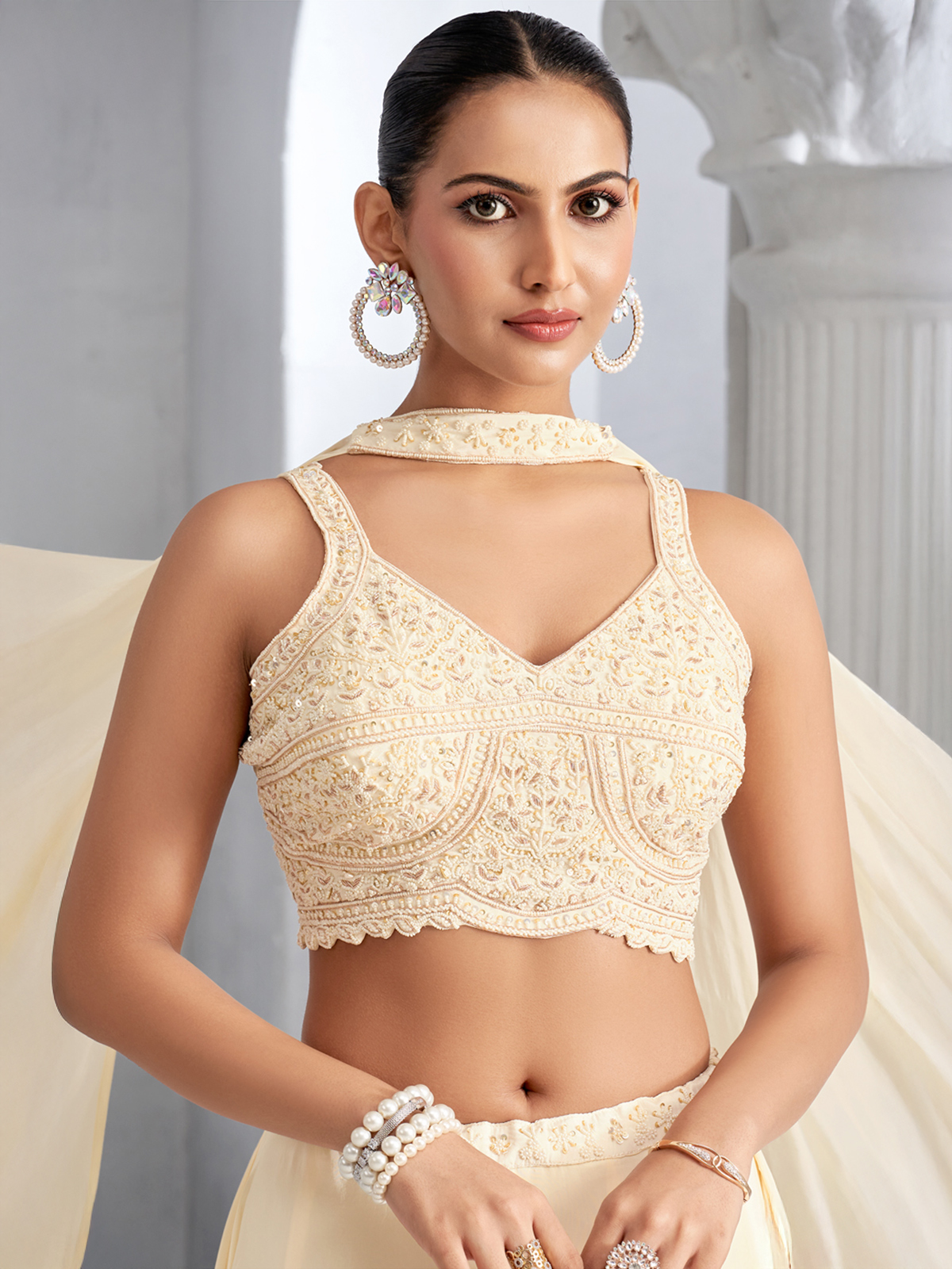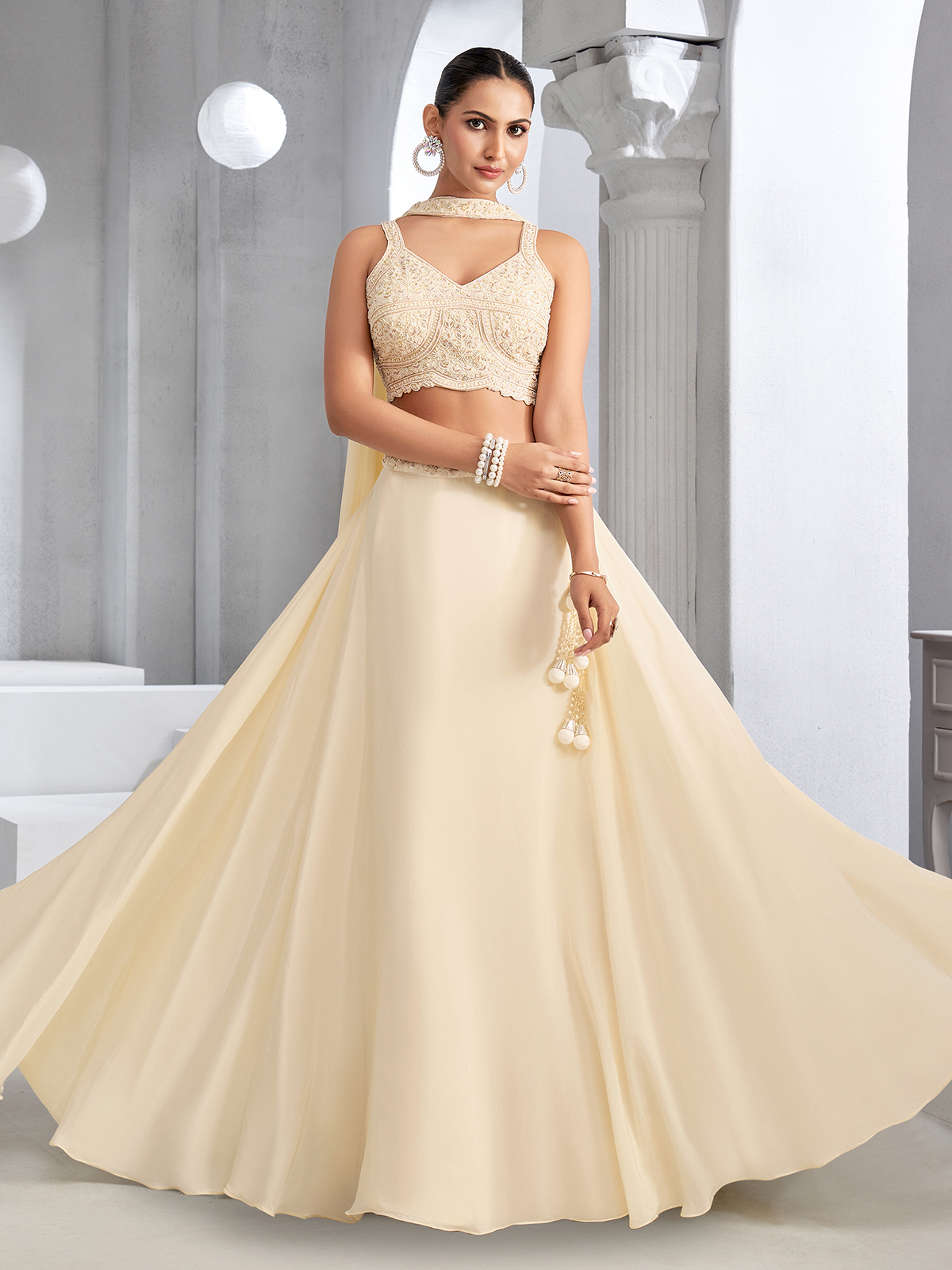 Elegant and refined, this beige crepe silk lehenga choli showcases graceful festive beauty with intricate craftsmanship. Embellished with beads, sequins, and cutdana work, it offers a soft luminous finish. The sweetheart neckline and sleeveless silhouette add feminine charm. Ideal for weddings, receptions, and sangeet celebrations, it is completed with a stylish choker dupatta for a sophisticated touch.