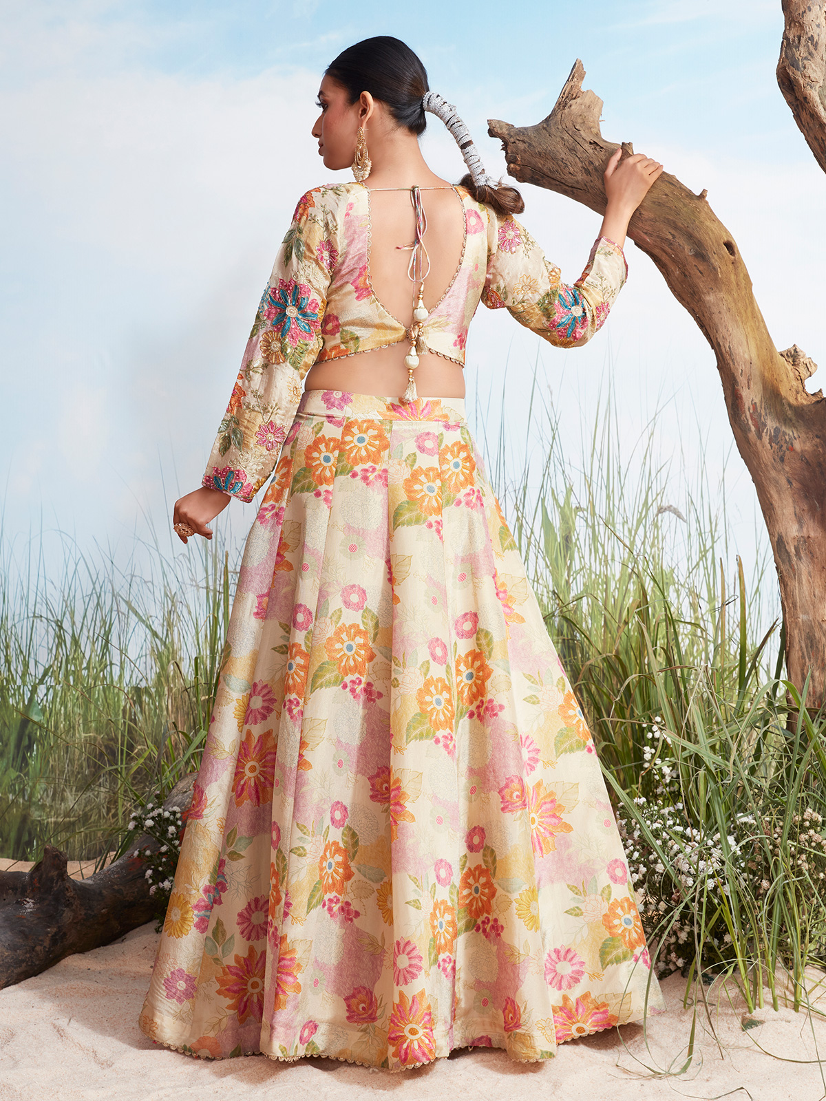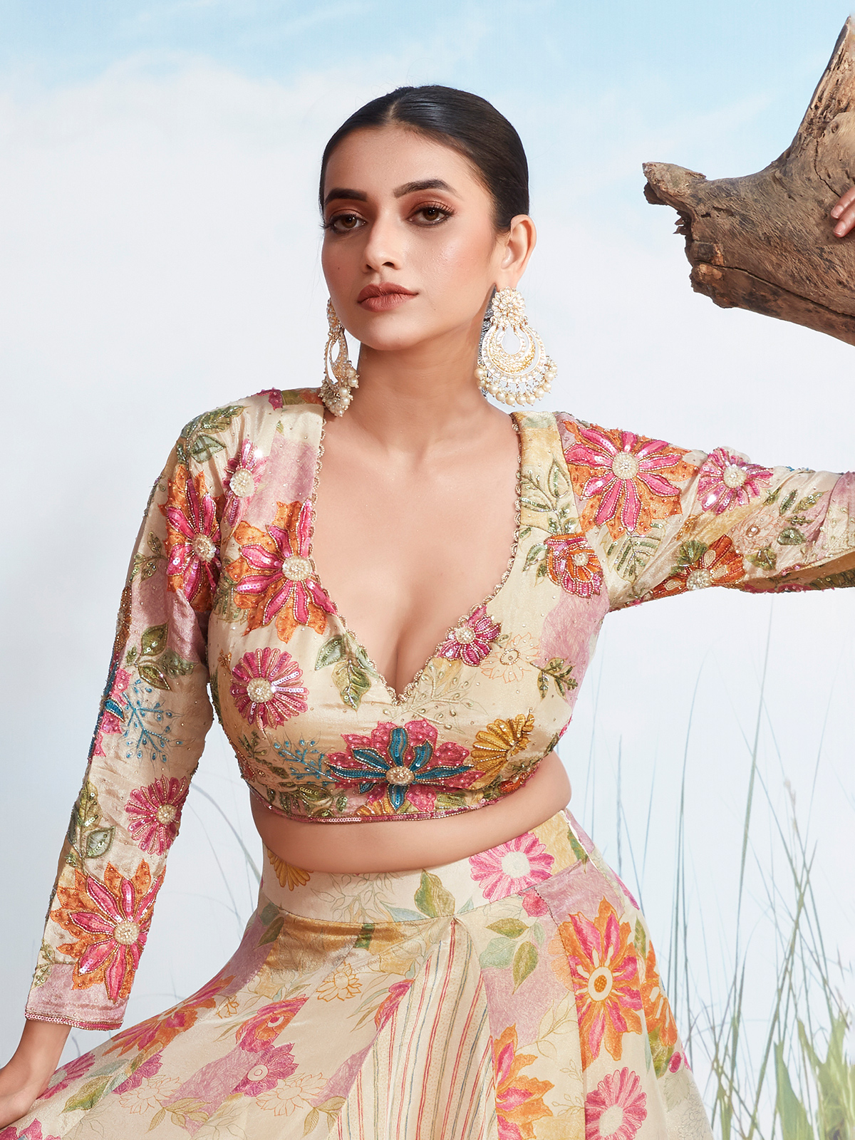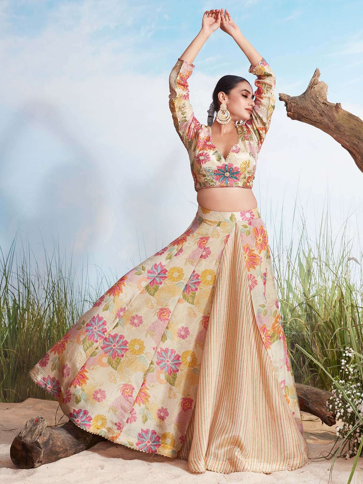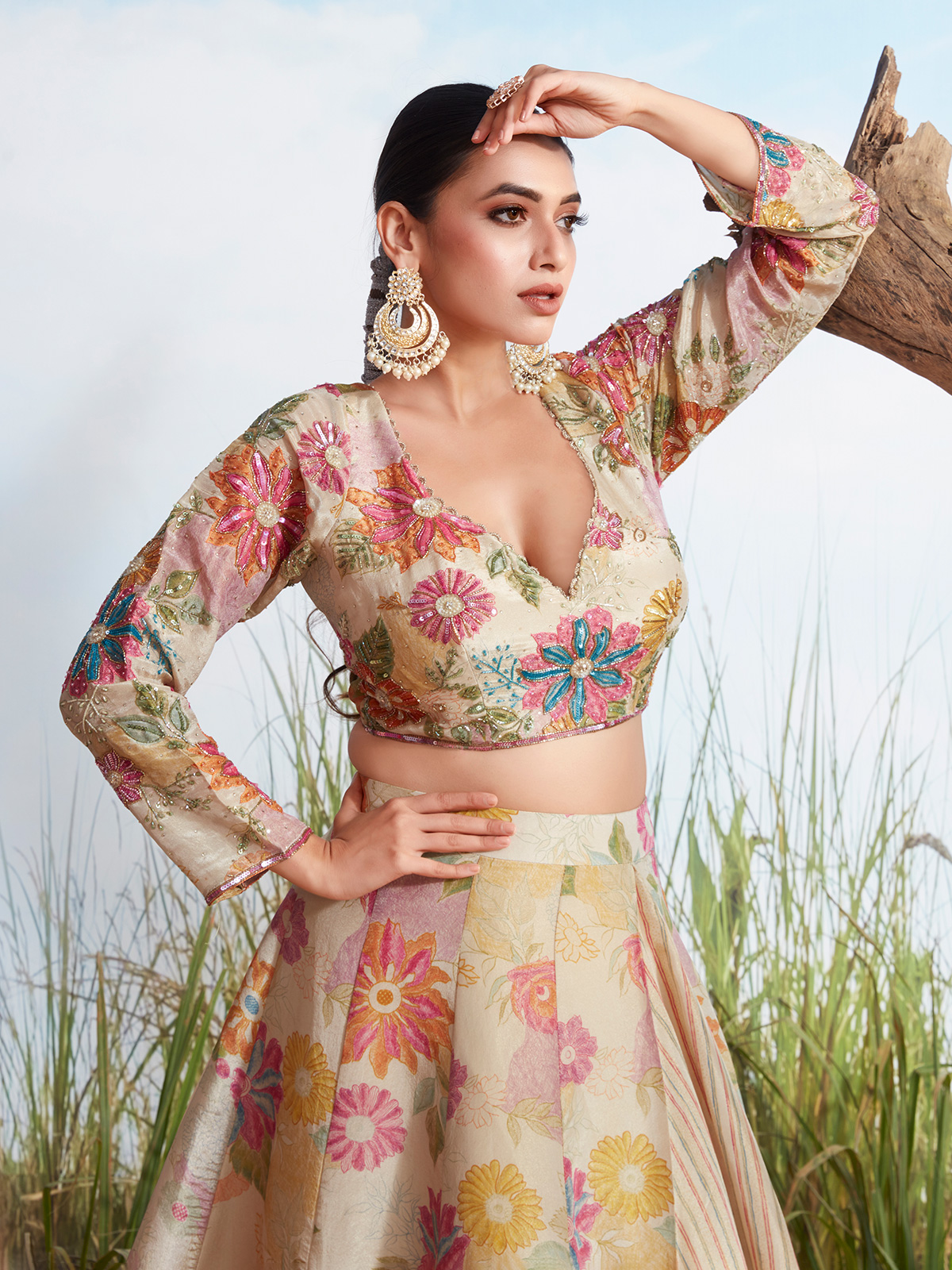 Crafted to highlight refined femininity, this beige silk printed lehenga choli offers understated luxury with festive sophistication. The sweetheart-neck choli with full sleeves is adorned with resham, sequins, cutdana, and bead embellishments, lending regal elegance. Paired with a graceful dupatta, this ensemble is ideal for weddings and grand celebrations.