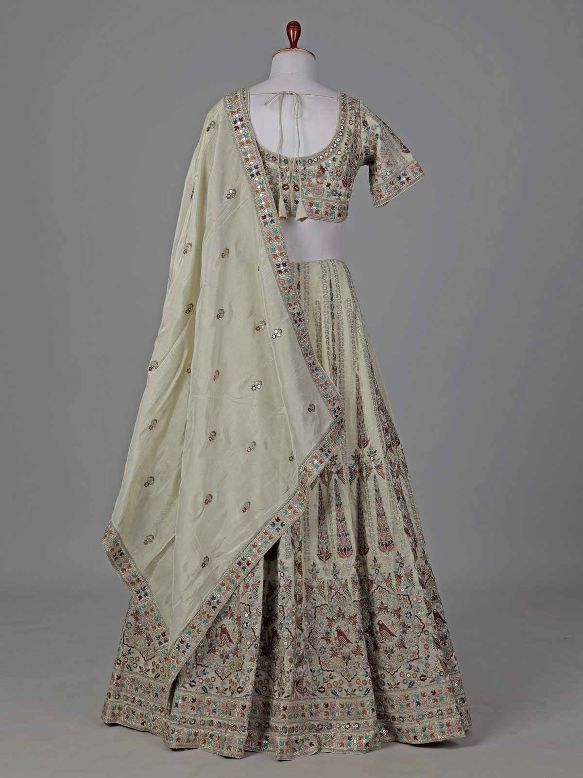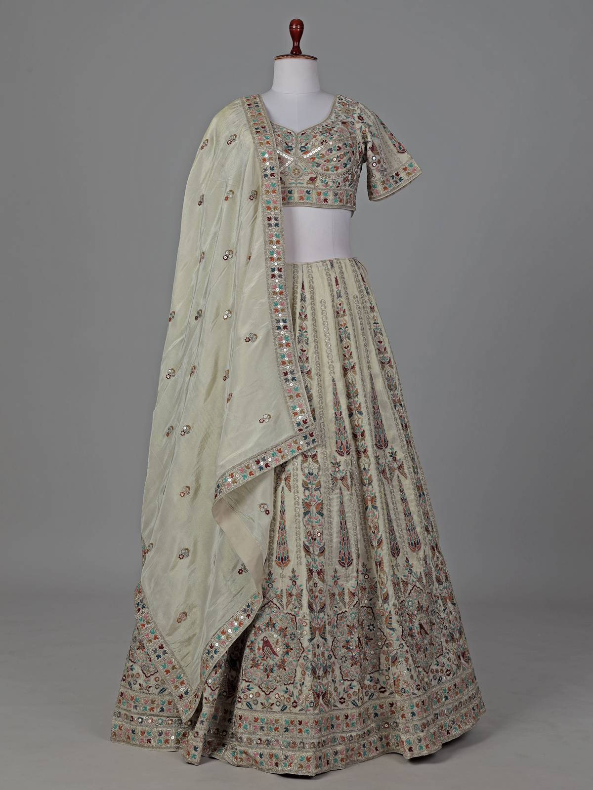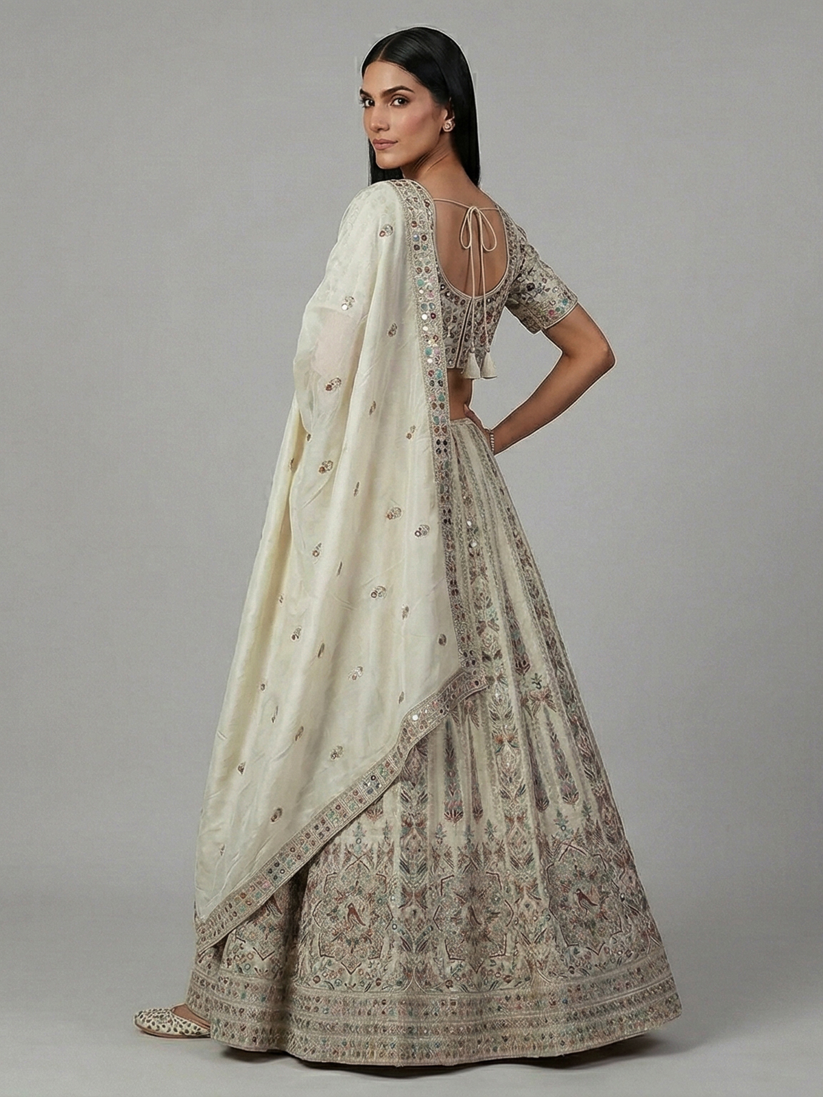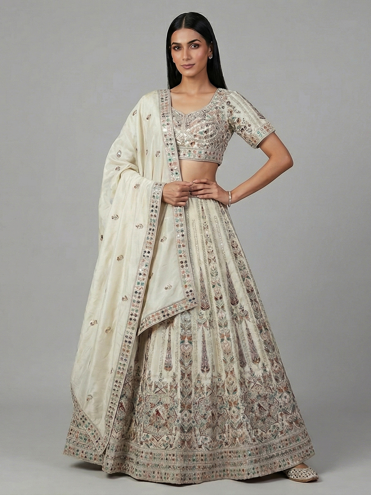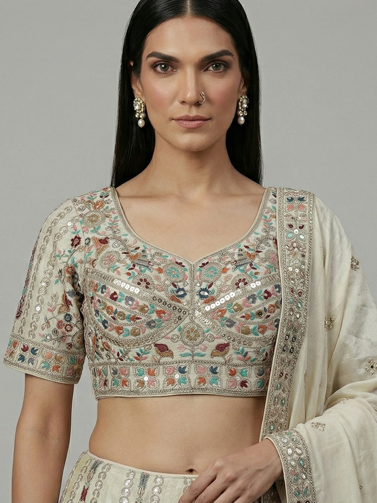 Soft beige tones highlight the grace of this silk lehenga choli. Adorned with embroidery, resham and sequin detailing. The sweetheart neckline with half sleeves adds a classic touch. Paired with a dupatta, this ensemble creates a refined and elegant look perfect for weddings, receptions and sangeet celebrations.