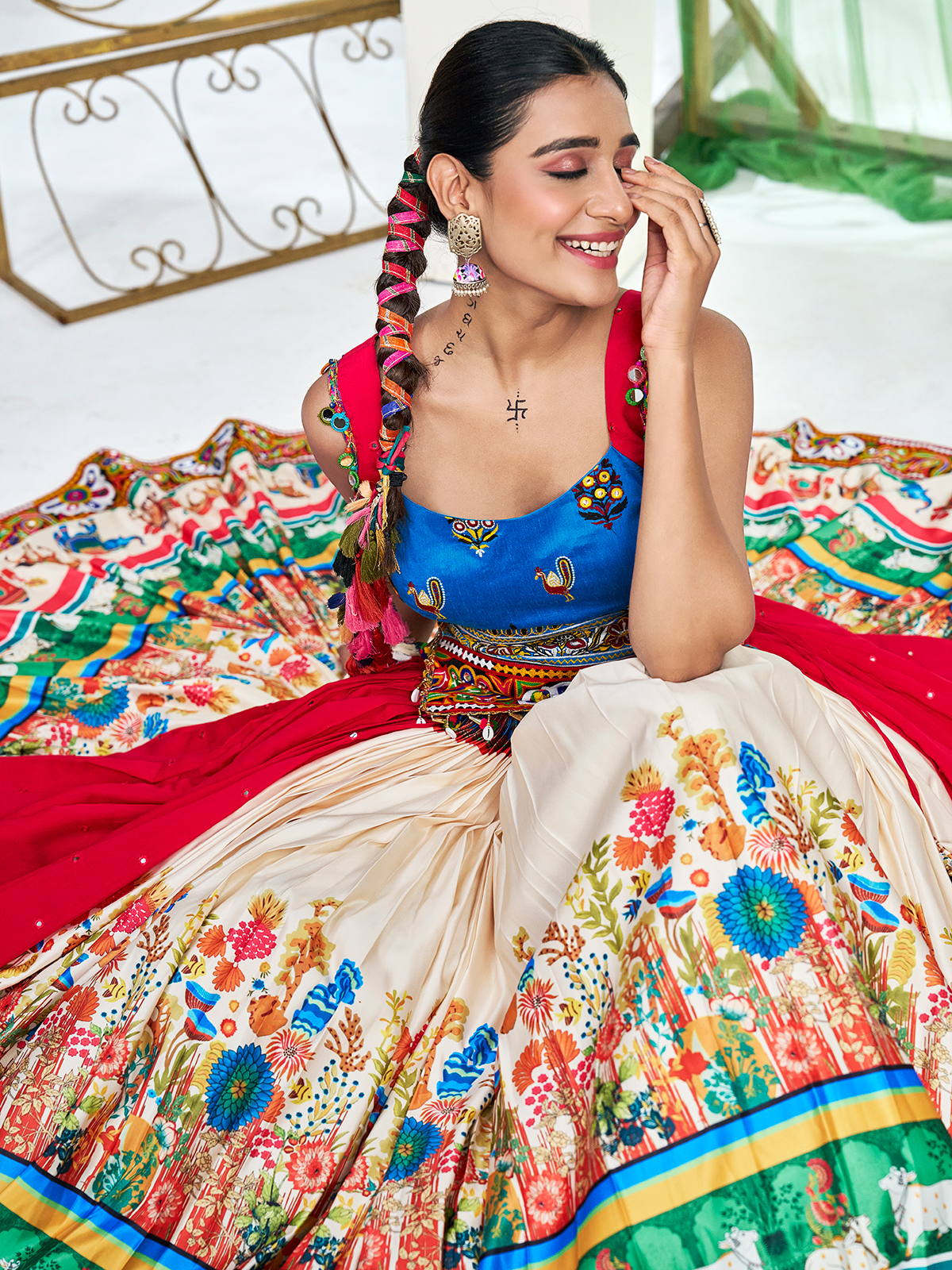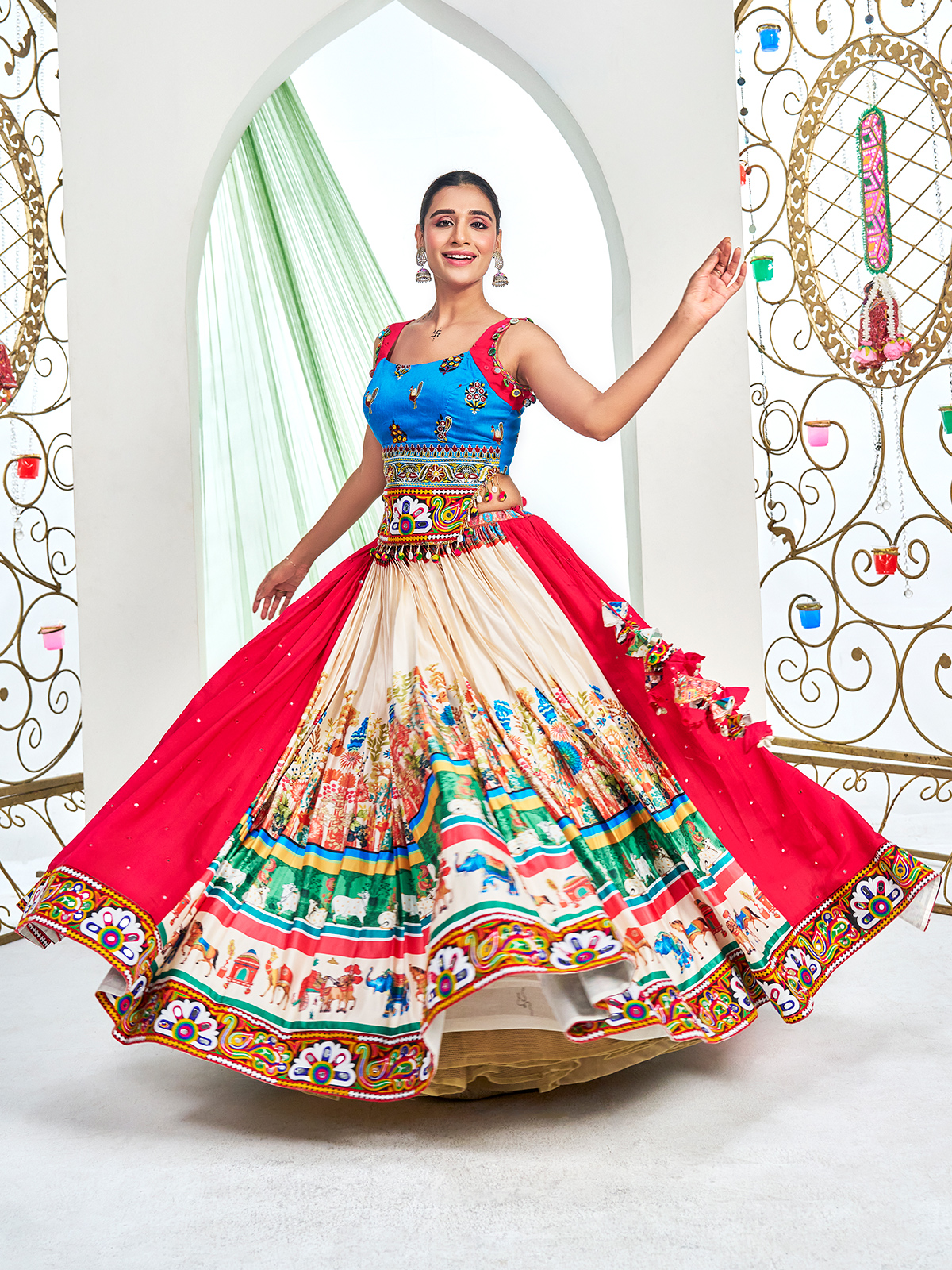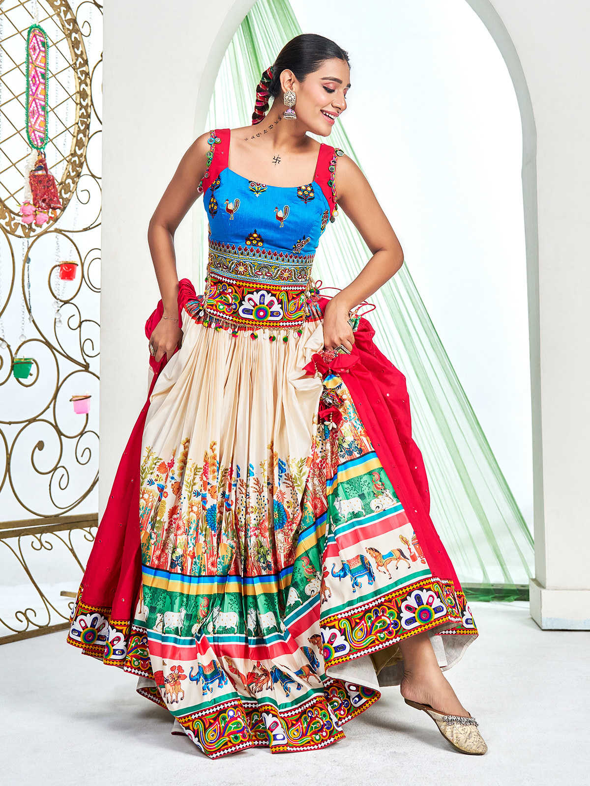 Beige Silk Navratri Lehenga Choli With Artistic Print