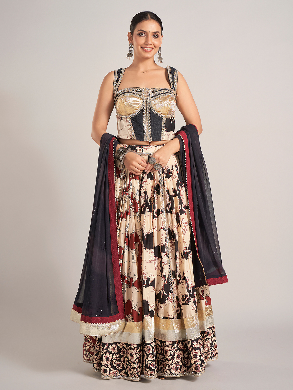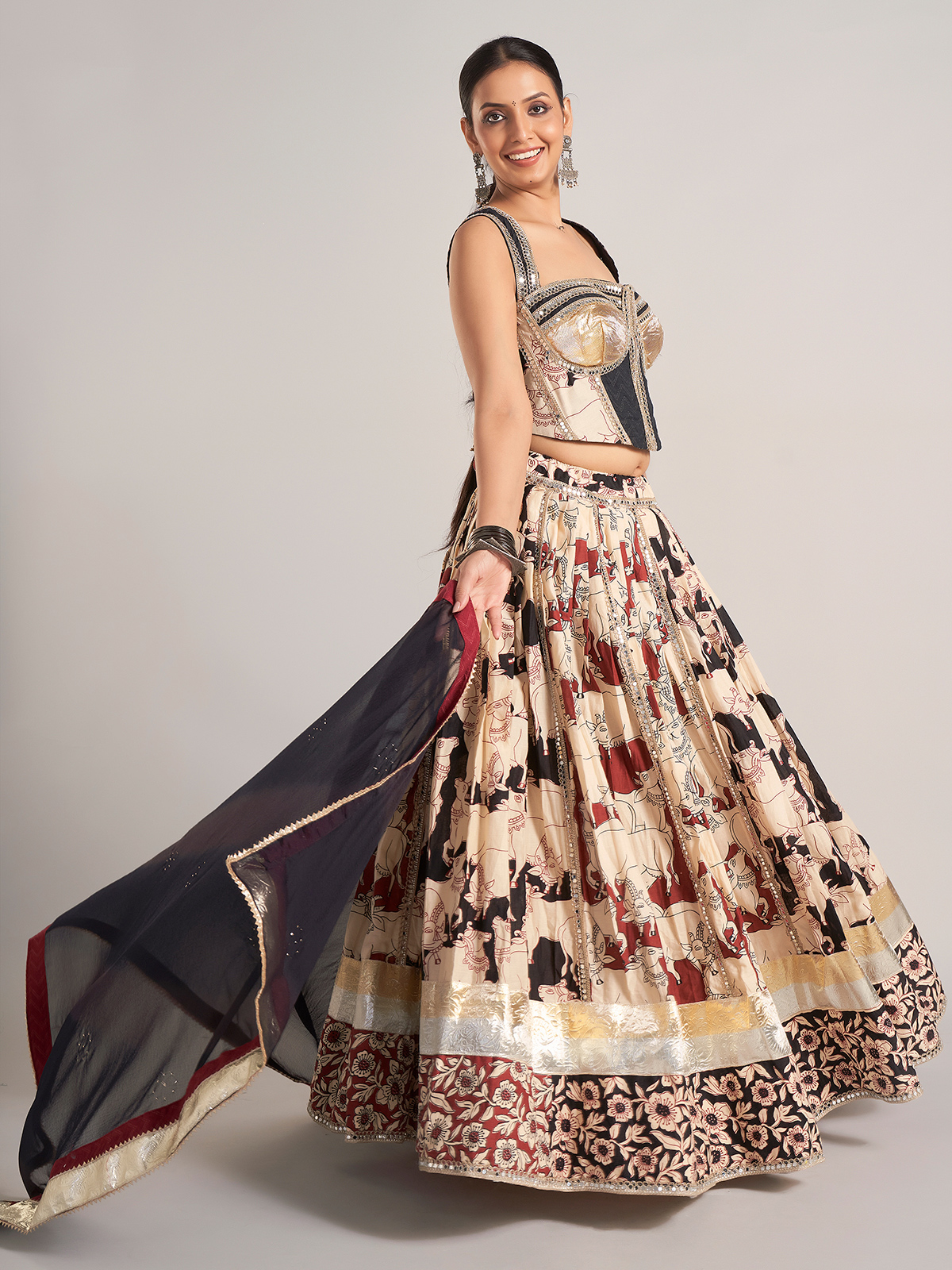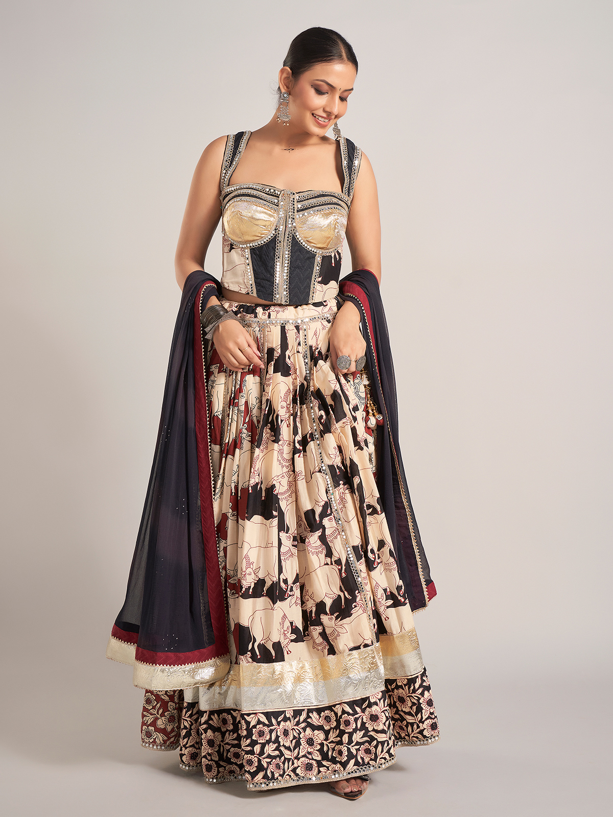 Celebrate tradition beautifully in this black and cream printed silk chaniya choli detailed with mirror, zardosi and gota accents. The sweetheart neckline and sleeveless blouse create a balanced festive look. Paired with a dupatta, it becomes an elegant choice for navratri gatherings.