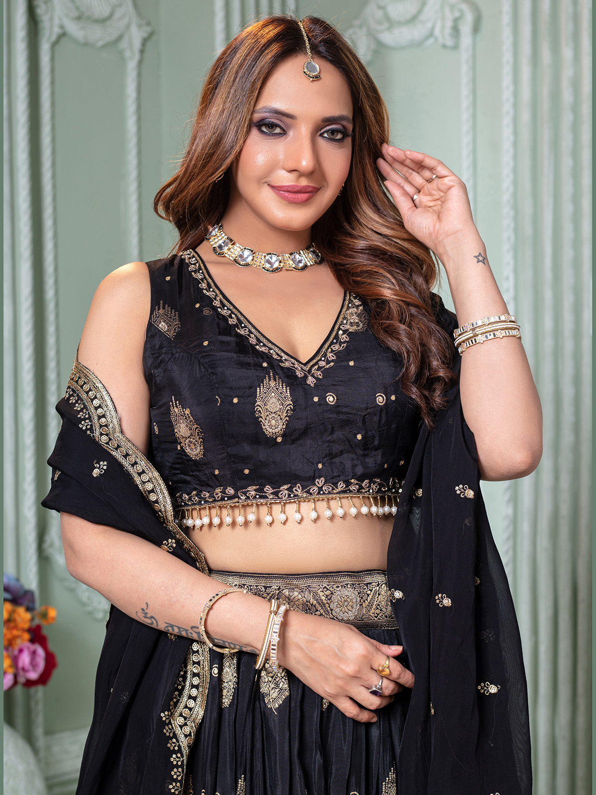 This black crepe silk lehenga choli radiates regal elegance, adorned with intricate thread, sequins, beads, zardosi, and zari work. Featuring a sleeveless V neckline and paired with a dupatta, it creates a luxurious bridal aura, perfect for weddings and festive celebrations.
