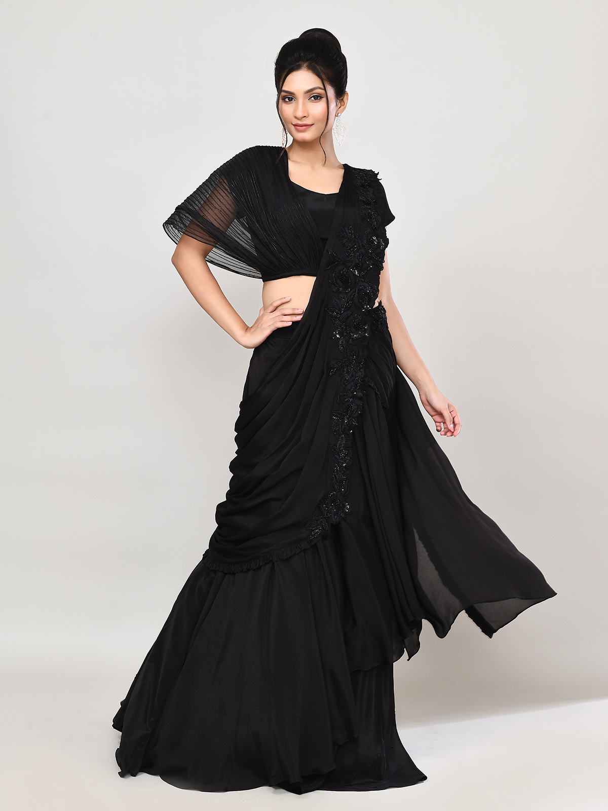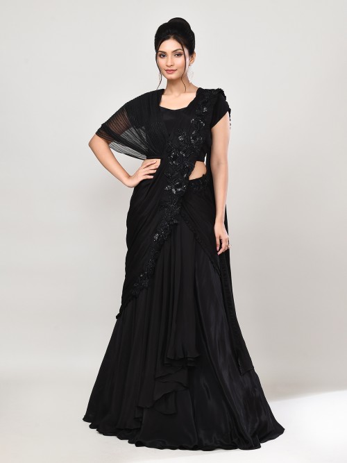 Flaunt bold sophistication in this black georgette lehenga choli. Accented with sequins, beads, and cutdana, it features a sweetheart neckline and attached dupatta. A perfect choice for receptions and parties, it blends designer artistry with contemporary glamour.