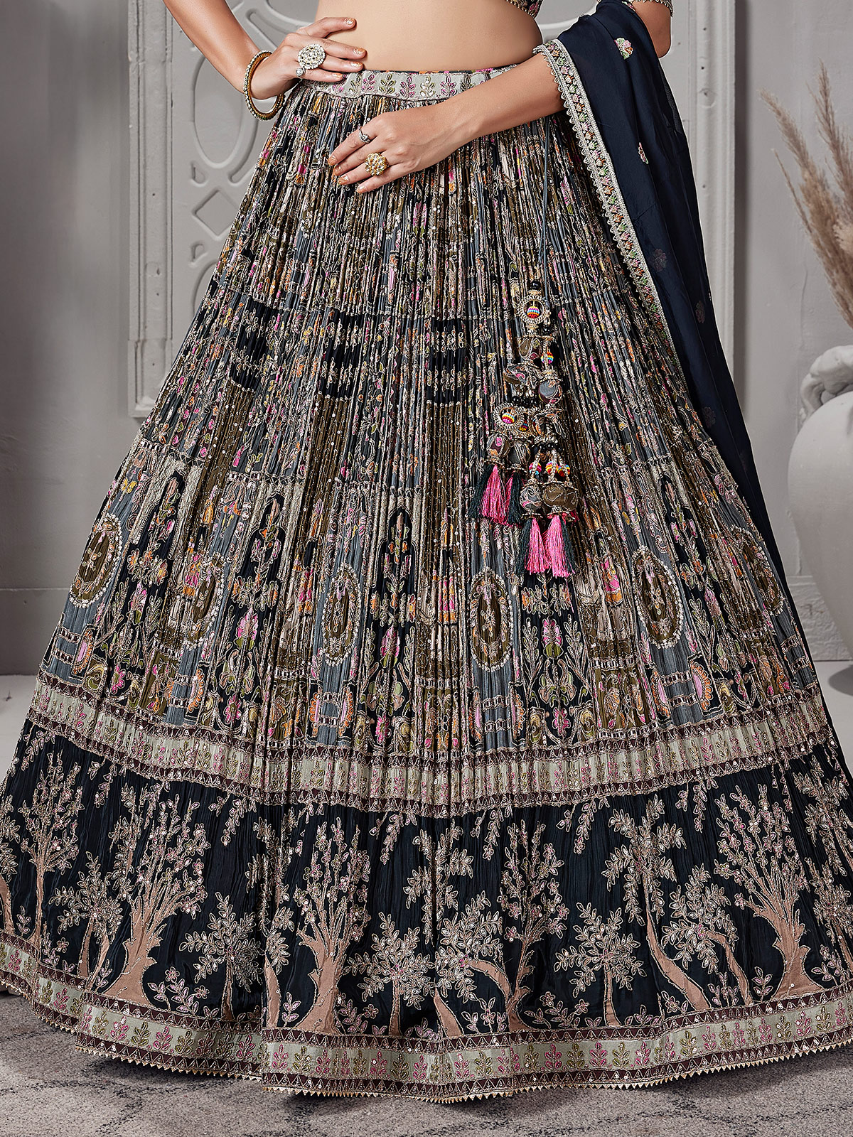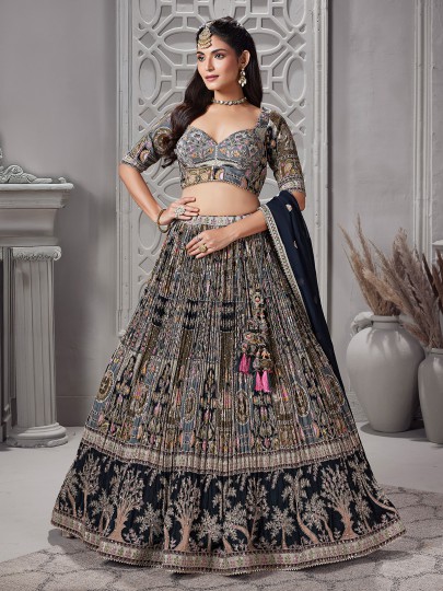 Designed in black printed silk, this lehenga choli is enhanced with resham embroidery, sequins, and gota work. Featuring a sweetheart neckline with elbow sleeves, it comes with a dupatta, creating a stylish festive look for weddings, sangeet functions, and receptions.