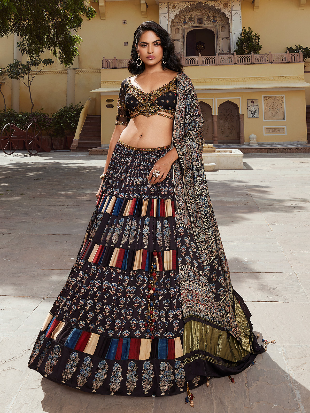 Black modal silk printed lehenga choli with sequins, resham, and zardosi work. The choli has a sweetheart neck and elbow sleeves, comes with a dupatta.