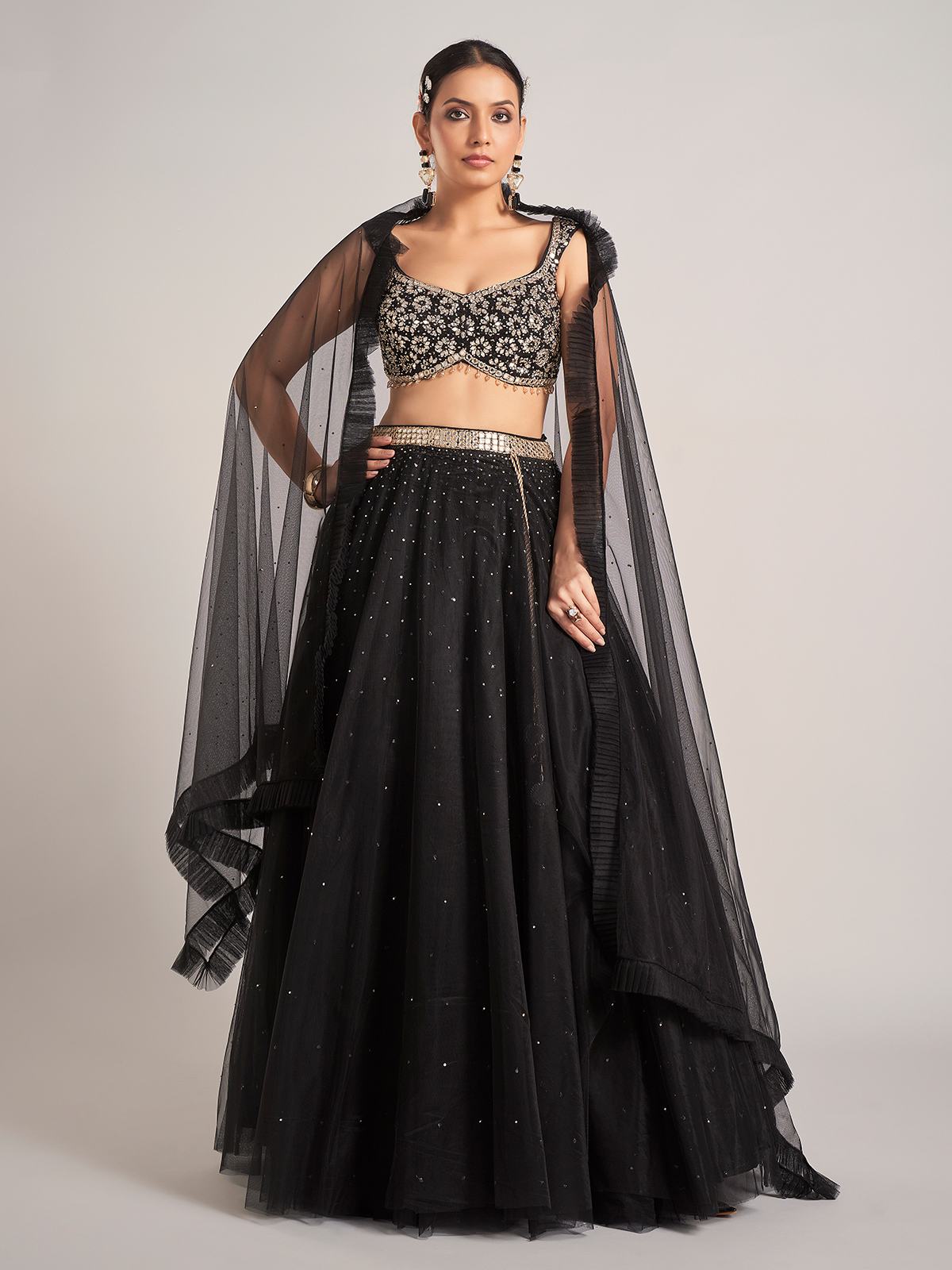 Command attention in this black net lehenga choli, sparkling with sequins, stone, and aabla embellishments. Featuring a sweetheart neckline, sleeveless silhouette, and dupatta, it creates a bold and glamorous look for weddings, receptions, and evening celebrations.