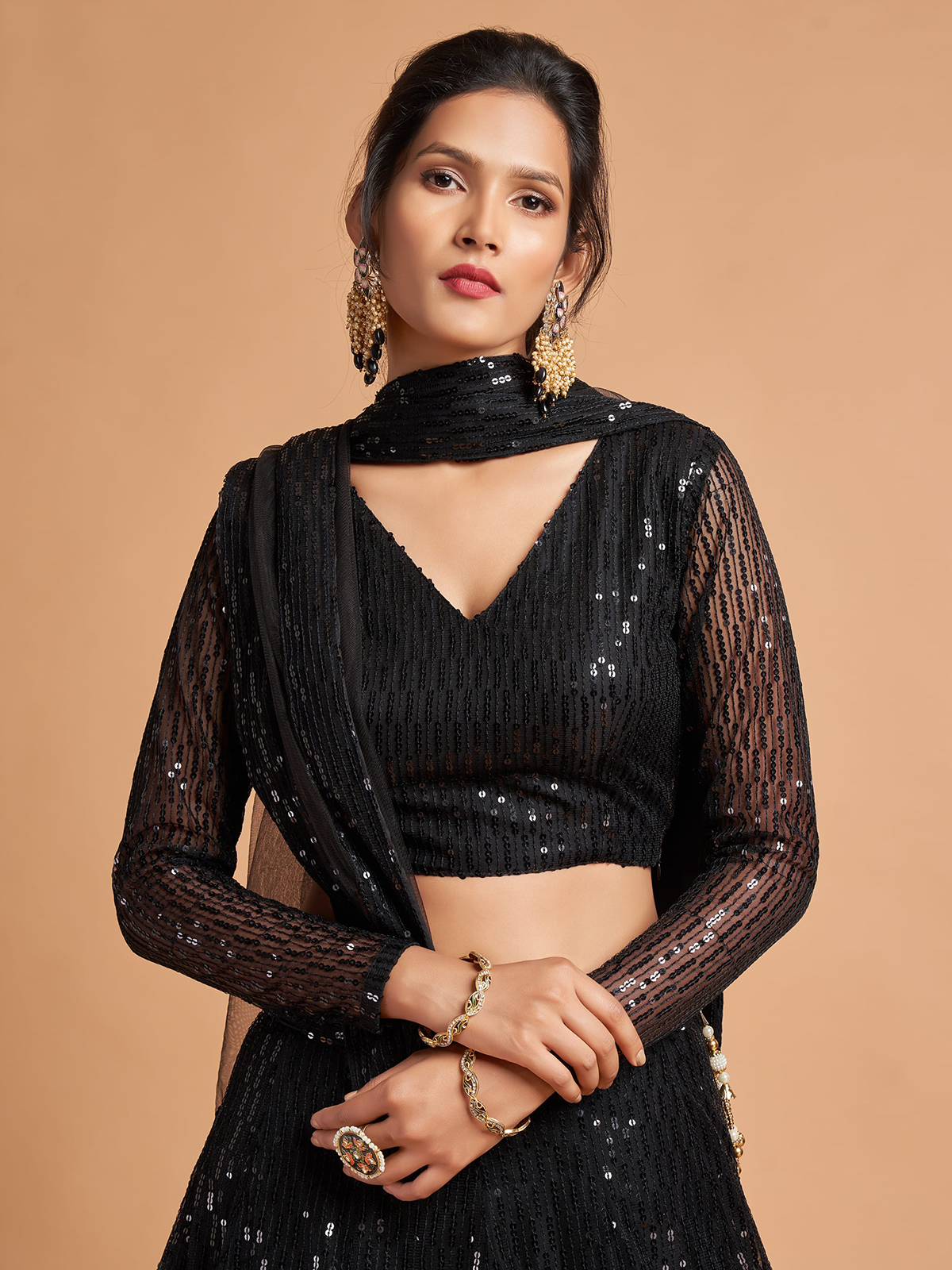 Step into festive glamour with this stylish black net unstitched lehenga choli designed for elegant occasions. The ensemble features shimmering sequin embellishments that add a touch of sparkle and festive charm. Paired with a net dupatta, it is perfect for wedding celebrations and reception parties.