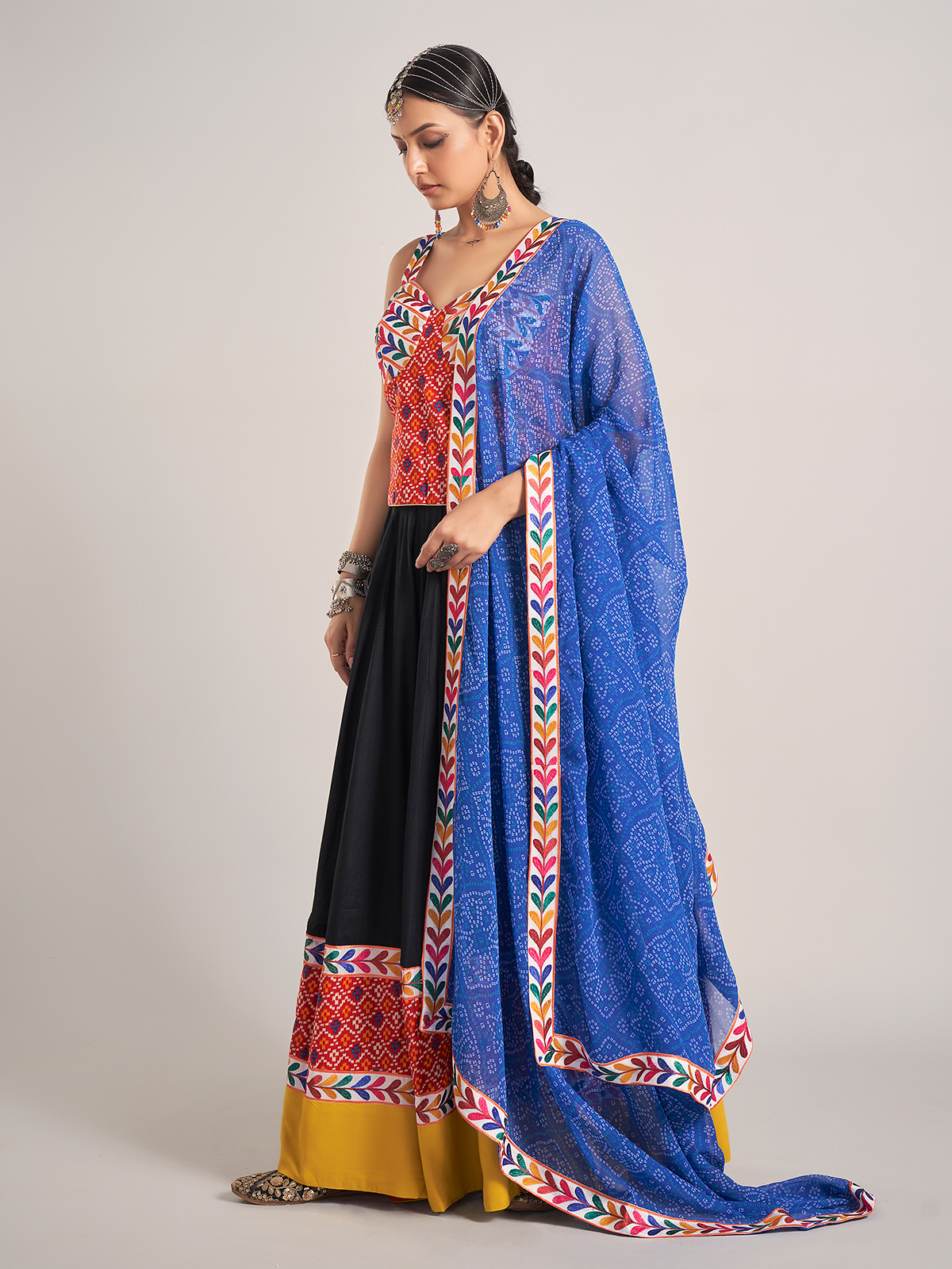 Make a bold statement in this black printed silk chaniya choli adorned with elegant embroidery work. The sweetheart neckline, sleeveless cut, and dupatta make it an ideal pick for dancing through Navratri nights.