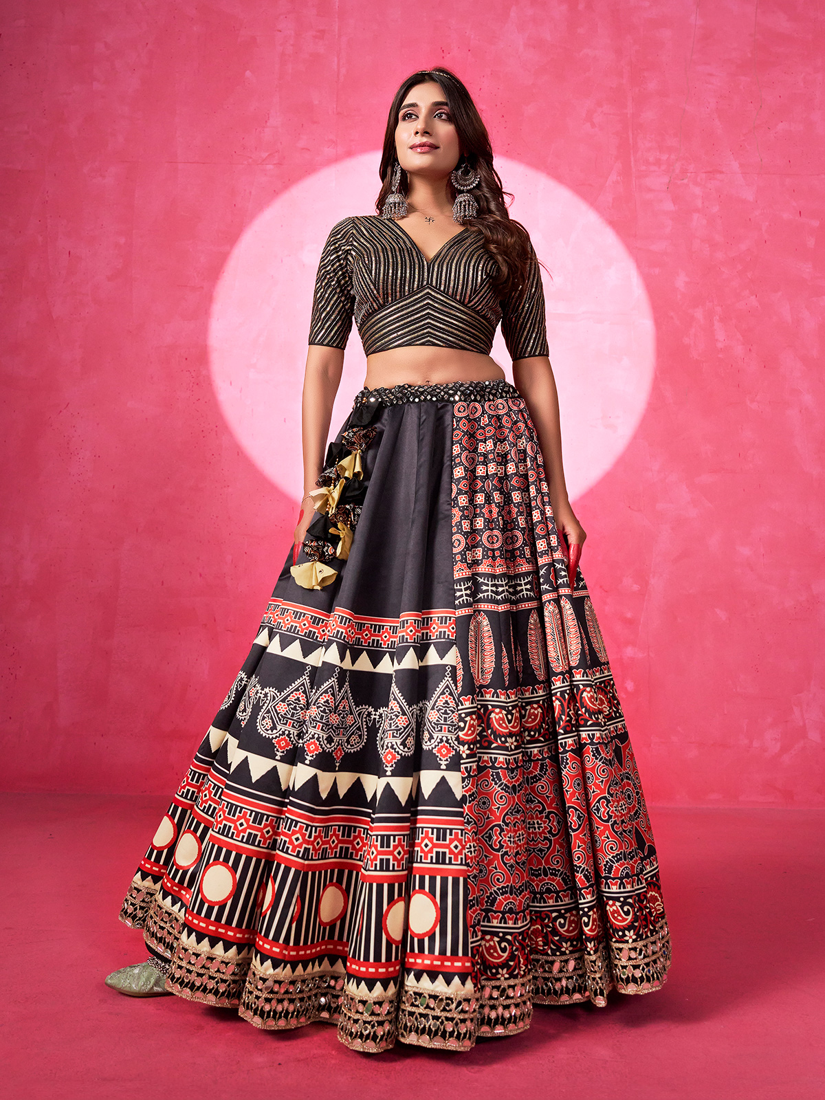 Black Printed Silk Navratri Lehenga Choli With Aabla And Resham