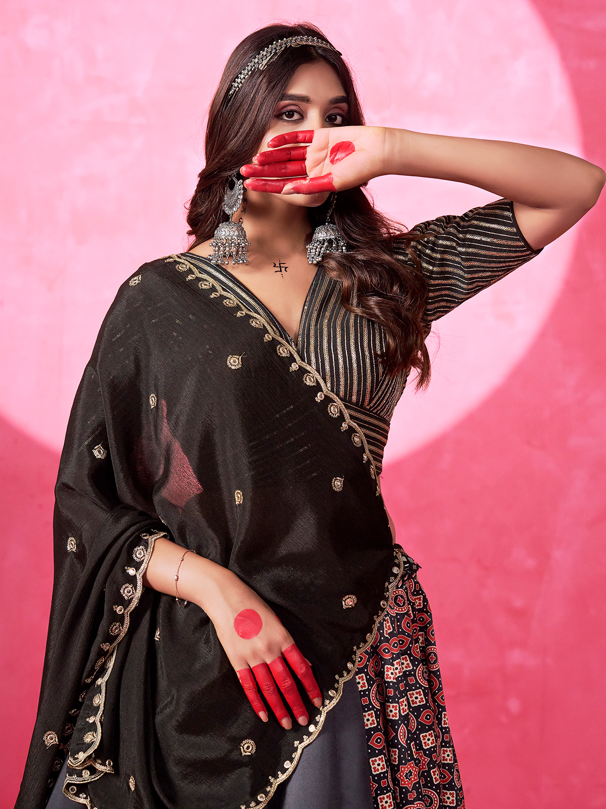 Crafted in black printed silk, this lehenga choli radiates Navratri charm with intricate aabla, resham and sequins work. The V-neckline and elbow sleeves of the choli bring refined balance between tradition and grace. Perfect for Garba nights, it glimmers under festive lights celebrating rhythmic elegance and cultural artistry.