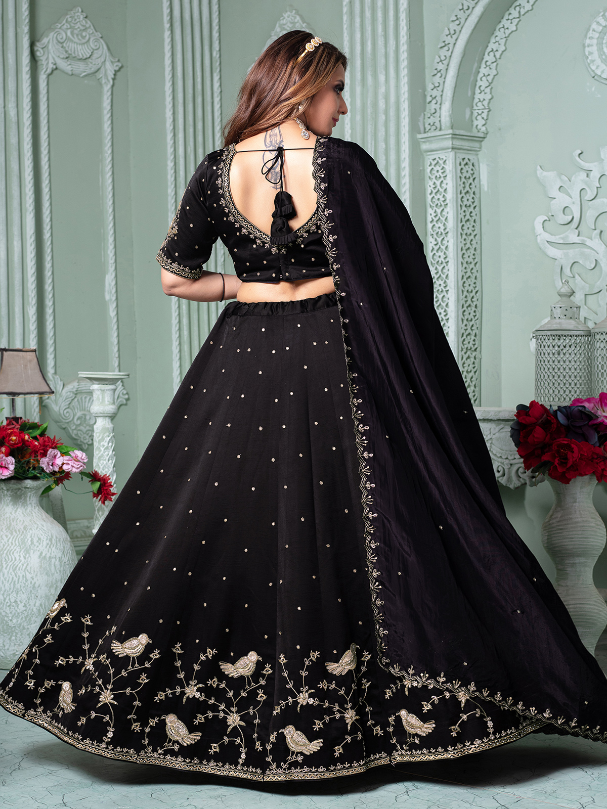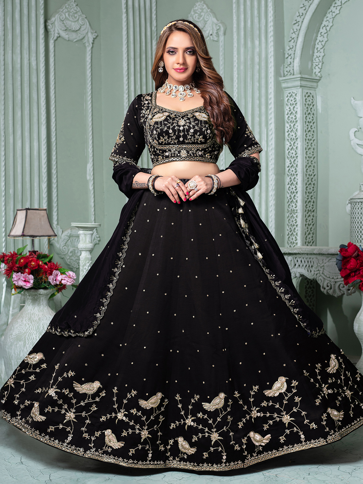 Luxurious black raw silk lehenga choli adorned with cutdana, sequins, beads, resham, and zardosi work. Featuring a sweetheart neckline with elbow sleeves and paired with a dupatta, it embodies regal sophistication for weddings and receptions.
