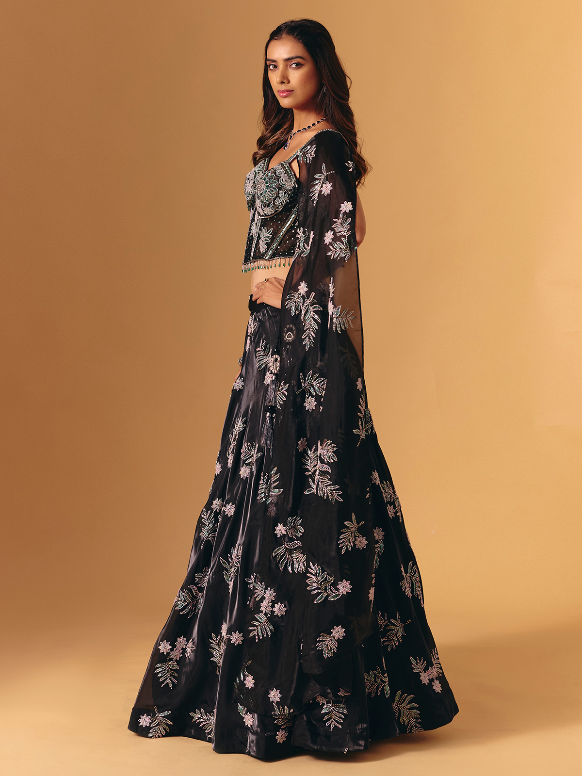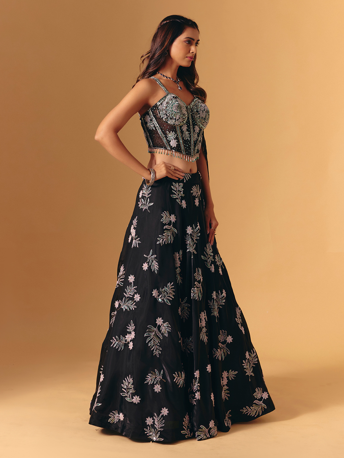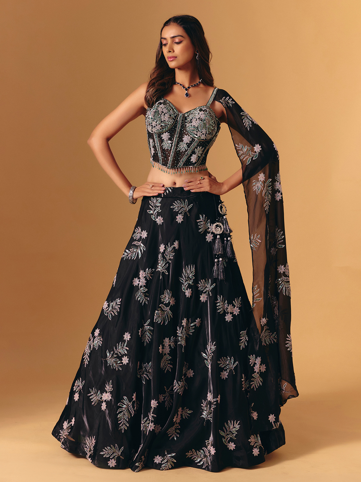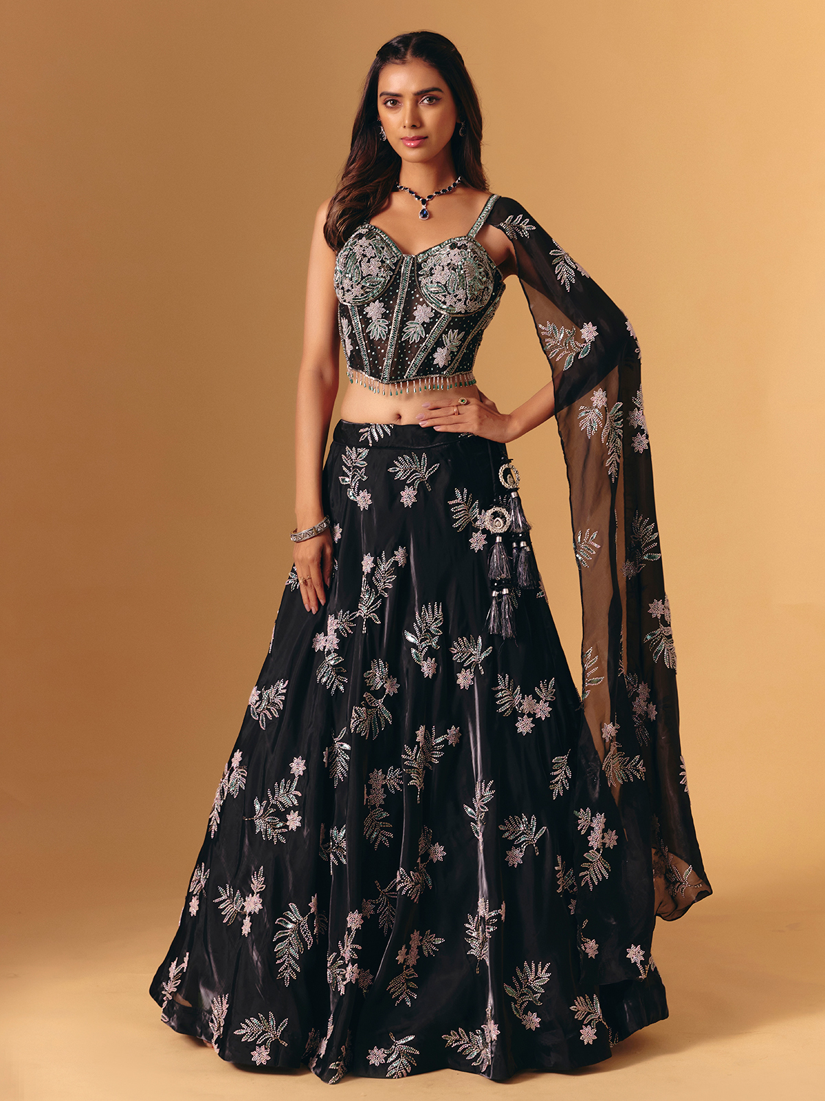 Sculpted in black silk, this lehenga shines with cutdana, sequins and beads. The sleeveless blouse and dupatta complete the ensemble—perfect for glamorous receptions and sangeet nights.