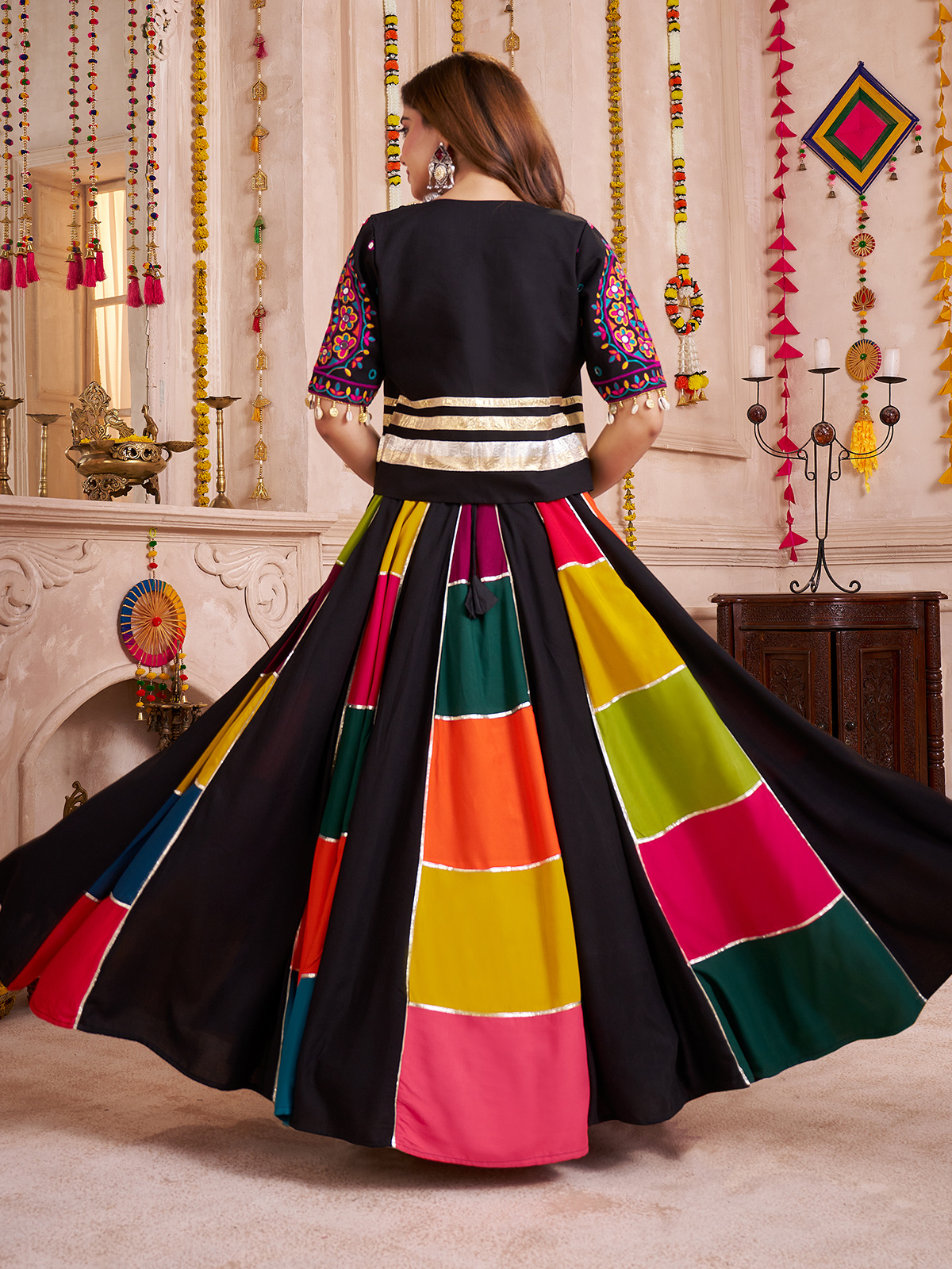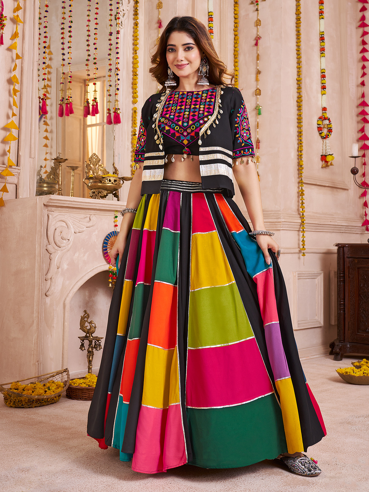 Turn heads in this black viscose cotton chaniya choli, paired with a stylish jacket. Adorned with mirror, thread, cowrie shell and bead work, it blends tradition with modern design. A perfect festive choice, it offers a bold, fashionable and attractive look for navratri celebrations.