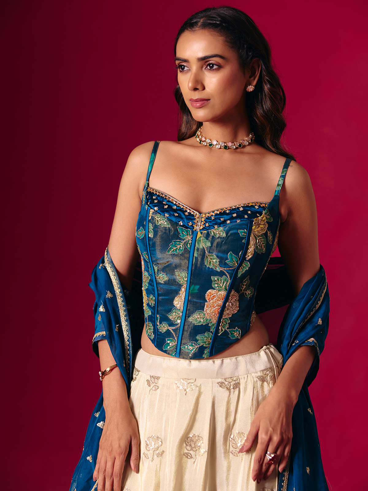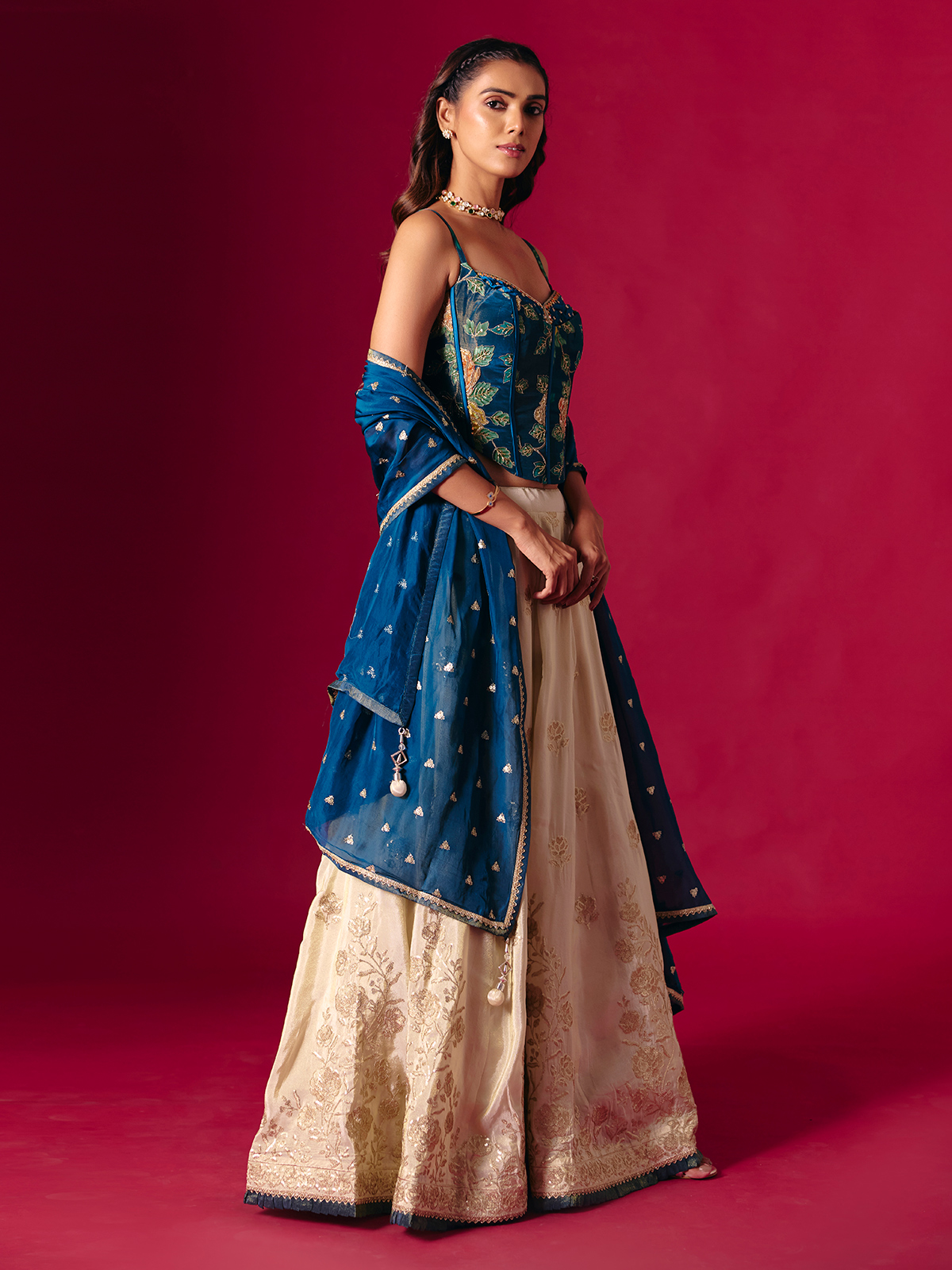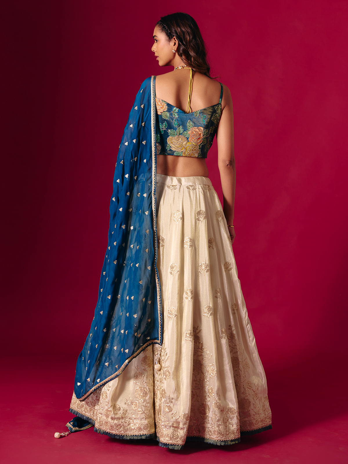 A silk dream woven in blue and cream lehenga choli. Embroidered with sequins, cutdana and aabla work. The dupatta adds flow and finesse, making this sweetheart neck ensemble perfect for weddings and receptions that call for understated luxury and timeless allure.