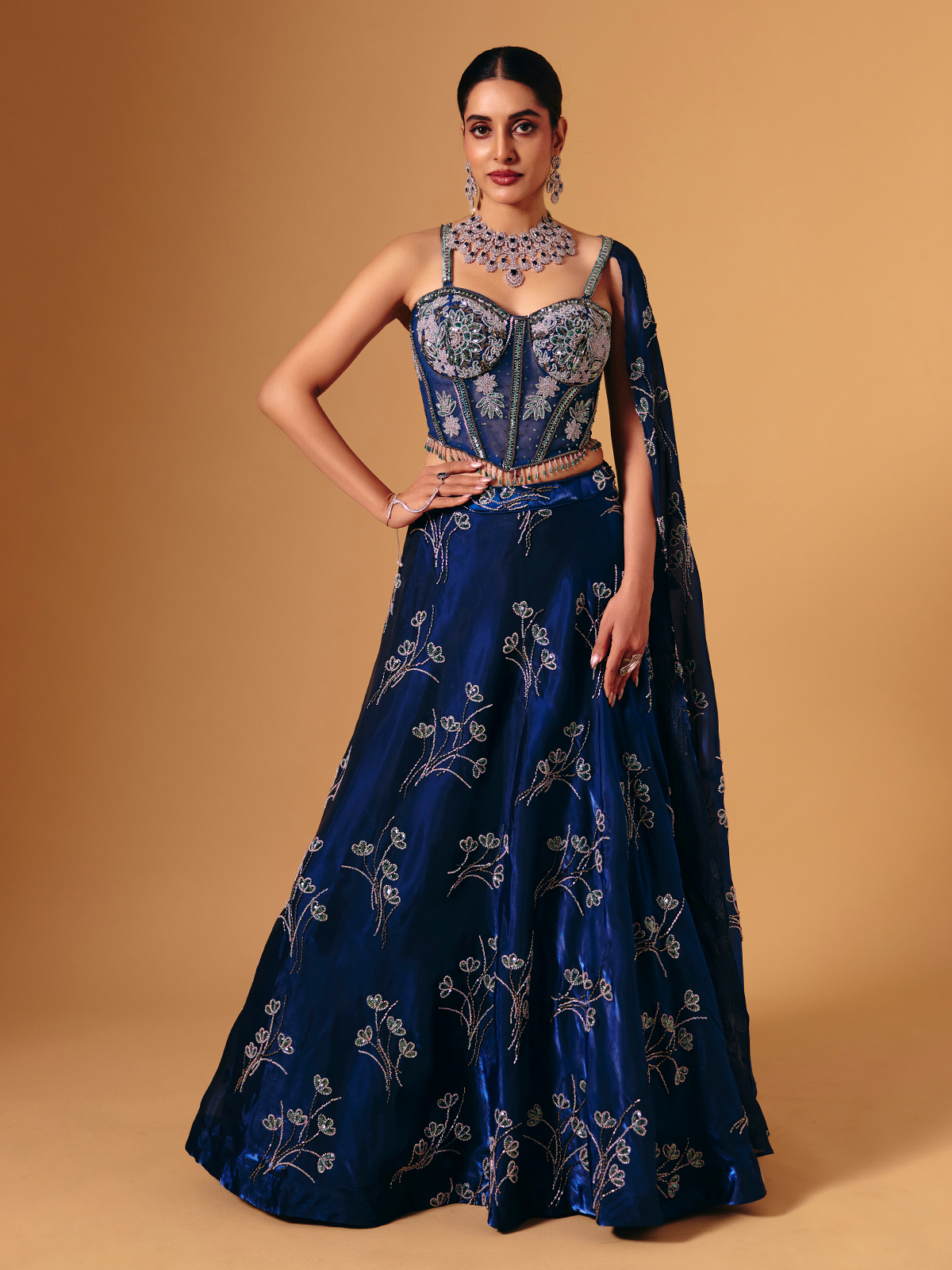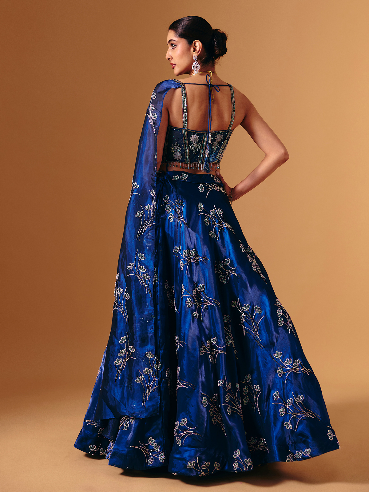 Crafted in luxurious blue tissue satin silk, this lehenga choli is detailed with shimmering cutdana, sequins, beads and stone embellishments. The sleeveless sweetheart neckline choli paired with a designer dupatta lends a glamorous appeal, making it suitable for weddings, receptions, sangeet and party wear events.