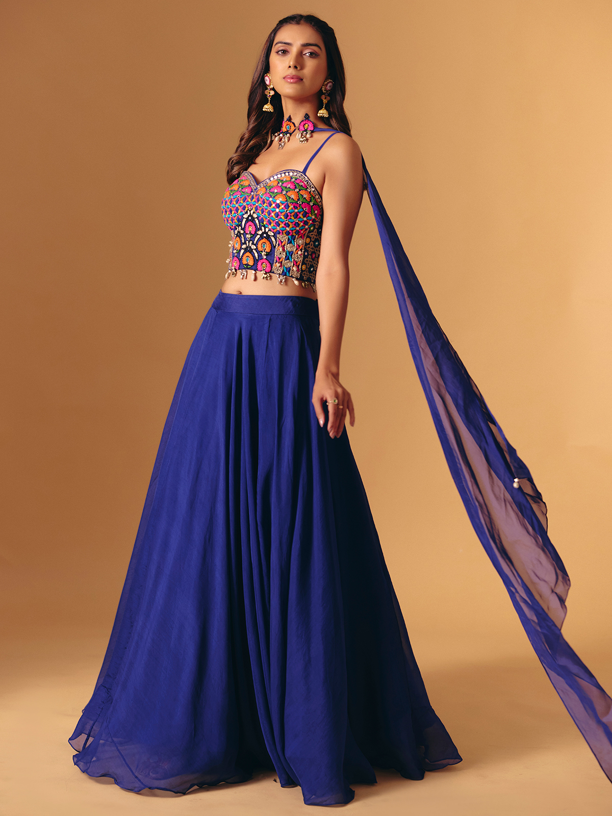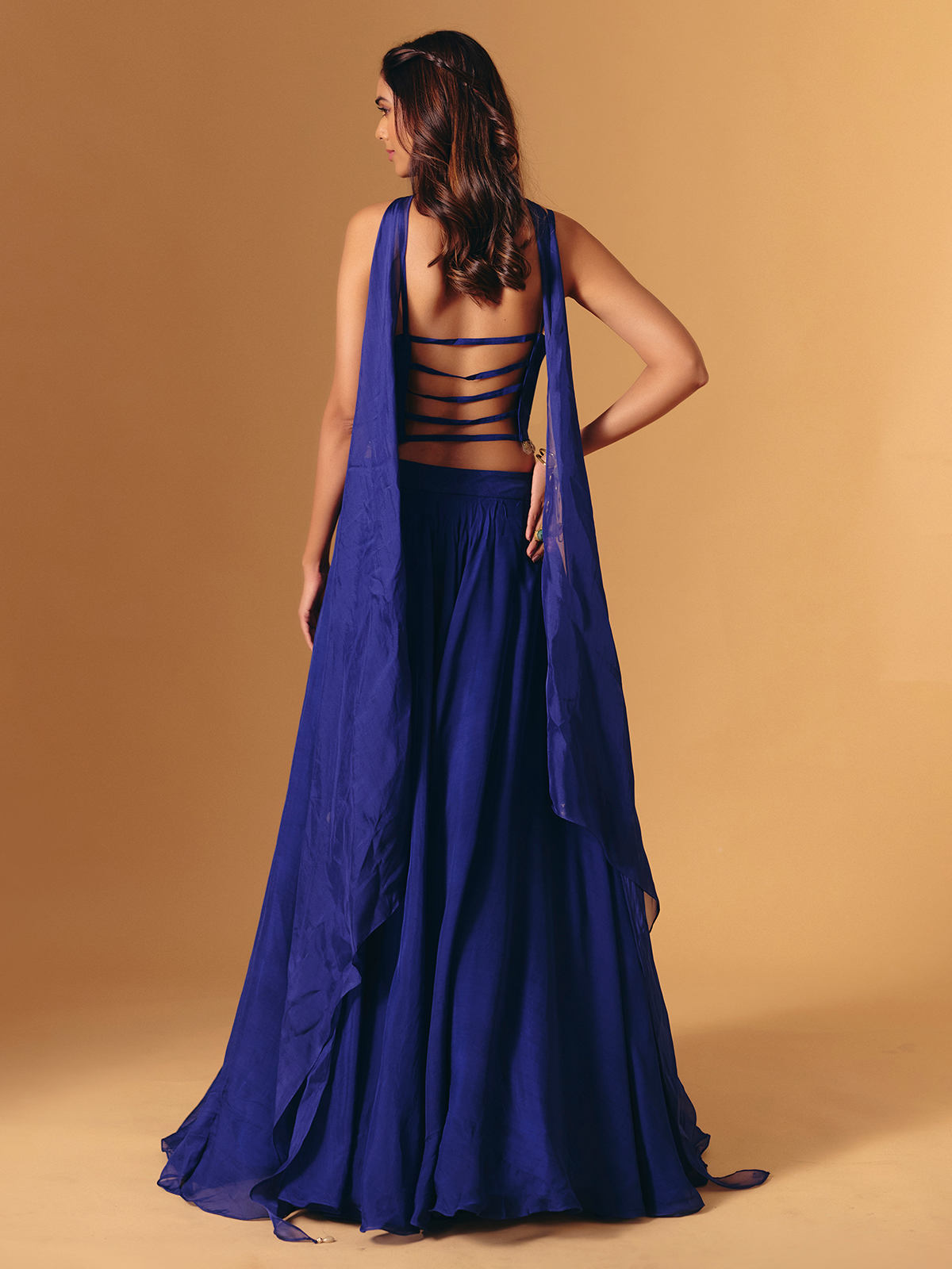 Enchant in blue soft georgette adorned with thread, mirror, cutdana, zardosi, cowrie shells and pearls work. The sweetheart neckline and sleeveless blouse with dupatta evoke coastal charm for weddings, receptions and sangeet nights.