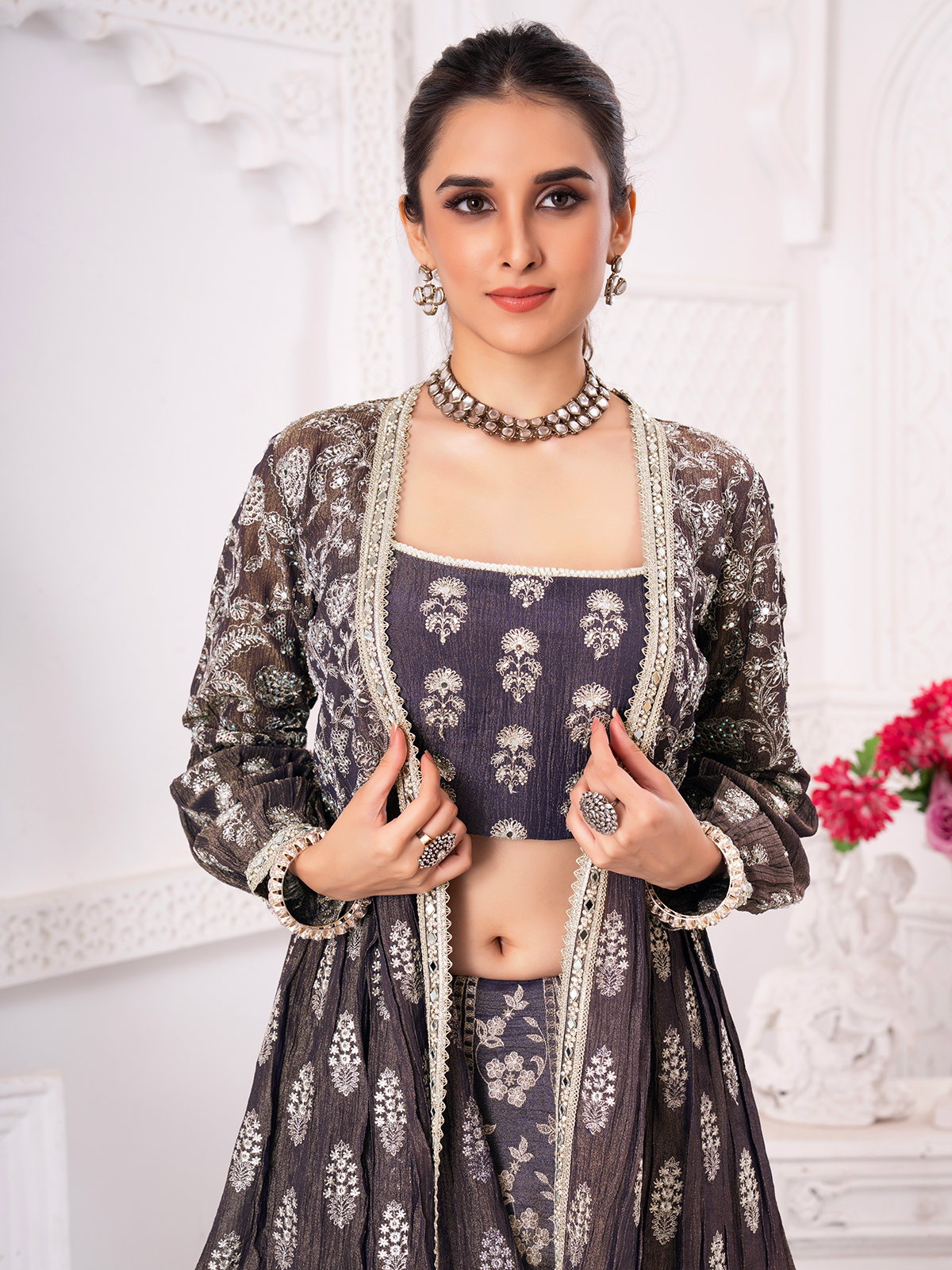 Make a grand statement in this blue silk jacket-style lehenga choli, detailed with exquisite zari, mirror, beads, stones, cutdana, and sequins work. Paired with a ready-made blouse, perfect for elegant festive and wedding occasions.